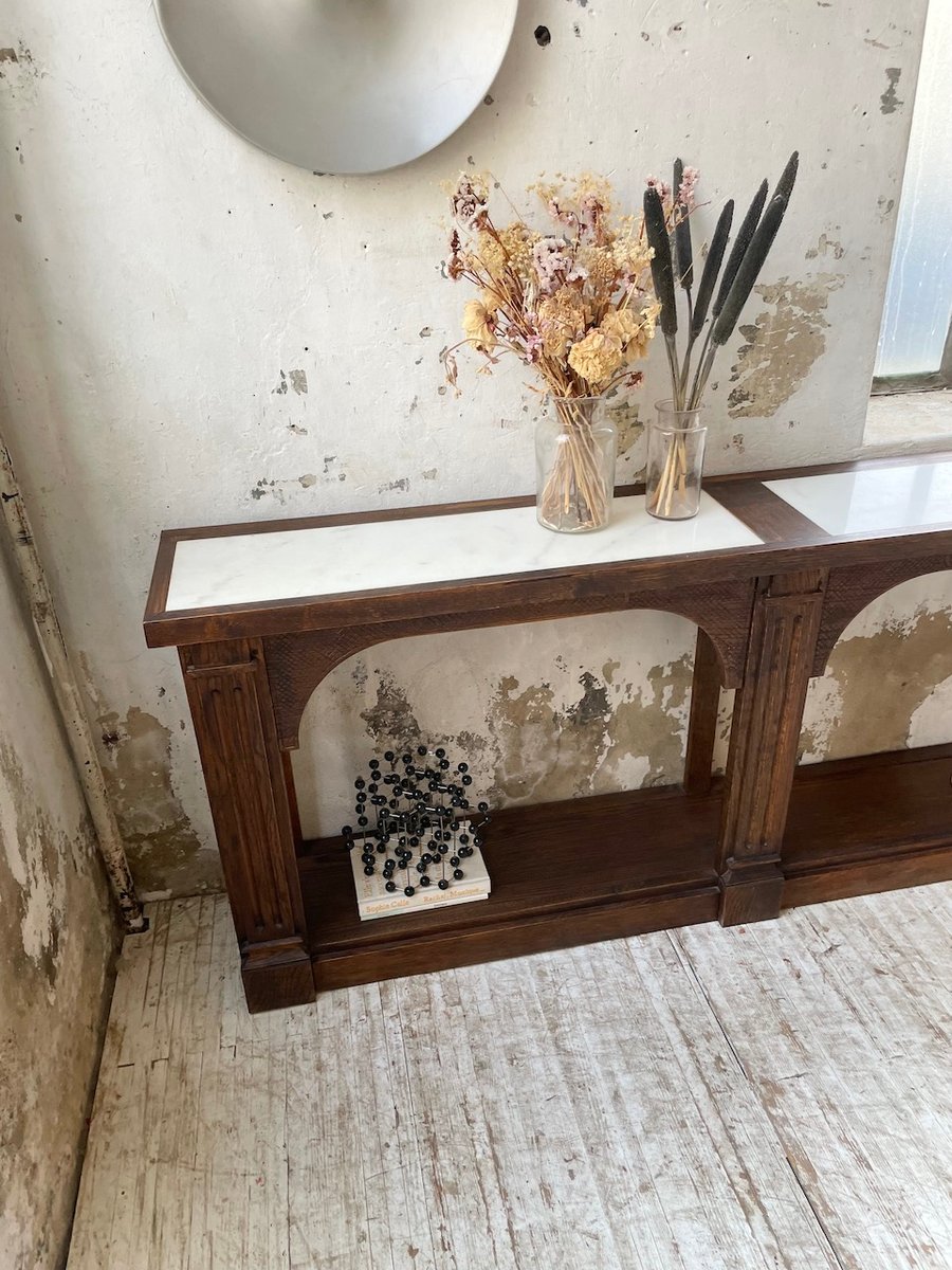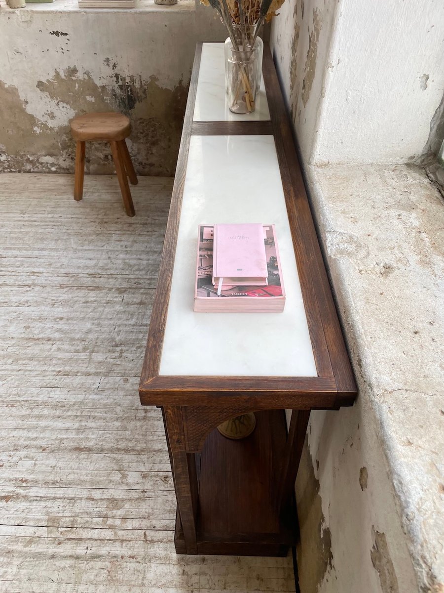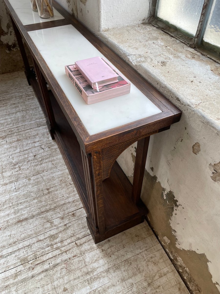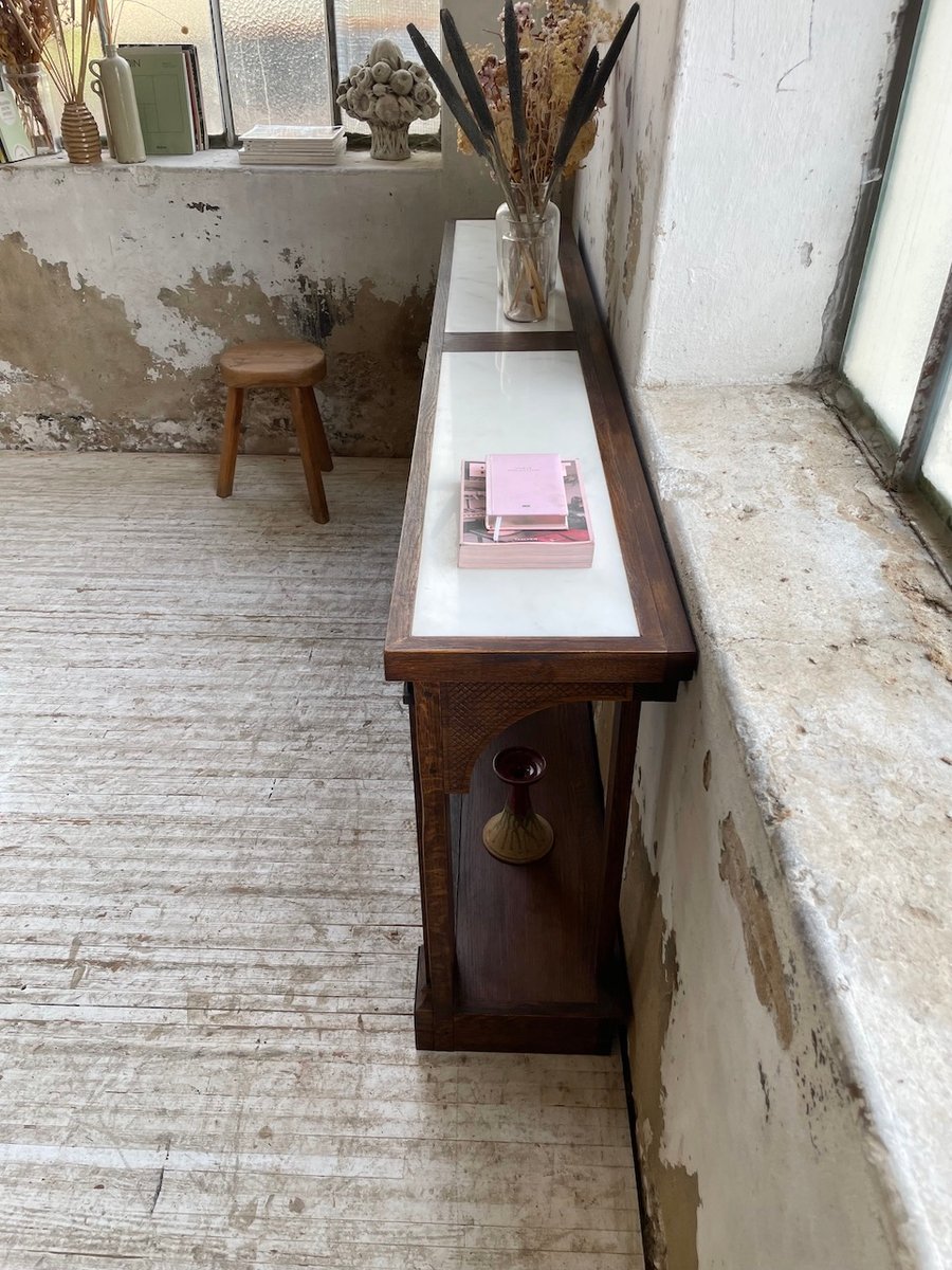 Antique oak console table with two integrated white marble tops.