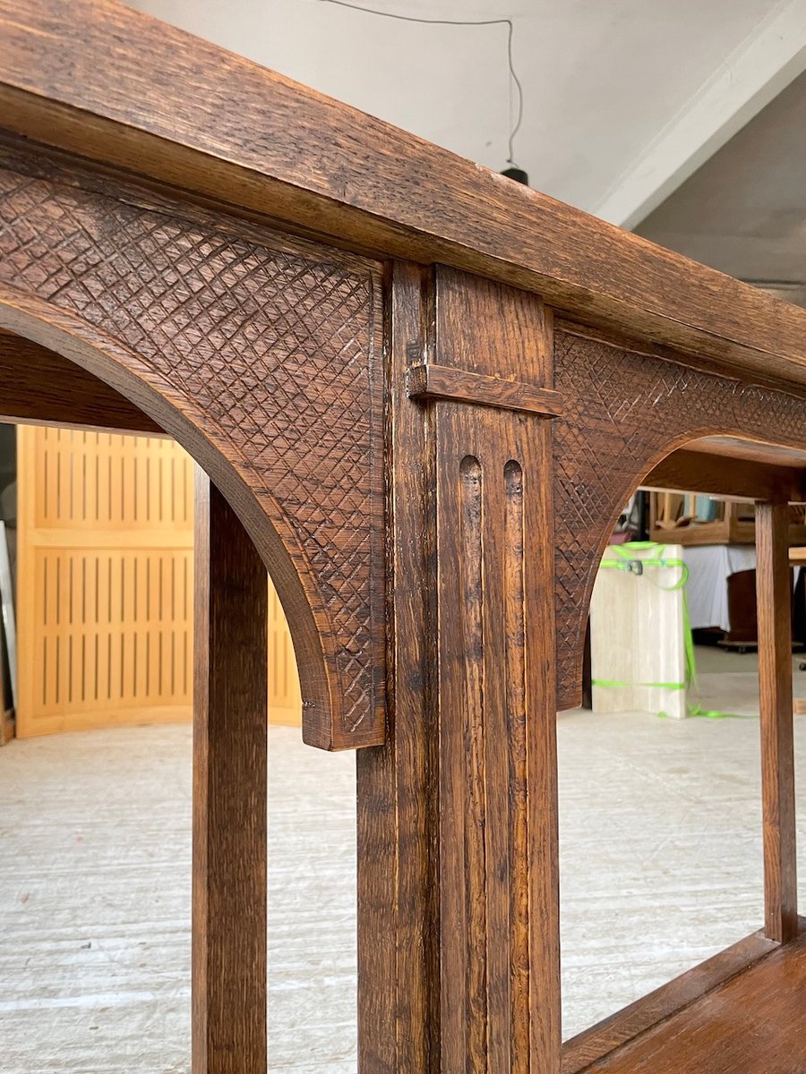 Er wurde von einem Kunsttischler komplett restauriert und besticht durch seine schönen Details - Riffelungen, Abschlüsse mit Zapfen und Holzdetails mit hübschen grafischen Mustern.