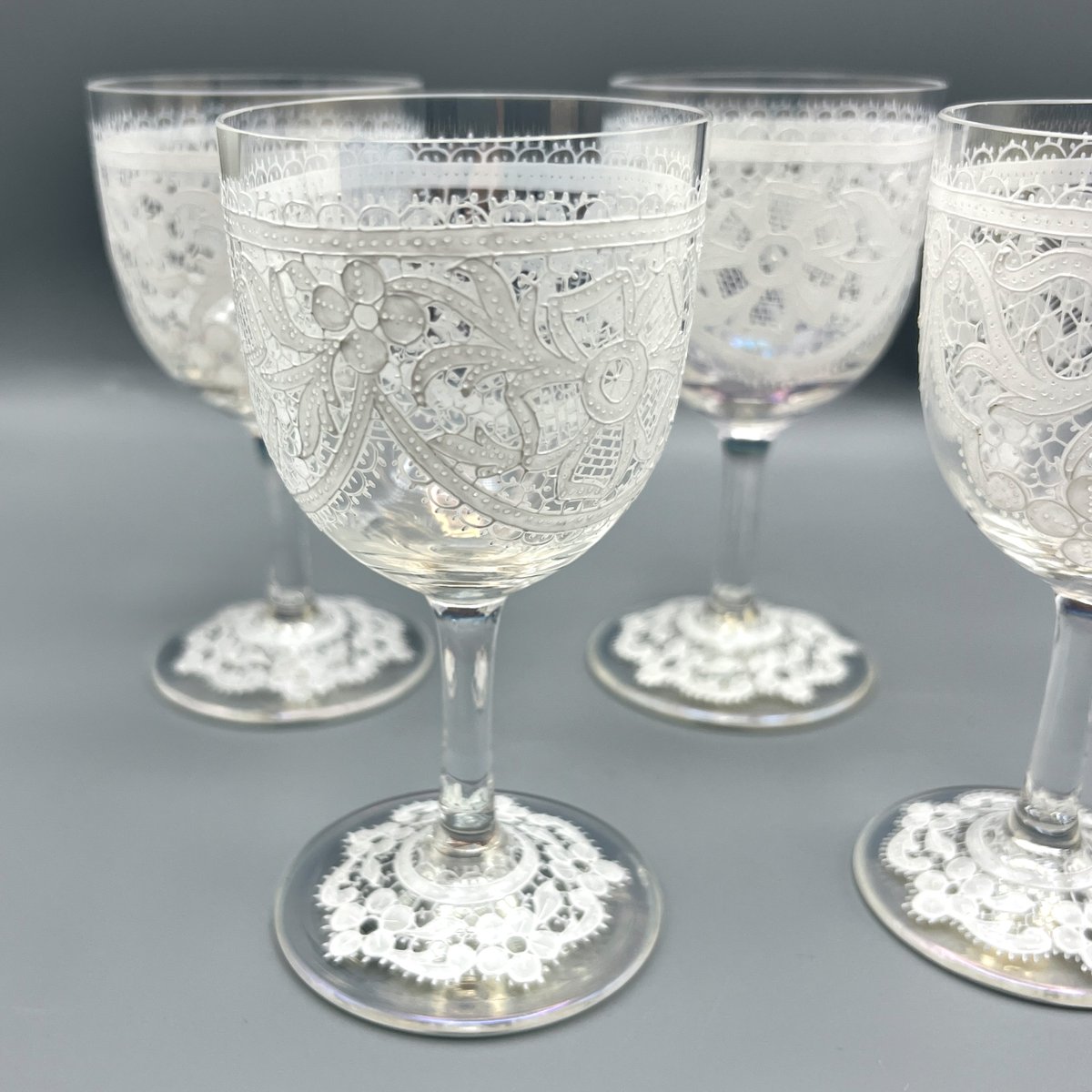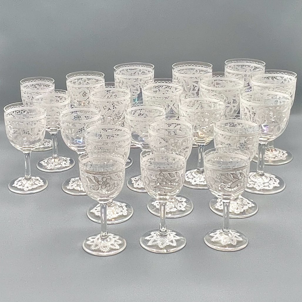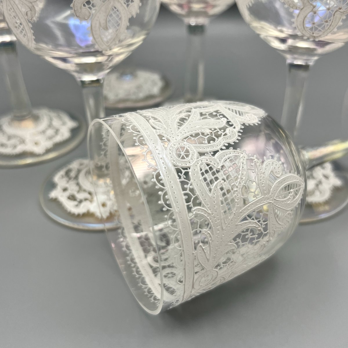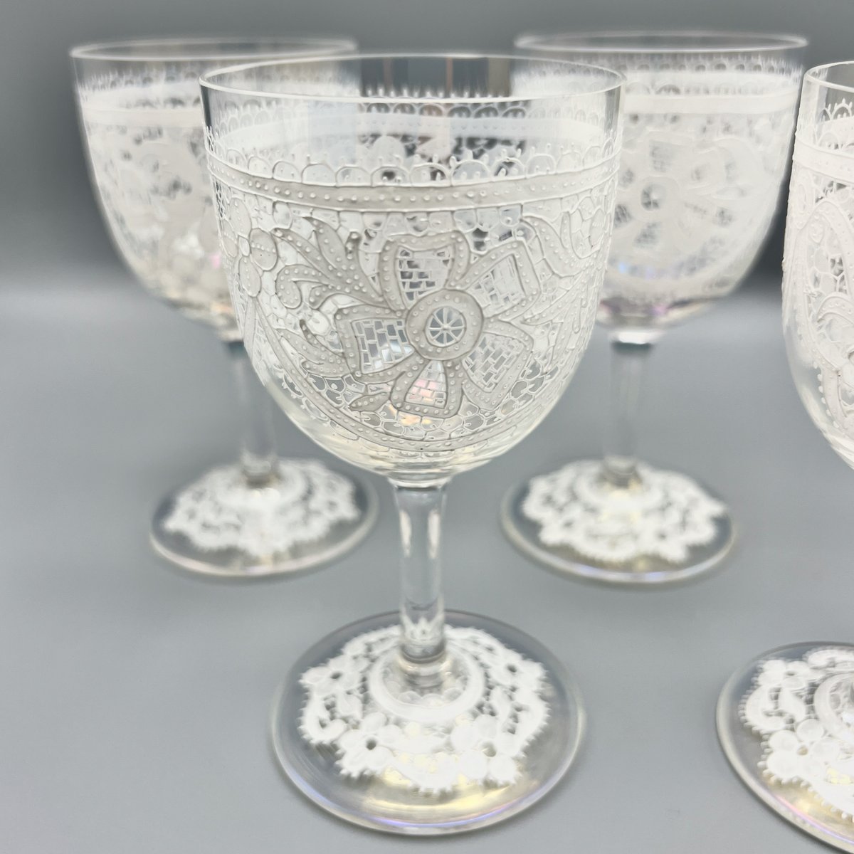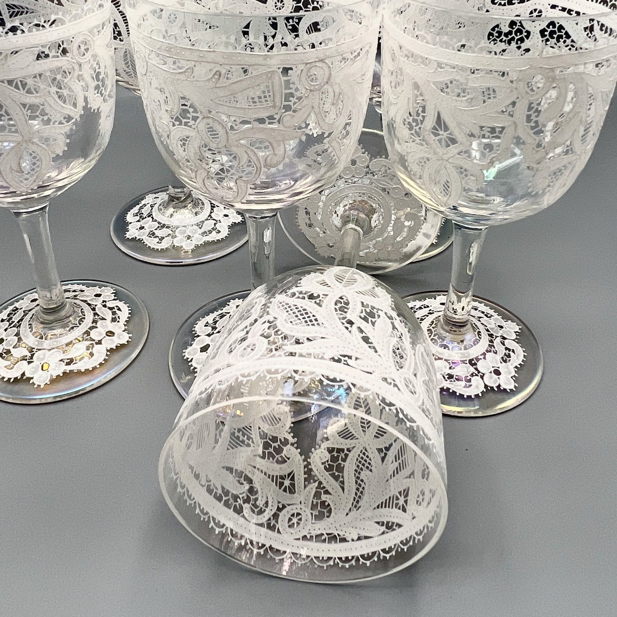 Rare, refined, and irresistibly elegant — this Murano glass suite is defined by its exquisite lace-enamel detailing, a design so intricate it feels almost couture. The delicate white enamel forms a continuous decorative frieze that gives each glass the air of fine Venetian jewellery rather than mere tableware.