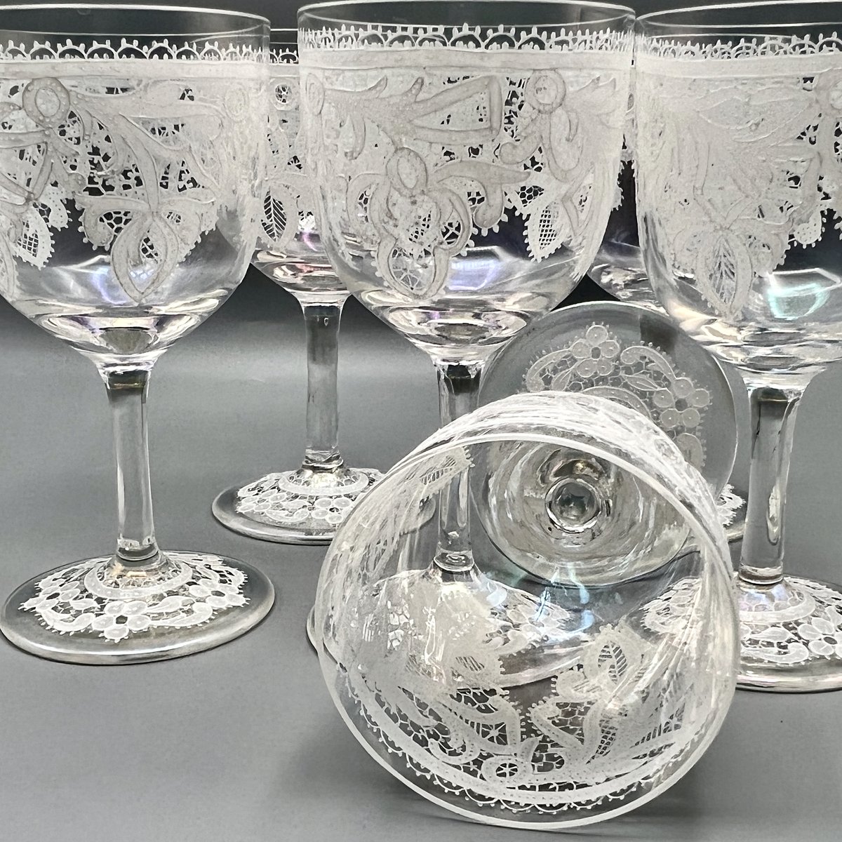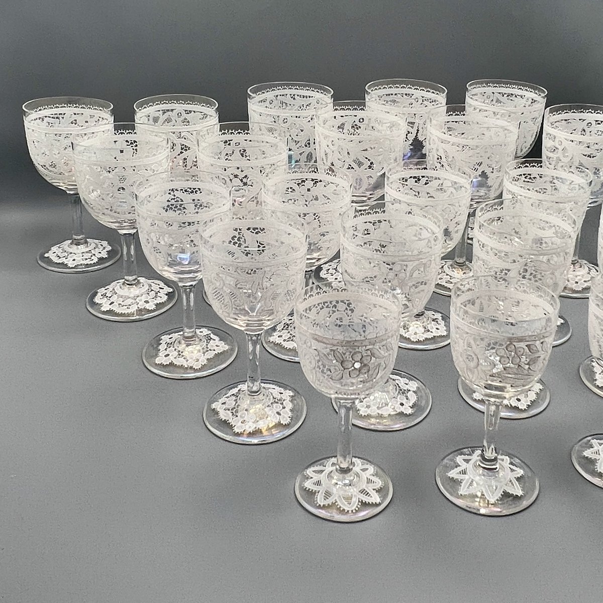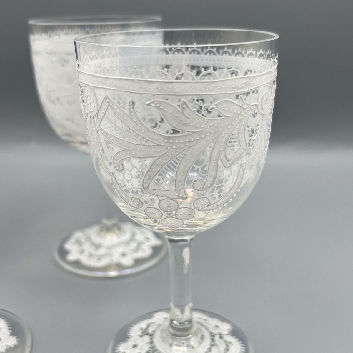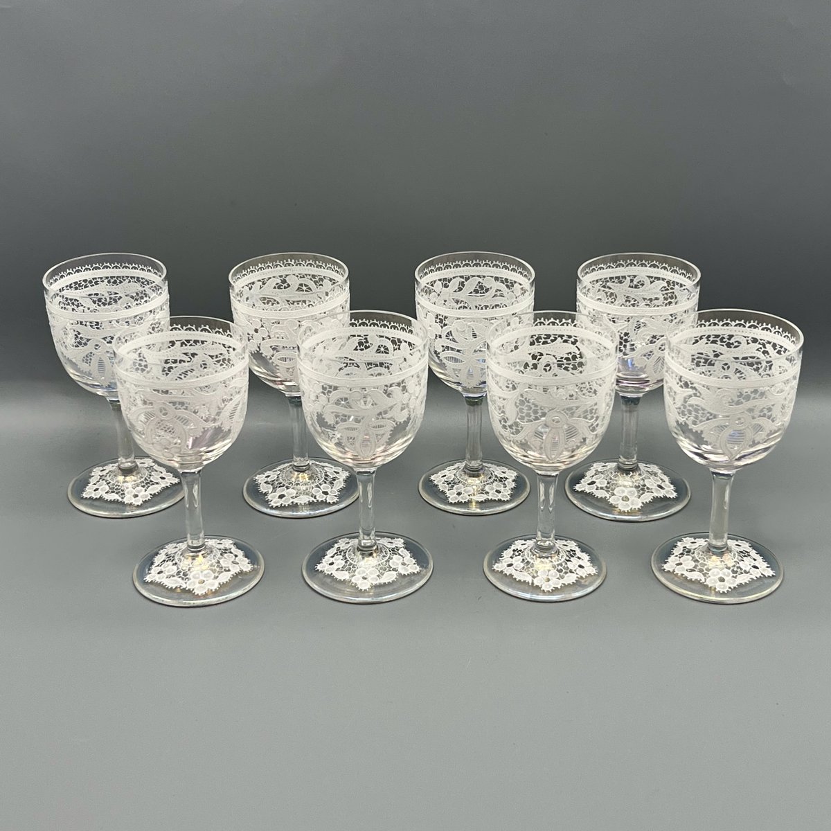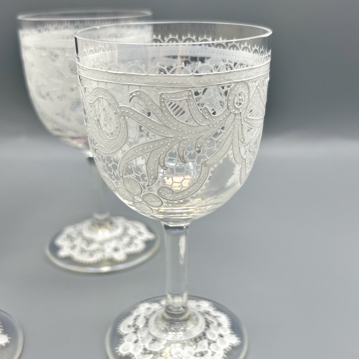Rare, refined, and irresistibly elegant — this Murano glass suite is defined by its exquisite lace-enamel detailing, a design so intricate it feels almost couture. The delicate white enamel forms a continuous decorative frieze that gives each glass the air of fine Venetian jewellery rather than mere tableware.