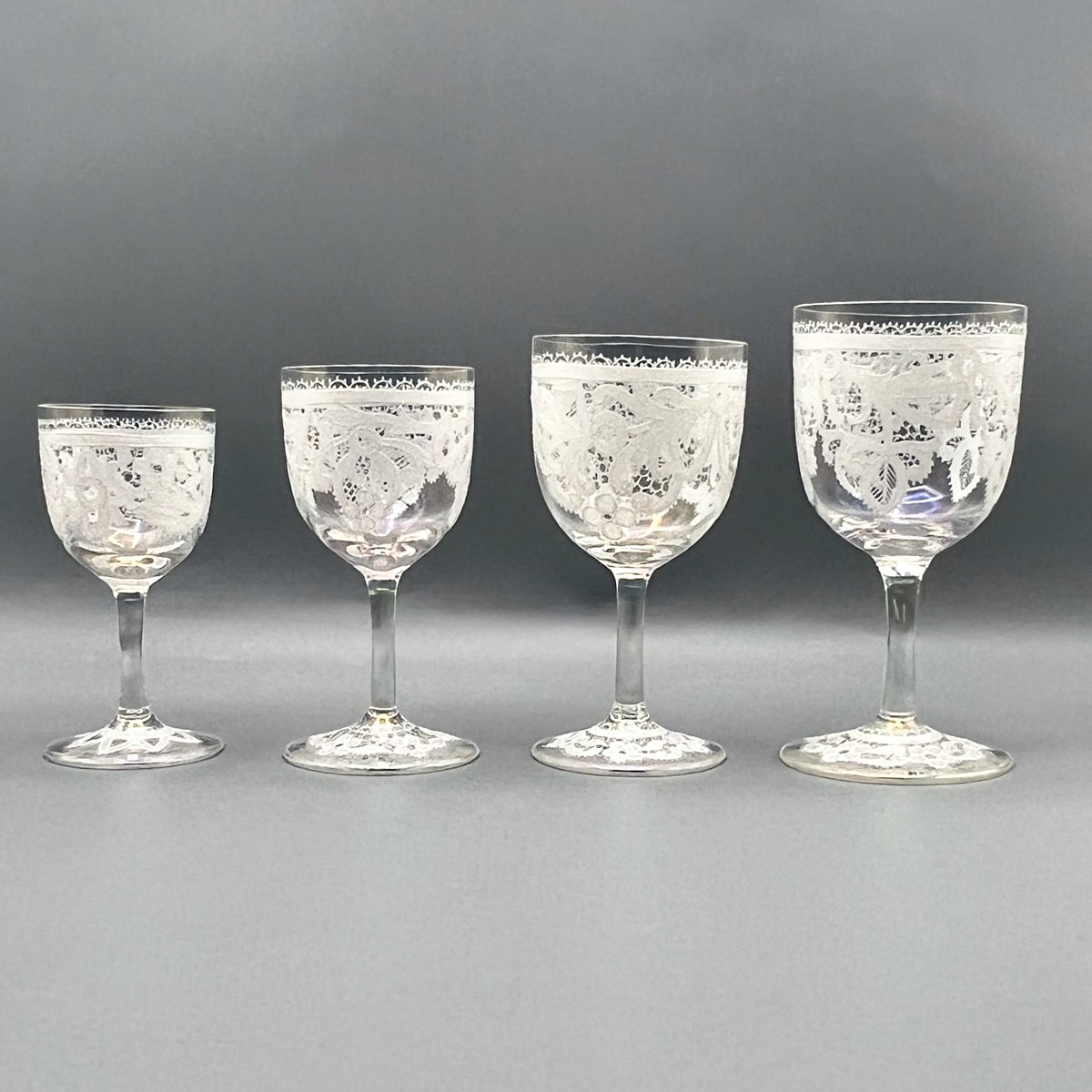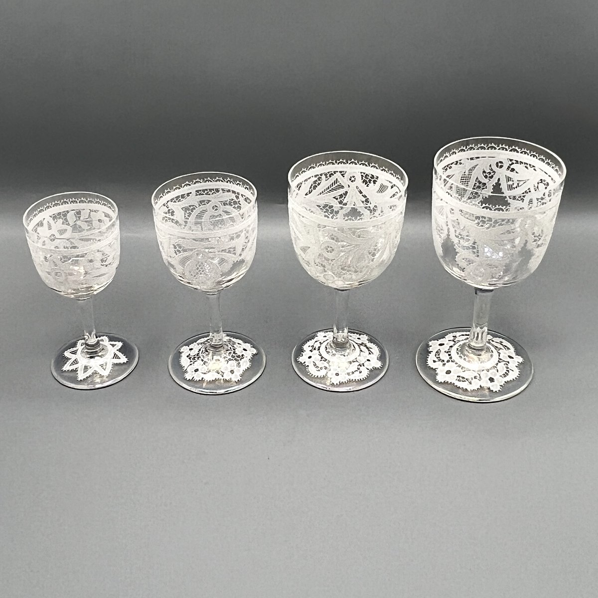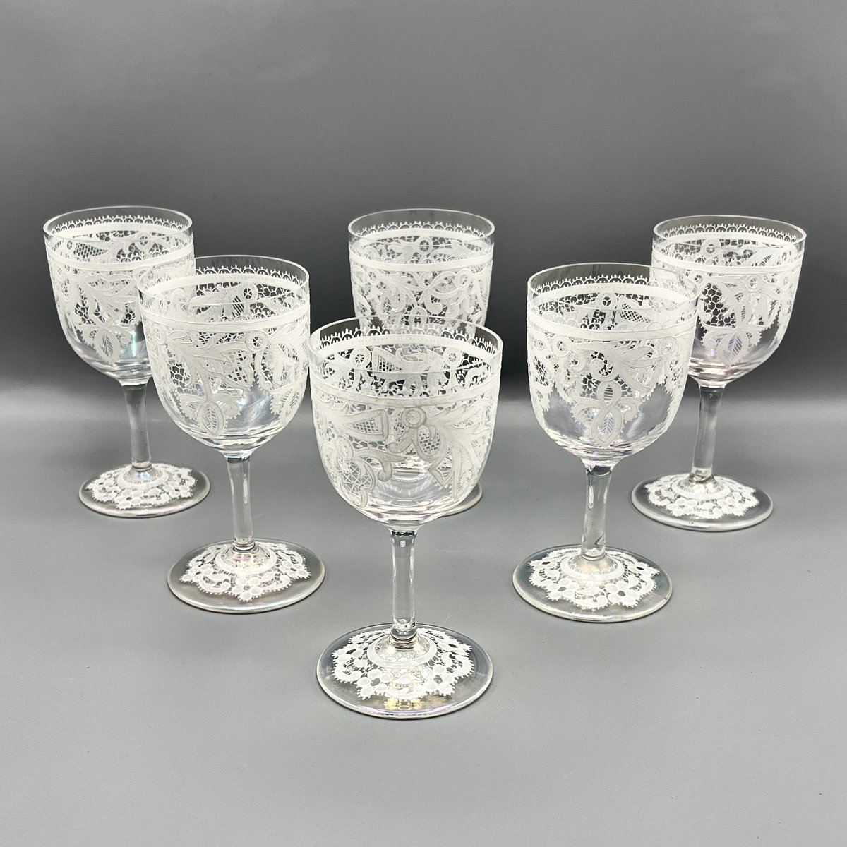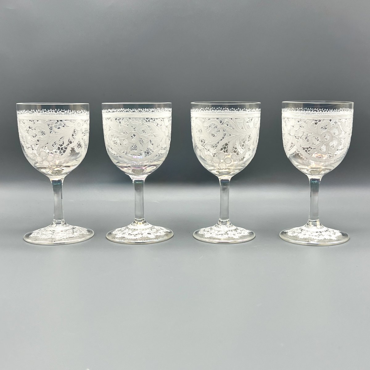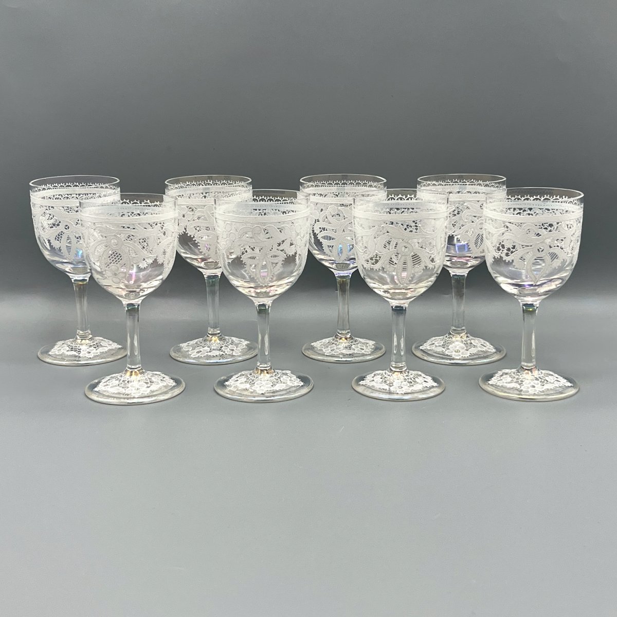 Rare, refined, and irresistibly elegant — this Murano glass suite is defined by its exquisite lace-enamel detailing, a design so intricate it feels almost couture. The delicate white enamel forms a continuous decorative frieze that gives each glass the air of fine Venetian jewellery rather than mere tableware.