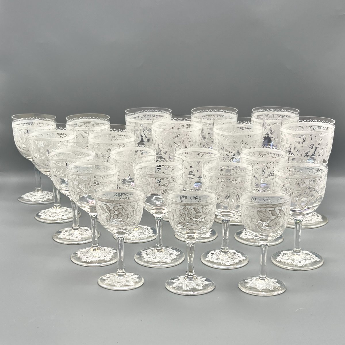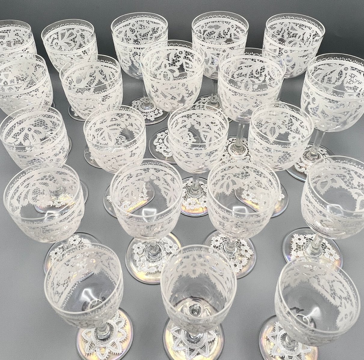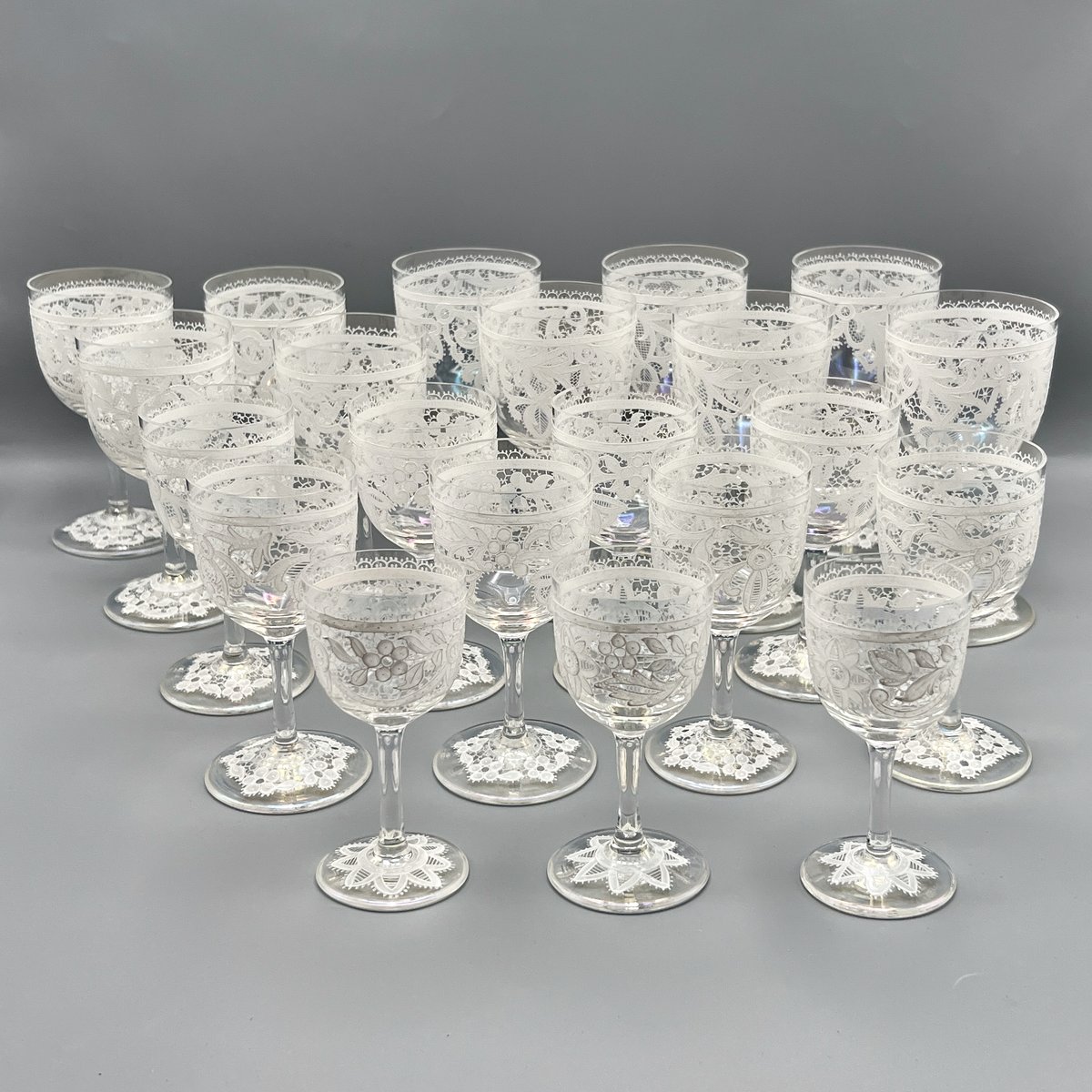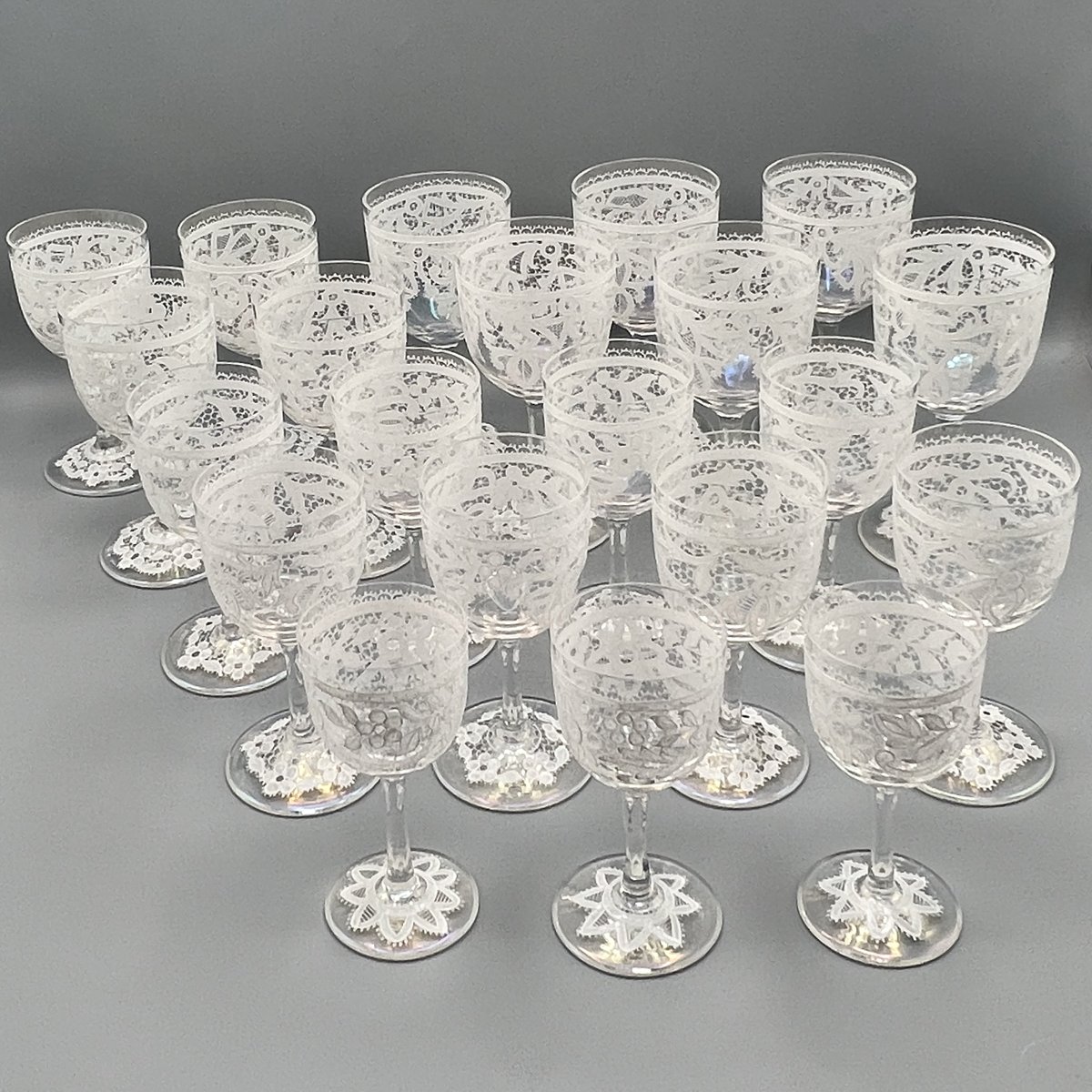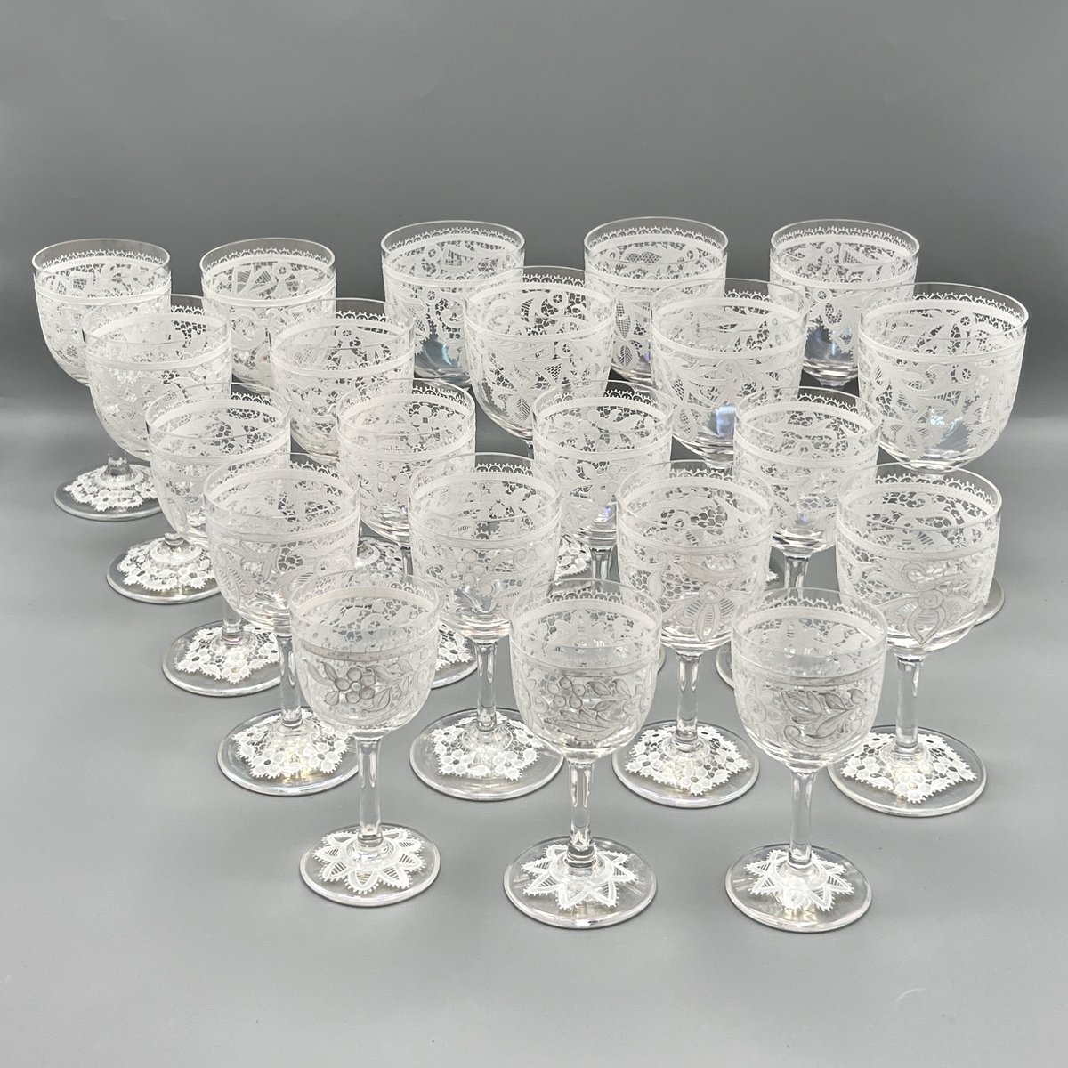 Rare, refined, and irresistibly elegant — this Murano glass suite is defined by its exquisite lace-enamel detailing, a design so intricate it feels almost couture. The delicate white enamel forms a continuous decorative frieze that gives each glass the air of fine Venetian jewellery rather than mere tableware.