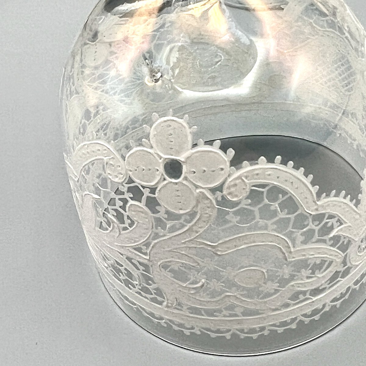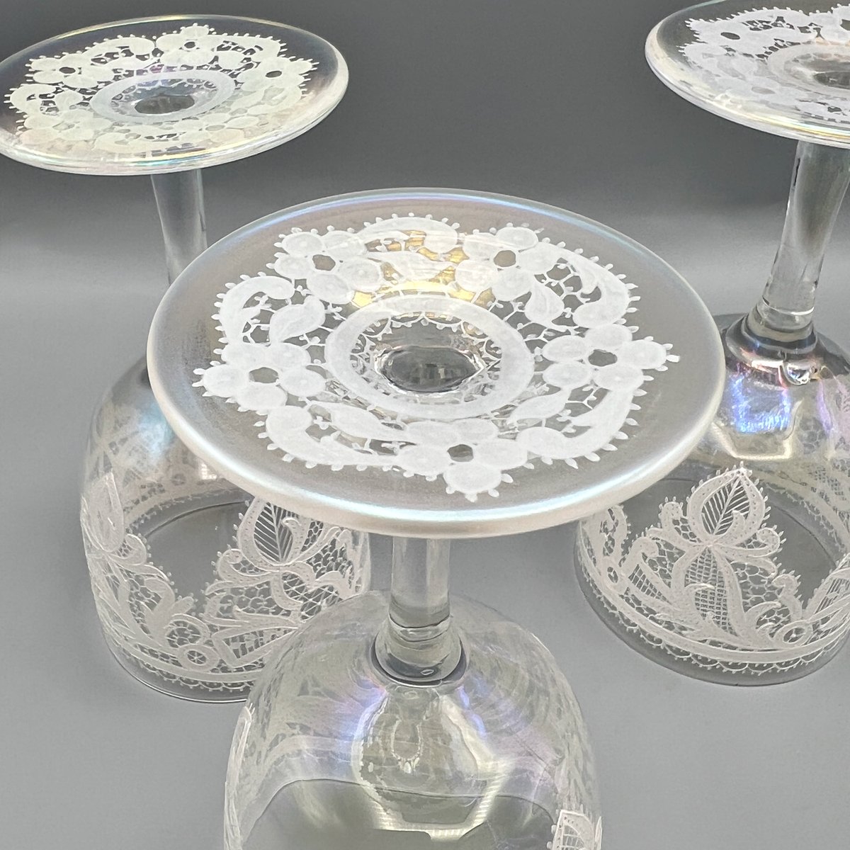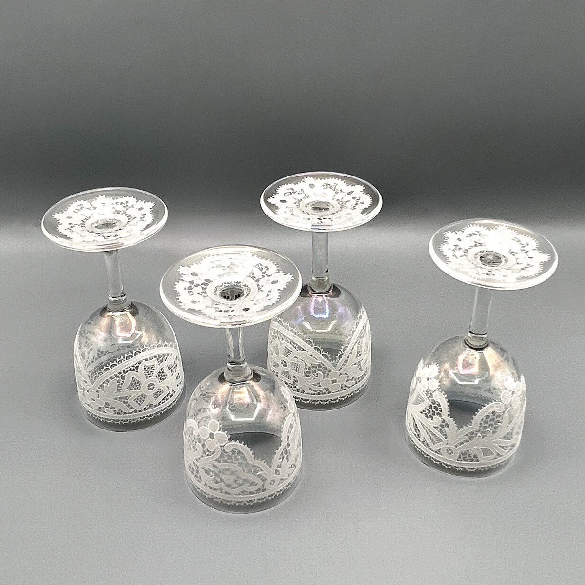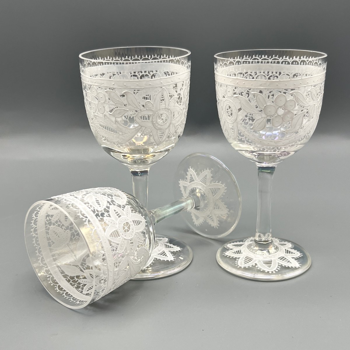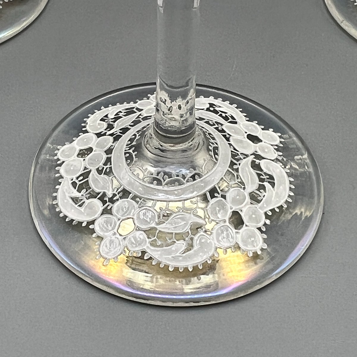 Rare, refined, and irresistibly elegant — this Murano glass suite is defined by its exquisite lace-enamel detailing, a design so intricate it feels almost couture. The delicate white enamel forms a continuous decorative frieze that gives each glass the air of fine Venetian jewellery rather than mere tableware.