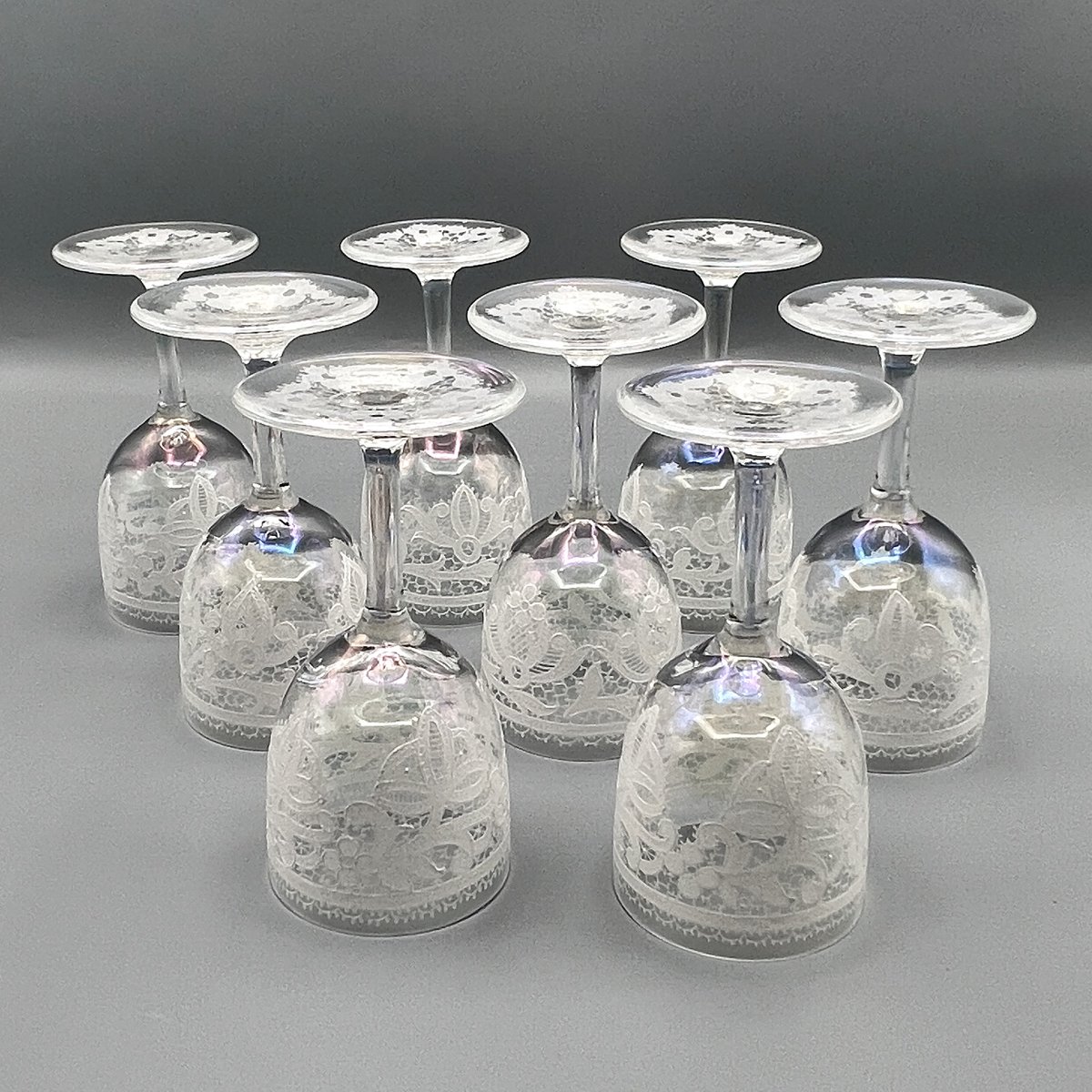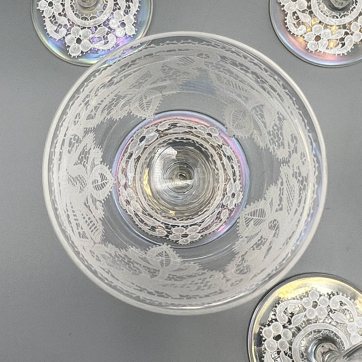 Jedes Glas schimmert mit einer zart schillernden Oberfläche und einer filigranen Spitzenemaille, einem Markenzeichen des venezianischen Designs der 1950er Jahre, das Venetia zugeschrieben wird und wahrscheinlich als Teil ihrer koordinierten Luxusgeschenkelinie geschaffen wurde.