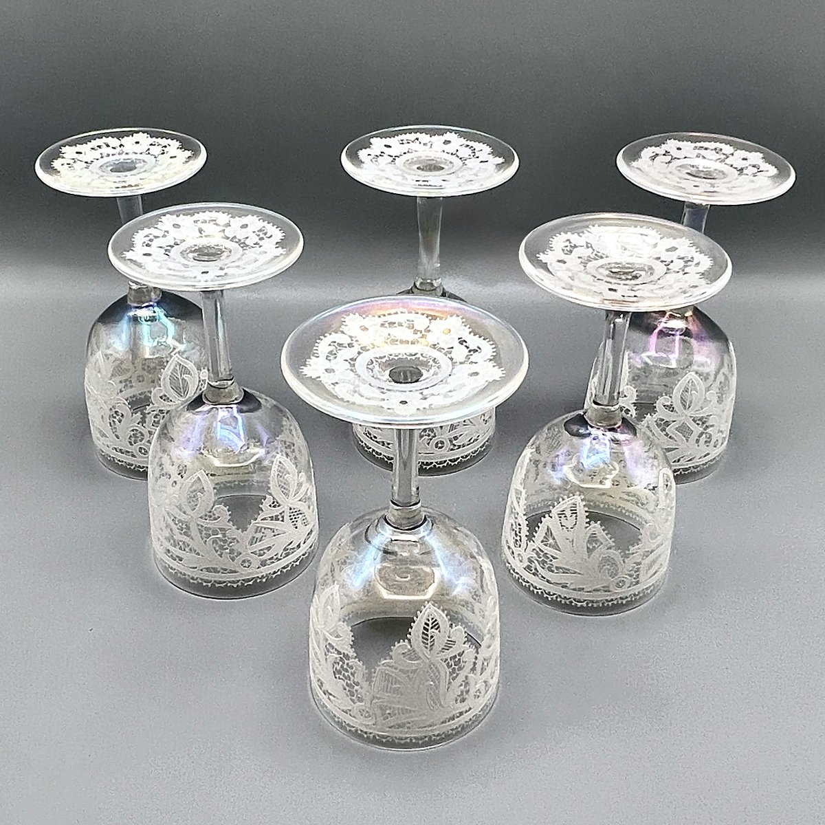 Each glass shimmers with a delicate iridescent surface and intricate lace enamel, a hallmark of 1950s Venetian design attributed to Venetia, likely created as part of their coordinated luxury gift line.