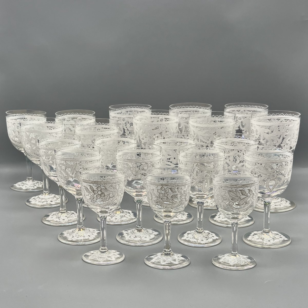 This is a true statement set — incredibly scarce, entirely hand-finished, and unmatched in its visual rhythm. Whether staged on a dining table, displayed on a mirrored bar console or drinks cart, or carried gracefully on a silver tray as guests mingle, the effect is instant glamour: poised, sophisticated, and impossible to ignore. These are the glasses that hosts bring out when they want guests to remember the evening — pieces that turn even the simplest pour into a moment of theatre.