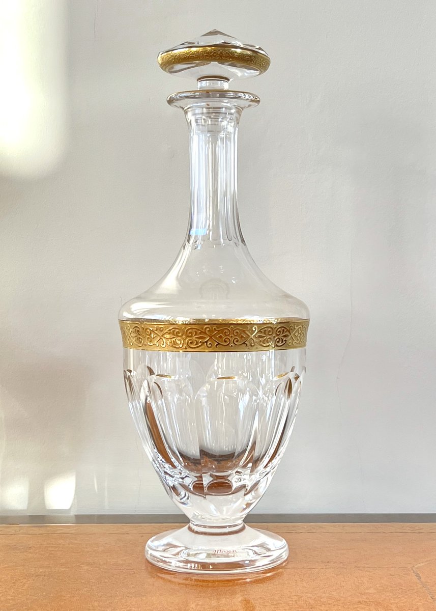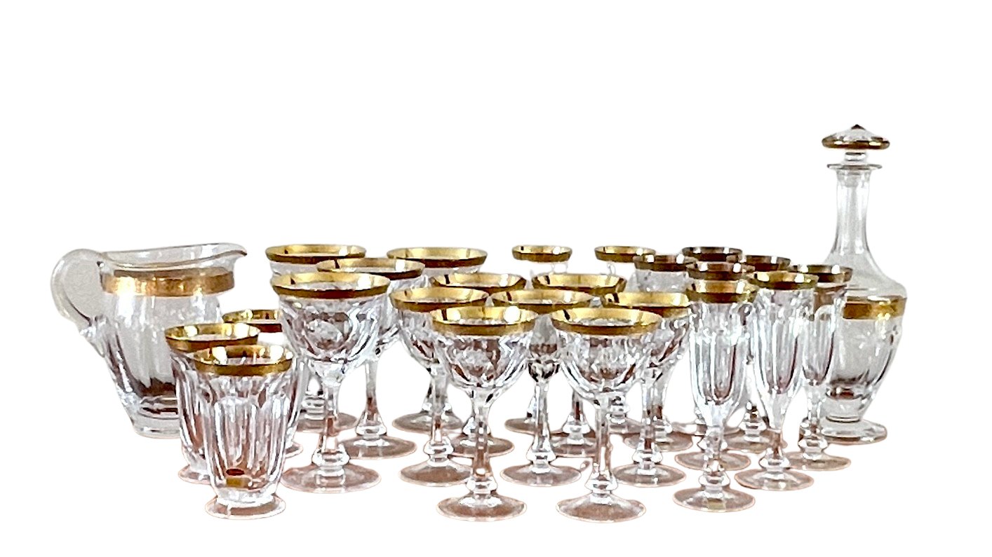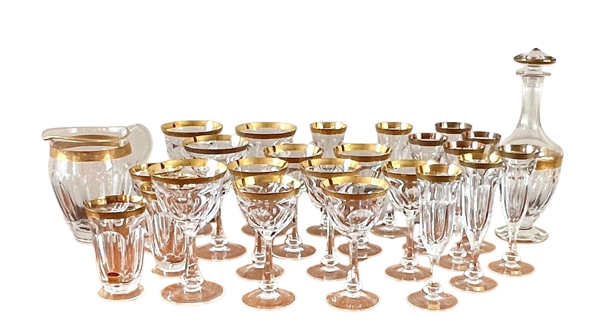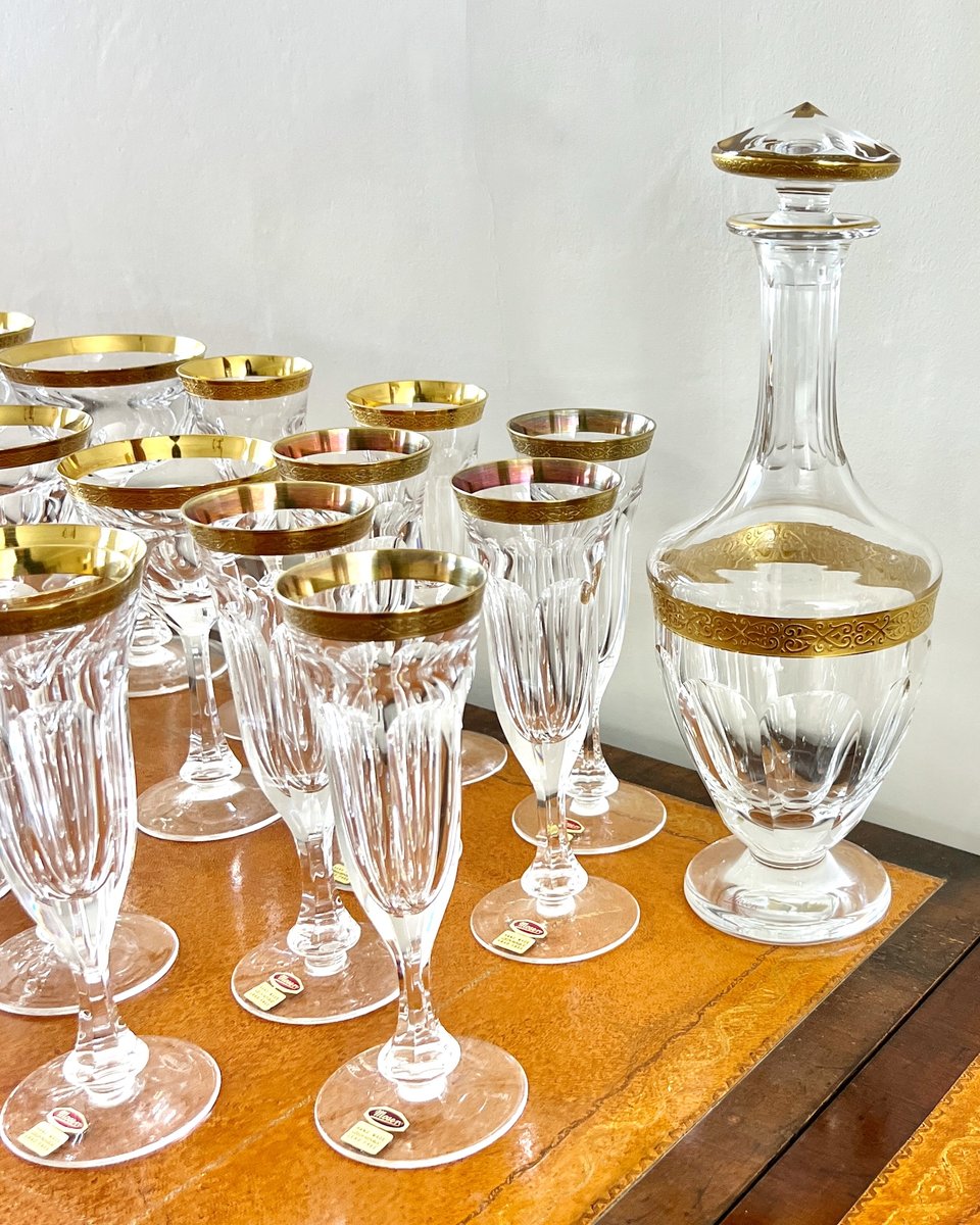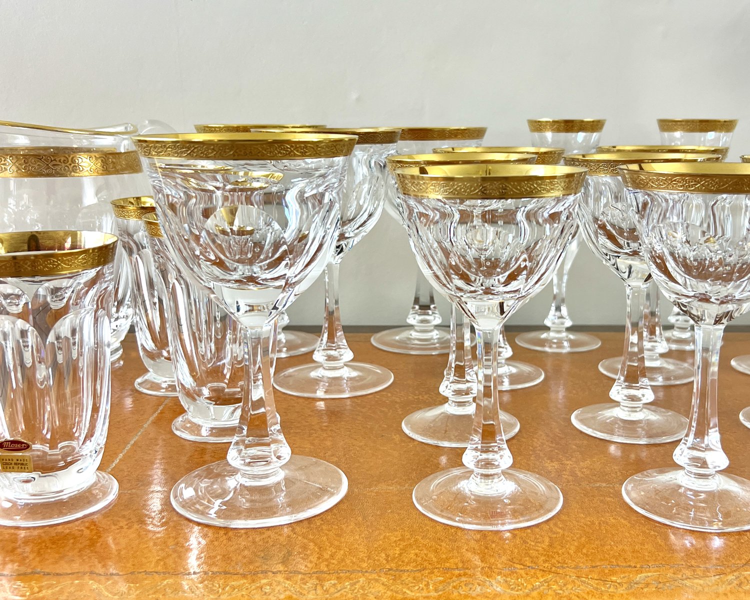 The suite includes 9 champagne flutes, 11 wine glasses in two sizes, 3 large tumblers, the impressive 1.5-litre water jug, and the elegant 920 ml decanter—both pieces rarely found in the gold-decorated version today. All glasses are etched with the Moser makers mark and carry an original sticker.