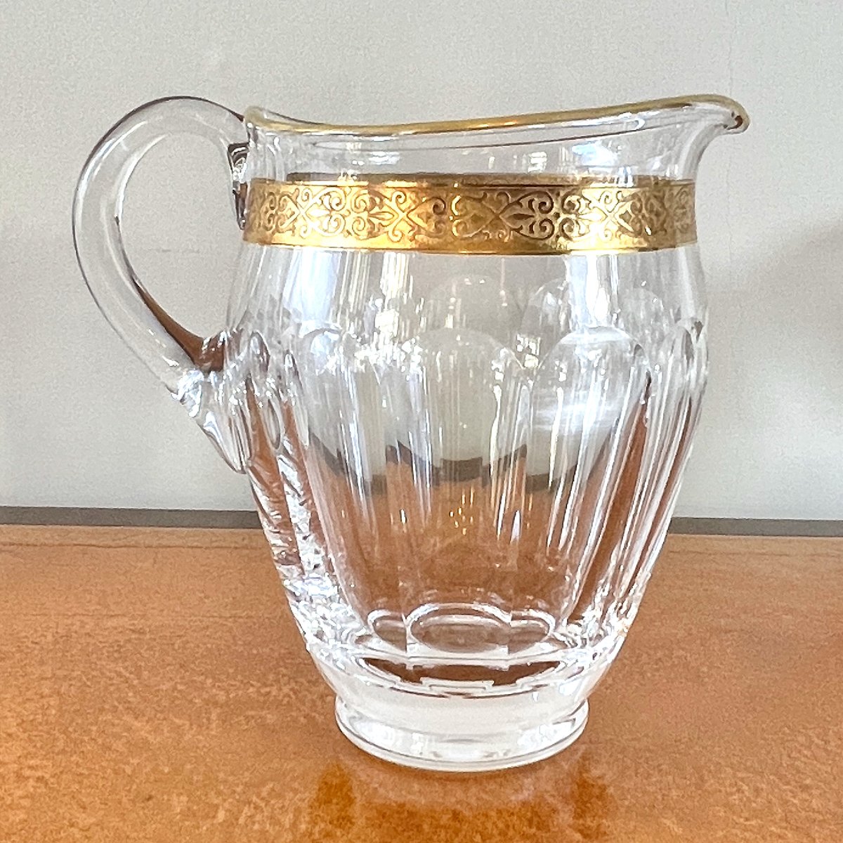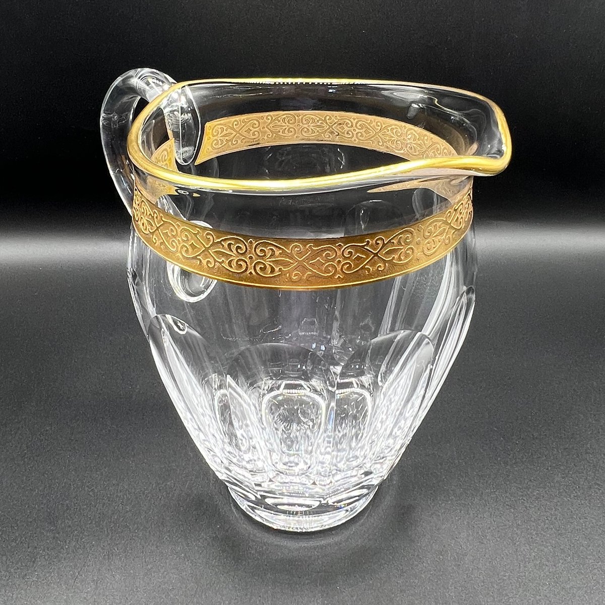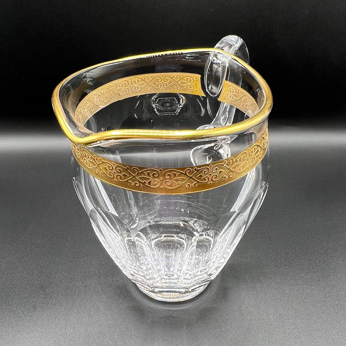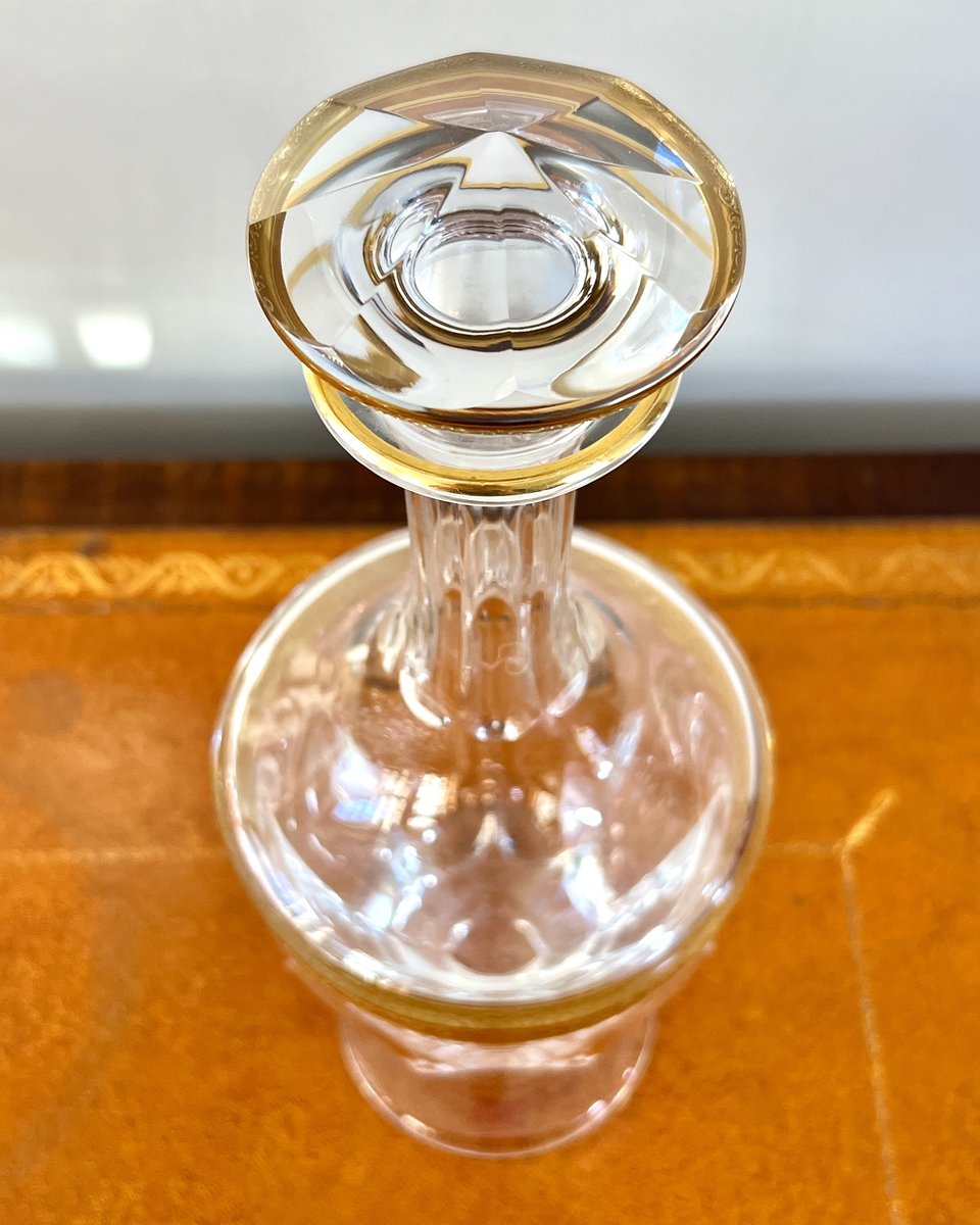 The suite includes 9 champagne flutes, 11 wine glasses in two sizes, 3 large tumblers, the impressive 1.5-litre water jug, and the elegant 920 ml decanter—both pieces rarely found in the gold-decorated version today. All glasses are etched with the Moser makers mark and carry an original sticker.