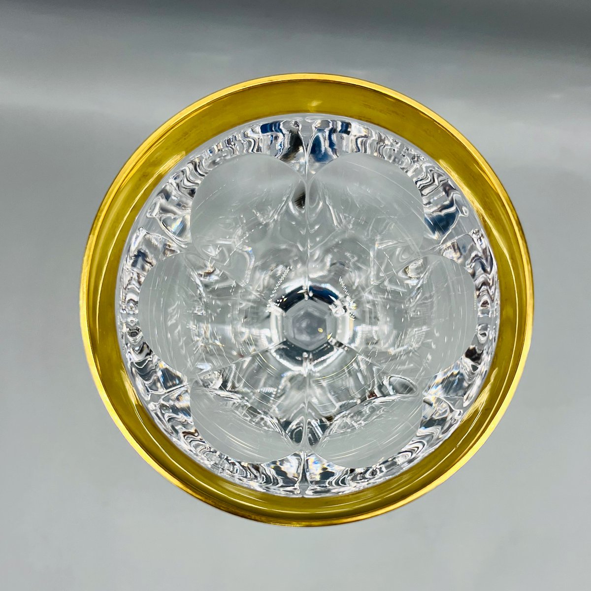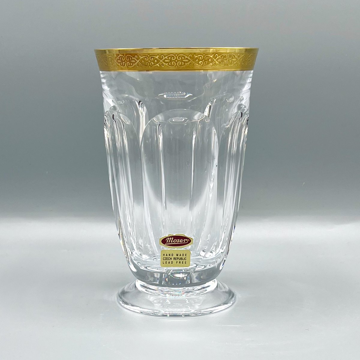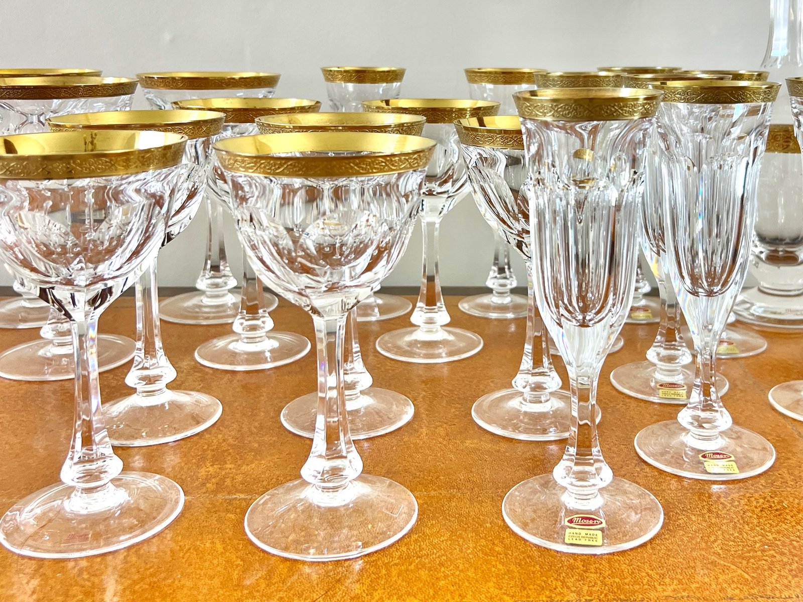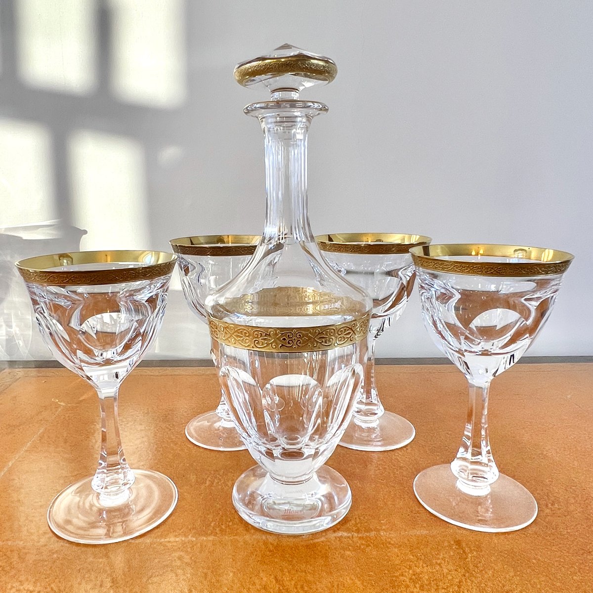 This vintage set was produced in the Czech Republic during the 1970s, identifiable by the period Moser labels and engraved script signatures. Each piece is hand-blown from Moser’s famously pure, lead-free crystal and finished with a wide band of 24-karat oroplastic gold, applied and polished entirely by hand.