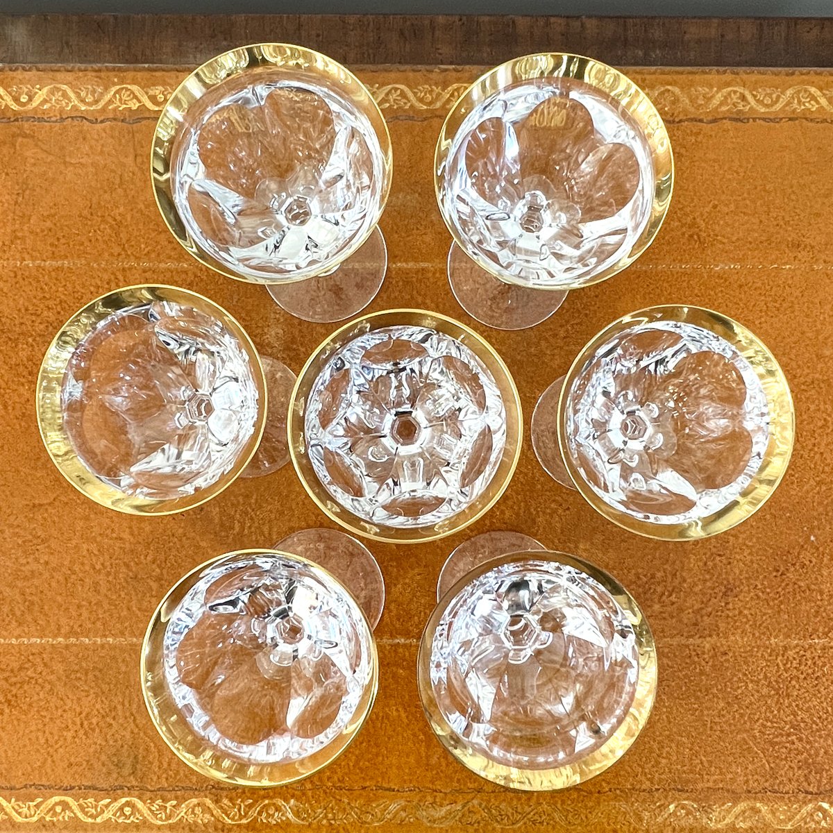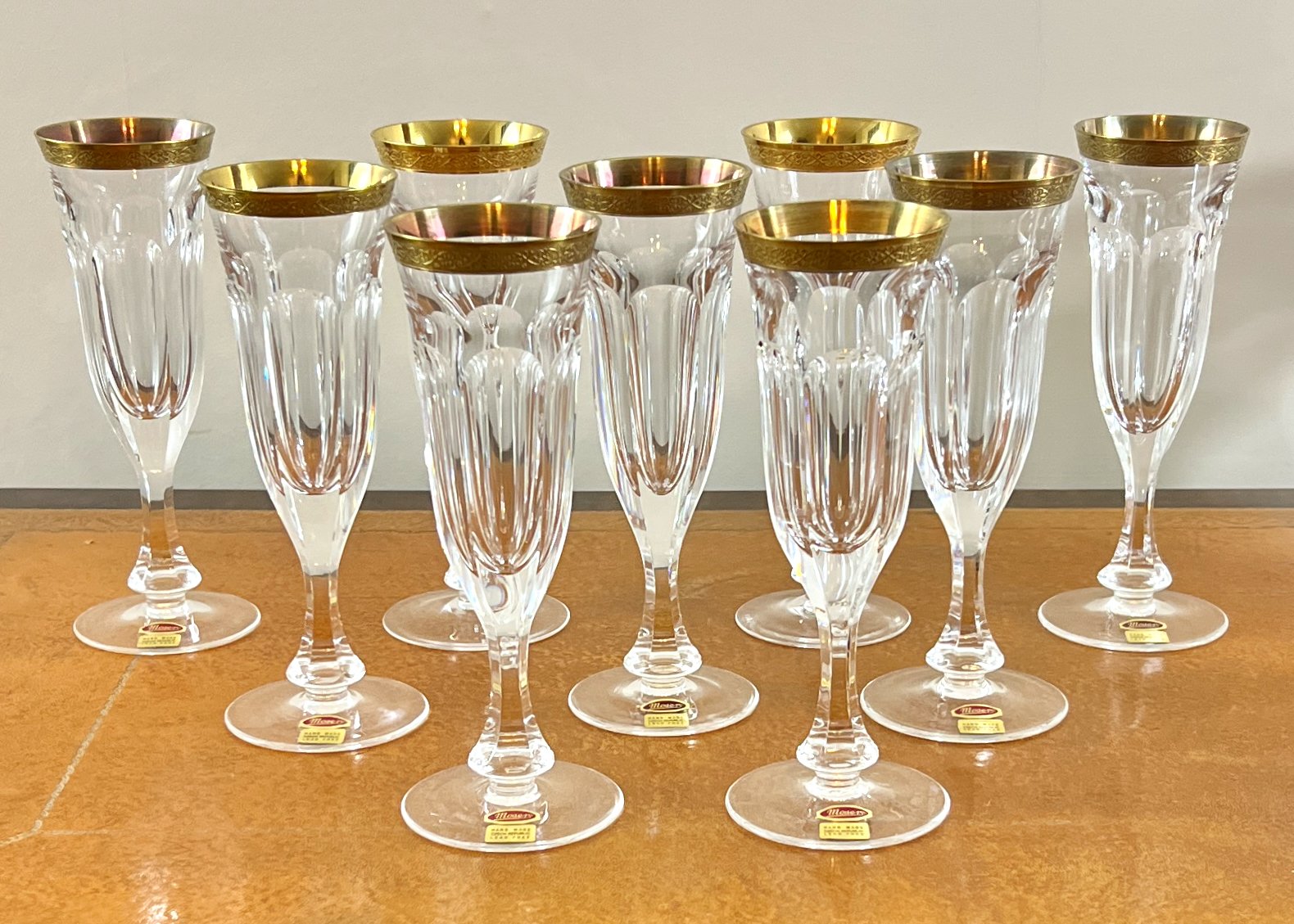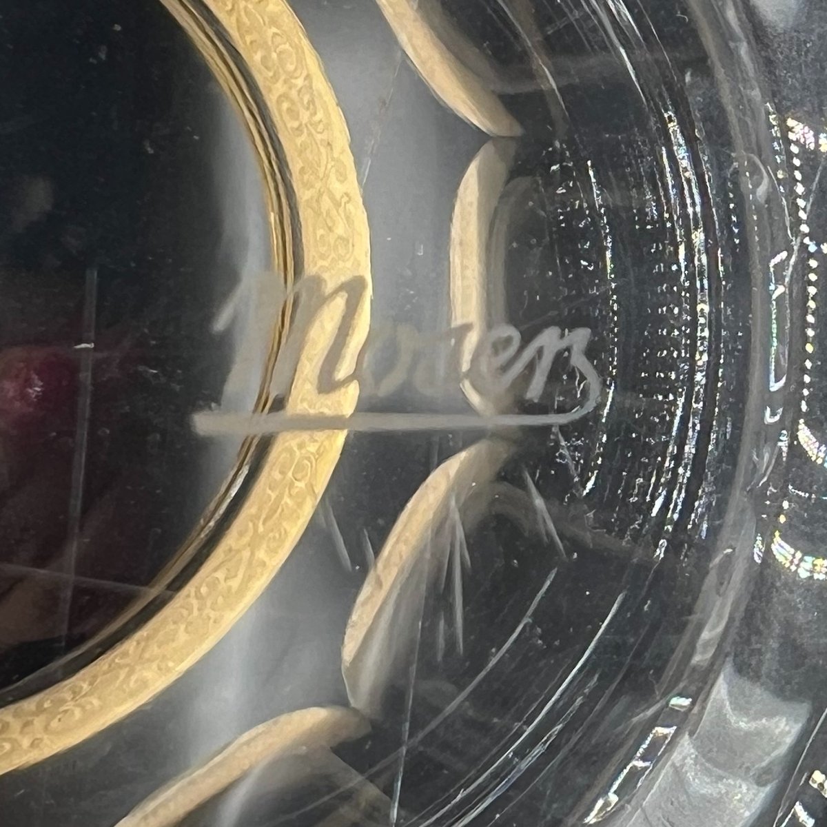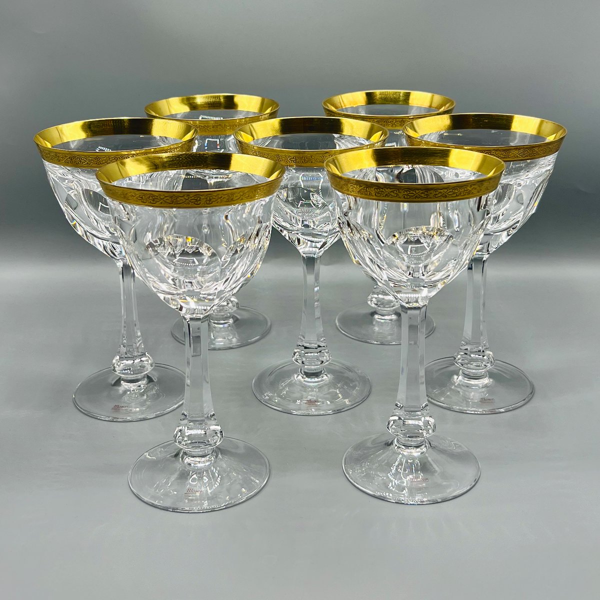 This vintage set was produced in the Czech Republic during the 1970s, identifiable by the period Moser labels and engraved script signatures. Each piece is hand-blown from Moser’s famously pure, lead-free crystal and finished with a wide band of 24-karat oroplastic gold, applied and polished entirely by hand.