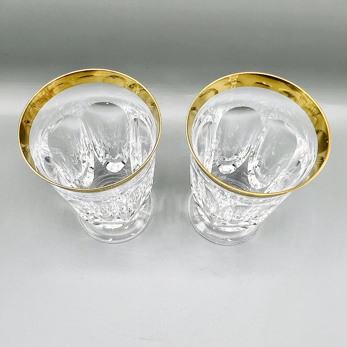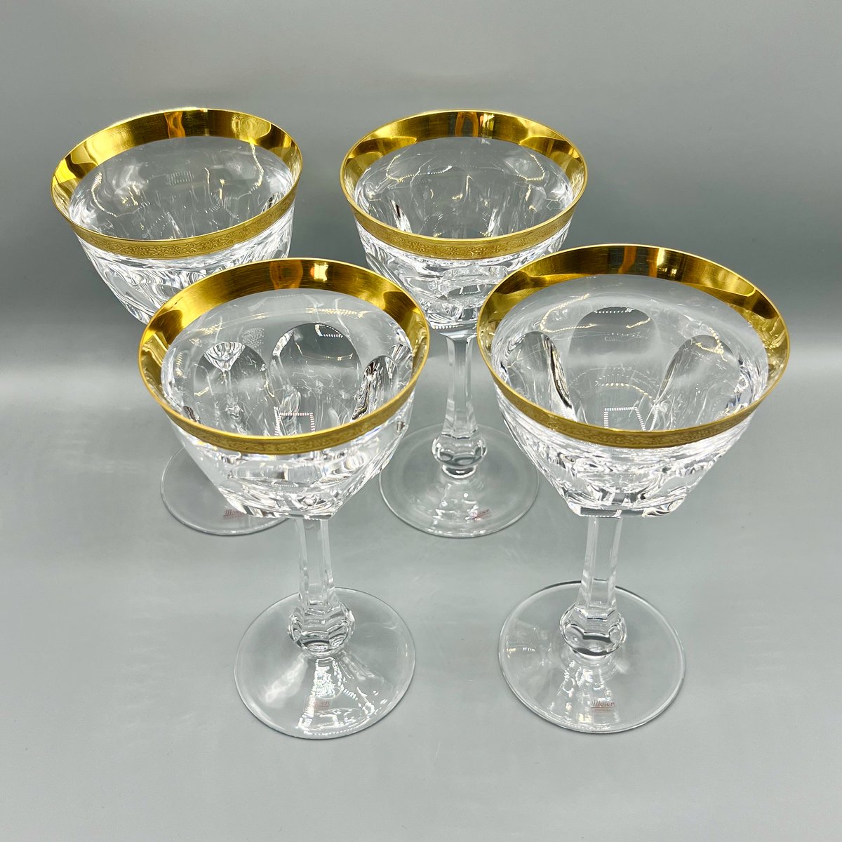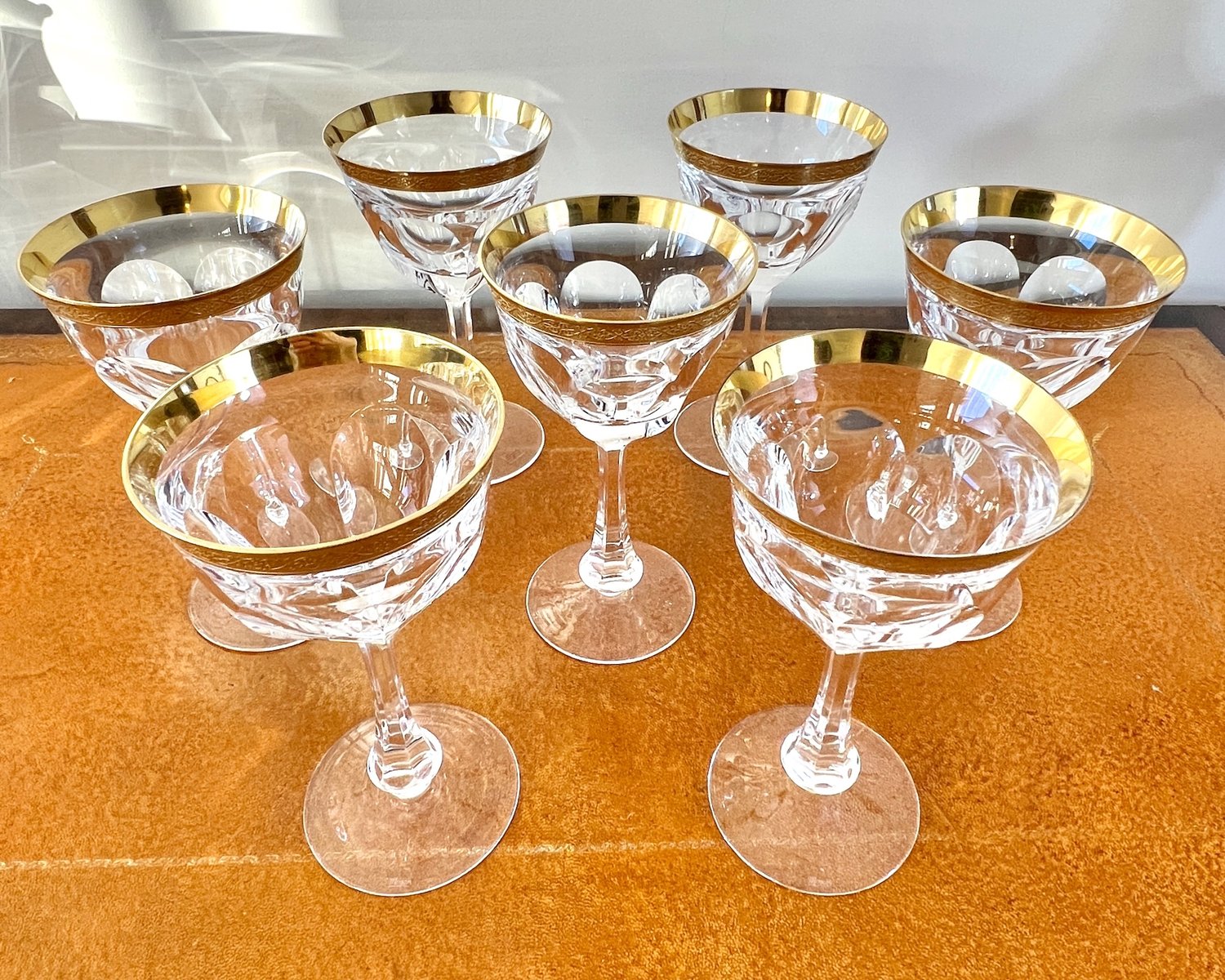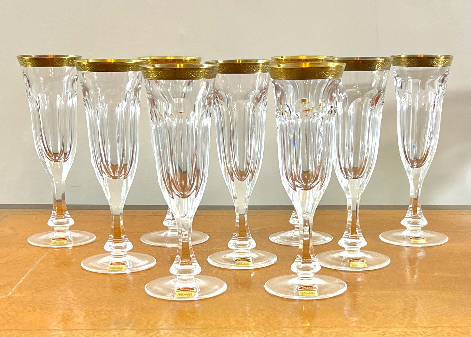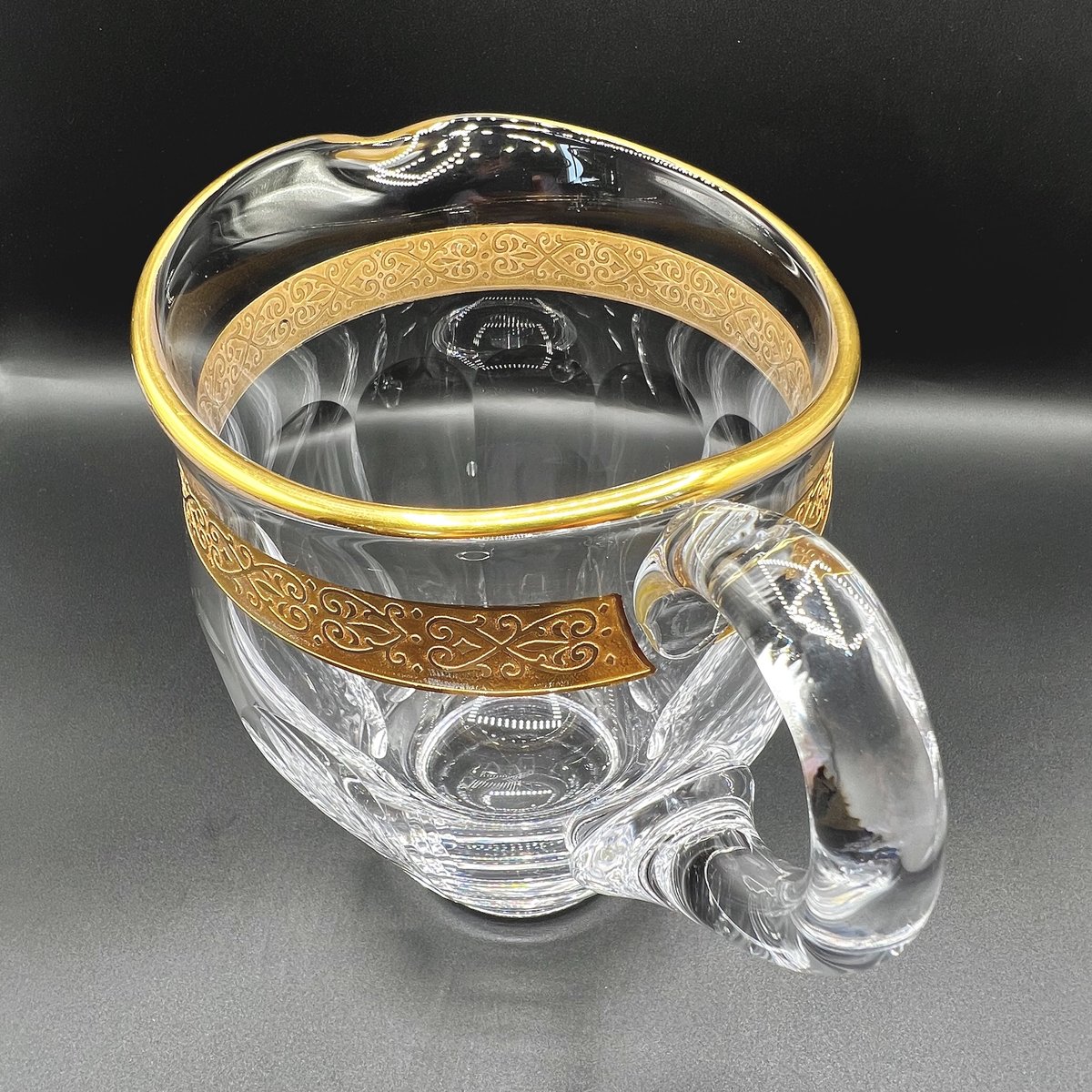 This vintage set was produced in the Czech Republic during the 1970s, identifiable by the period Moser labels and engraved script signatures. Each piece is hand-blown from Moser’s famously pure, lead-free crystal and finished with a wide band of 24-karat oroplastic gold, applied and polished entirely by hand.