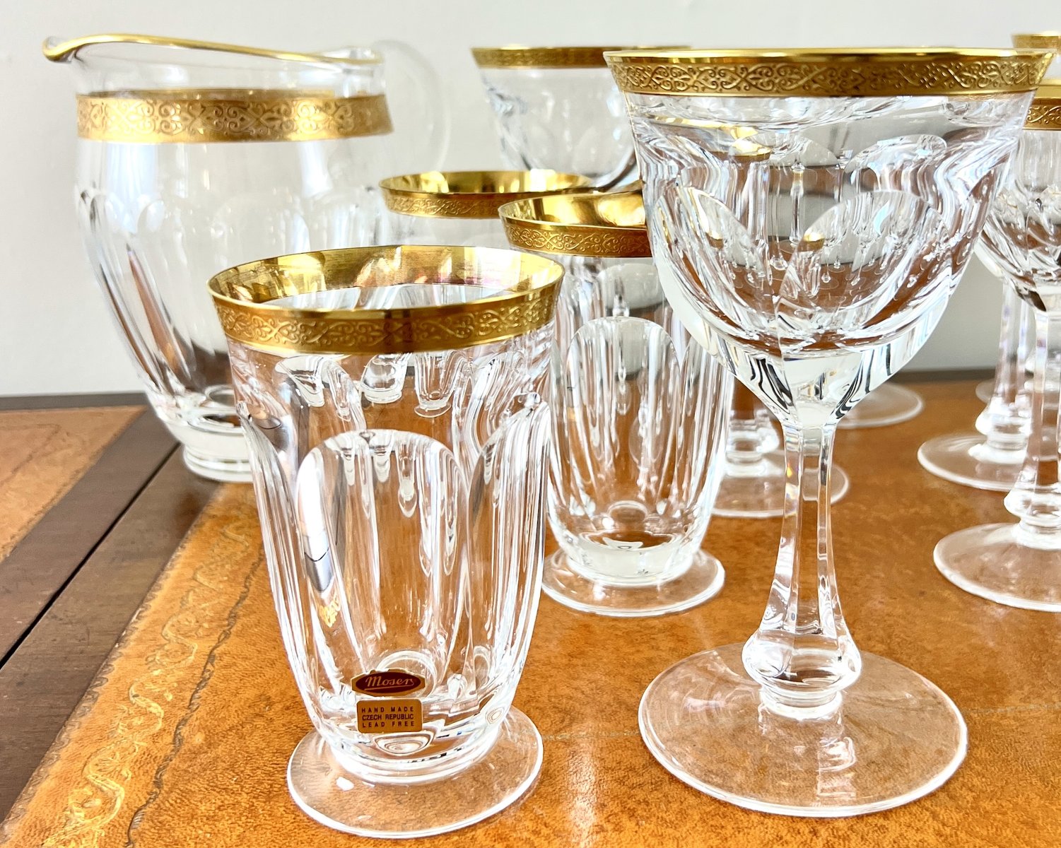 Dieses Vintage-Set wurde in den 1970er Jahren in der Tschechischen Republik hergestellt und ist an den historischen Moser-Etiketten und den eingravierten Schriftsignaturen zu erkennen. Jedes Stück ist aus dem bekannt reinen, bleifreien Moser-Kristall mundgeblasen und mit einem breiten Band aus 24-karätigem Oroplastikgold versehen, das vollständig von Hand aufgetragen und poliert wurde.