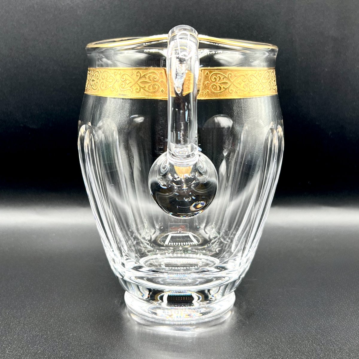 Die Serie umfasst 9 Champagnerflöten, 11 Weingläser in zwei Größen, 3 große Becher, den beeindruckenden 1,5-Liter-Wasserkrug und die elegante 920-ml-Karaffe - beides Stücke, die man heute nur noch selten in der goldverzierten Version findet. Alle Gläser sind mit der Moser-Marke geätzt und tragen einen Originalaufkleber.