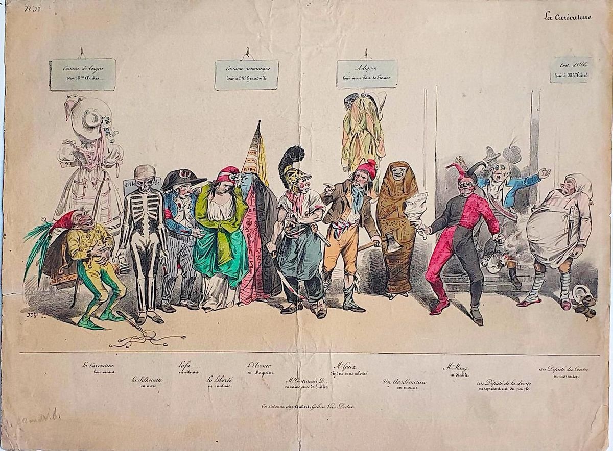 Le Caricature is an original Hand-colored lithograph realized by Jean-Jacques Grandville in 1831. with a sentence on the lower center ''On s'abonne chez Aubert Galerie Vero-Dodat'', Hand-signed on the plate. In very good conditions. References: von Kritter 1980 / La Caricature: Bildsatire in Frankreich 1830-35 (p.55, n.5) Here the artwork represents theatrical satiric figures, in various costumes, including the skeleton, revolutionary, devil and mummy through bright colors and soft and precise strokes, with clothes and description frames hanging on the back wall. Jean Ignace Isidore Gérard (1803-1847) known by the pseudonym of Jean-Jacques or J. J. Grandville, was a French caricaturist. Grandville's ability for political provocation made his work with great impact. He worked in a wide variety of formats, from his first job illustrating the parlor game Old Maid, to illustrated newspaper strips of which he was a master. Though the designs of Grandville are occasionally unnatural and absurd, they usually display keen analysis of character and marvellous inventive ingenuity, and his humour is always tempered and refined by delicacy of sentiment and a vein of sober thoughtfulness.