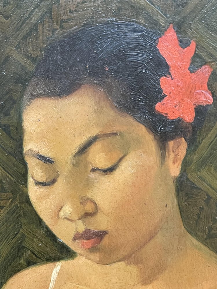 This oil painting on a wooden panel was painted during a journey to Cambodia. It depicts a young girl focused on her work. In this portrait, we can perceive a profound sense of softness and tranquility.