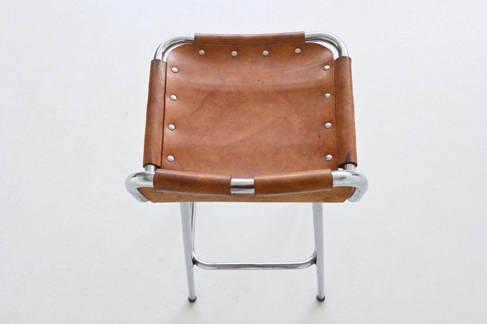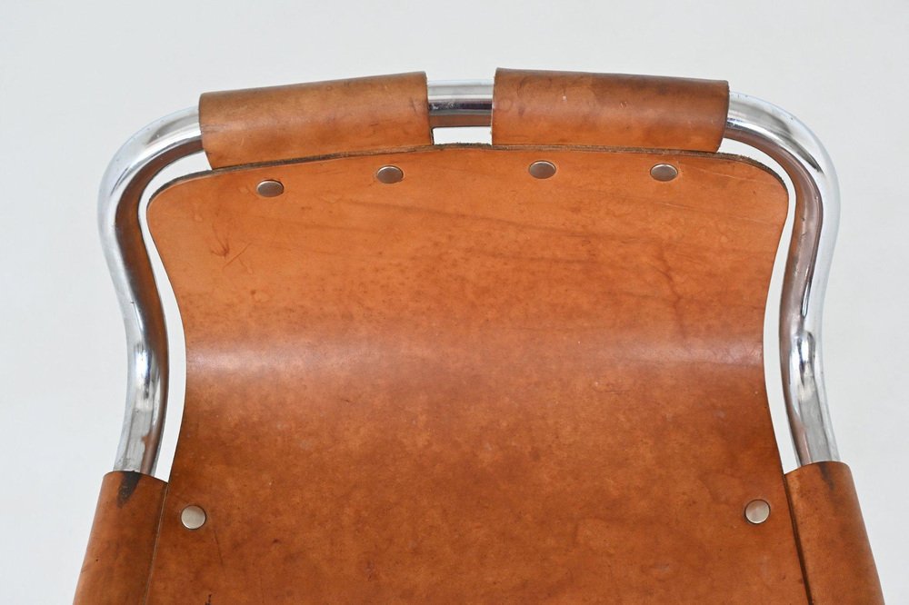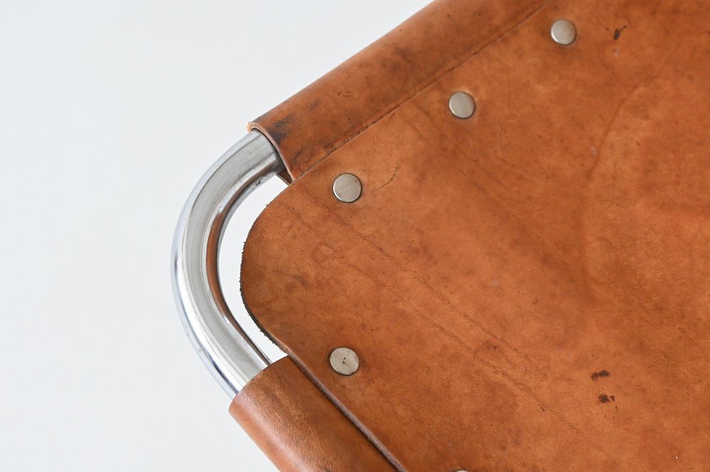 The seats are made from thick cognac saddle leather, richly patinated over time and enhanced with visible stitching and riveted details, reinforcing their handcrafted character. The sleek chrome tubular frames add a modernist contrast to the natural warmth of the leather, providing both strength and minimal visual weight.
