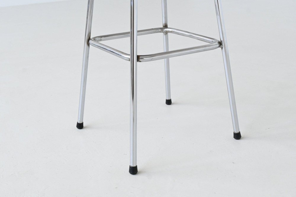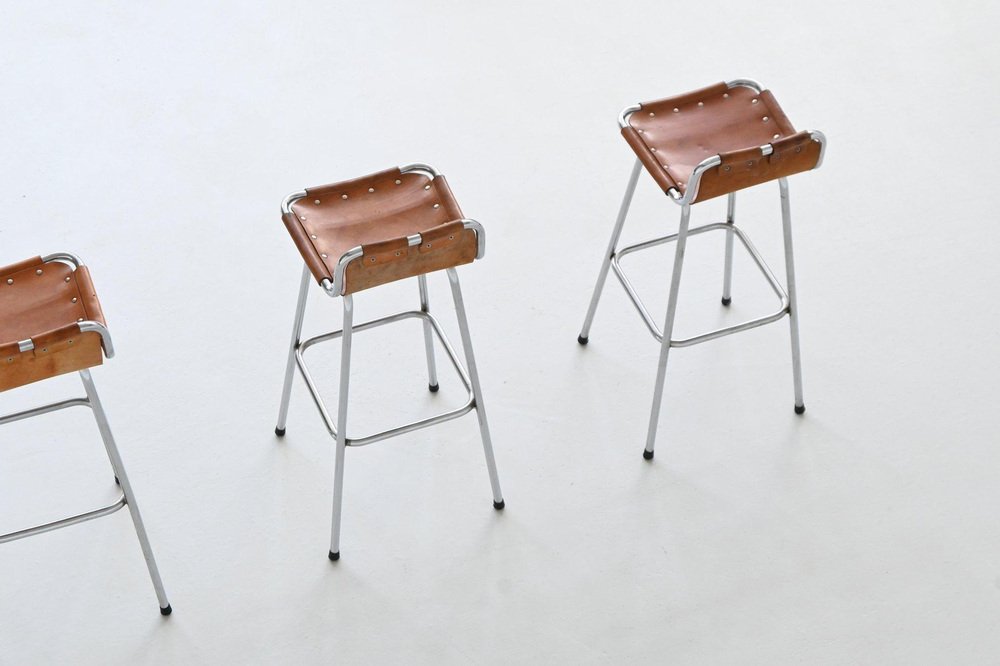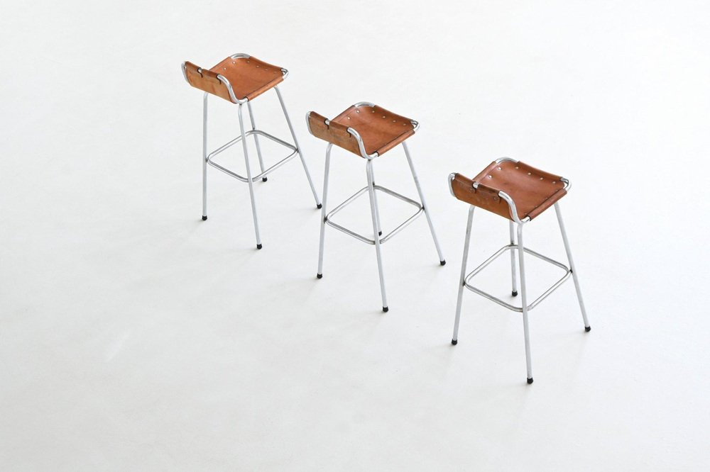 Beautifully shaped set of three bar stools used by Charlotte Perriand for the Les Arcs ski resort in France, 1960. These iconic stools embody a refined balance between rustic charm and industrial elegance, and are among the most sought-after bar stools in design history.