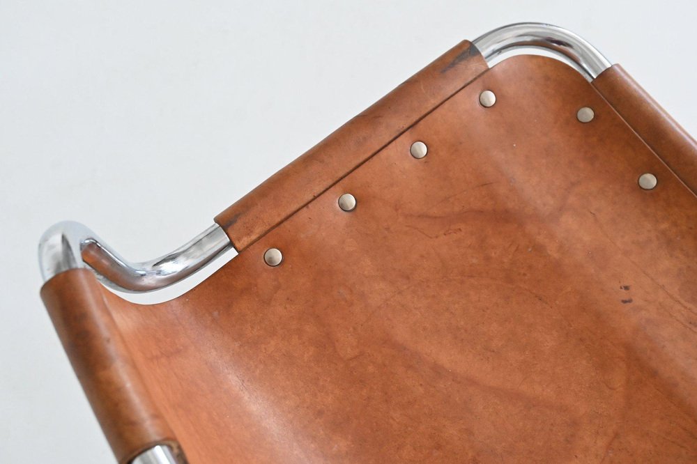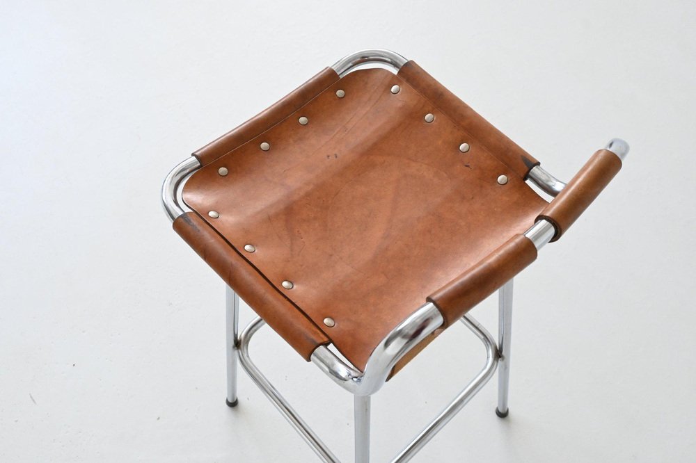 Die Sitze sind aus dickem cognacfarbenem Sattelleder gefertigt, das im Laufe der Zeit reichlich patiniert und mit sichtbaren Nähten und genieteten Details veredelt wurde, was ihren handwerklichen Charakter unterstreicht. Die schlanken, verchromten Rohrrahmen bilden einen modernen Kontrast zur natürlichen Wärme des Leders und sorgen für Stärke und minimales Gewicht.