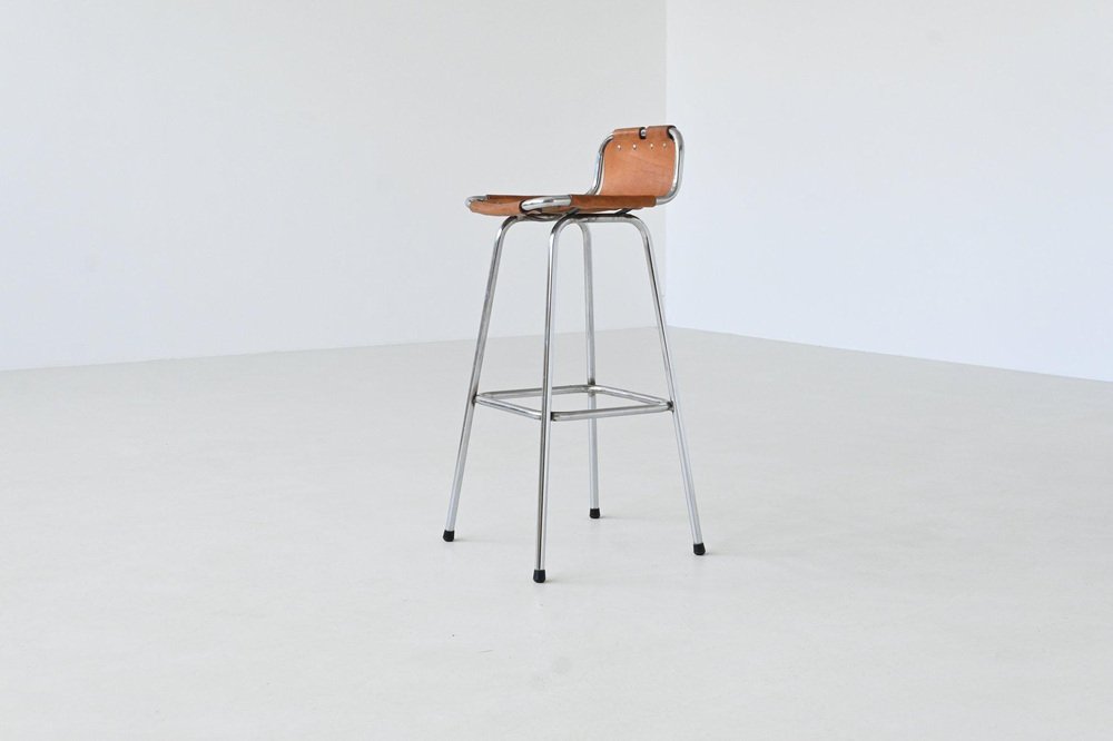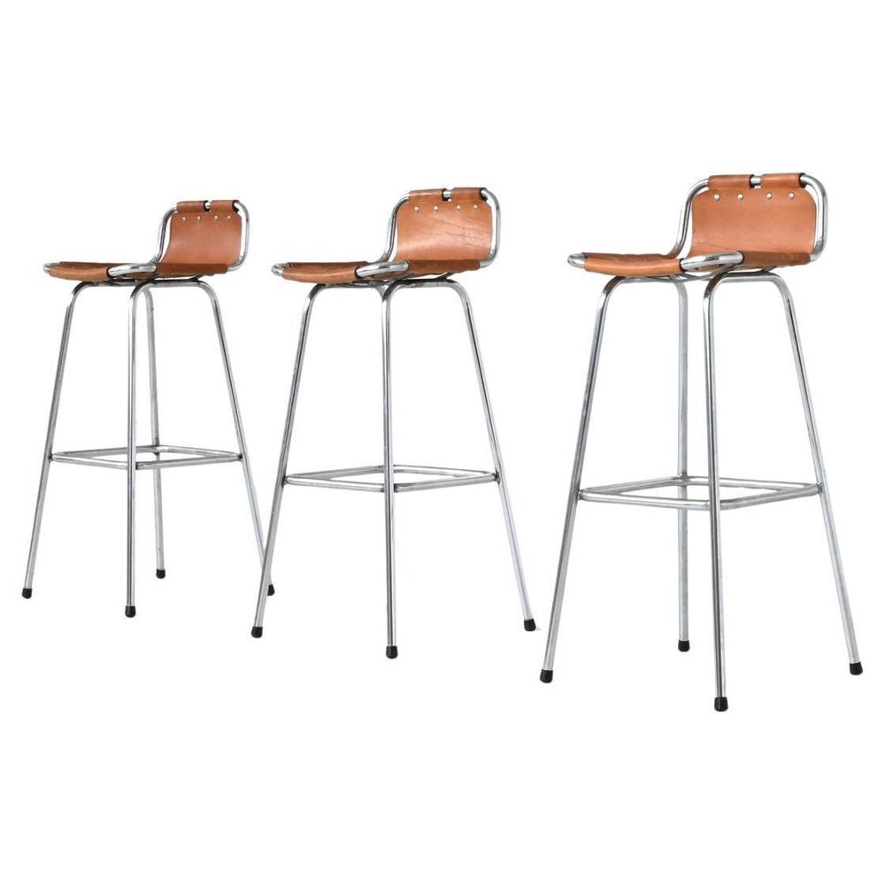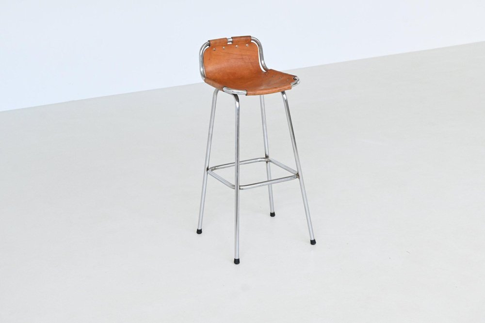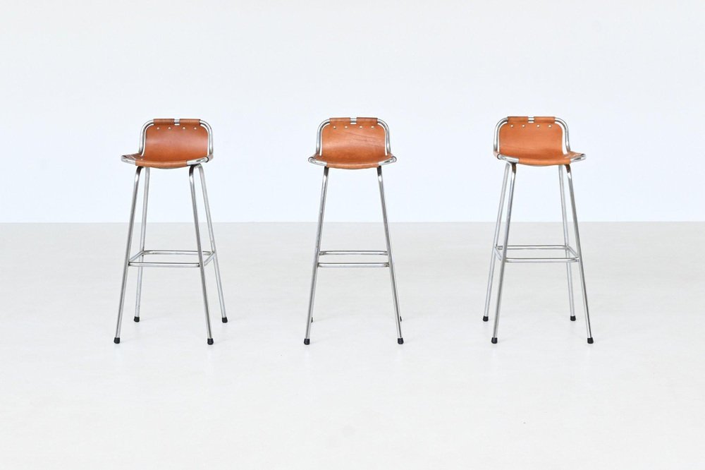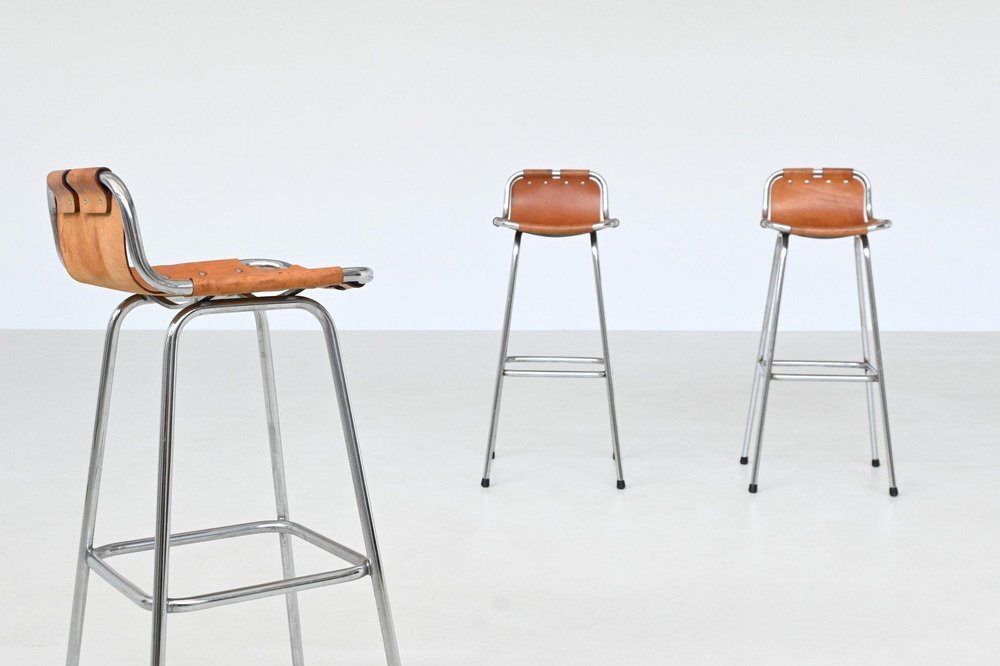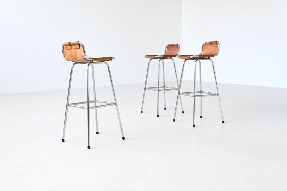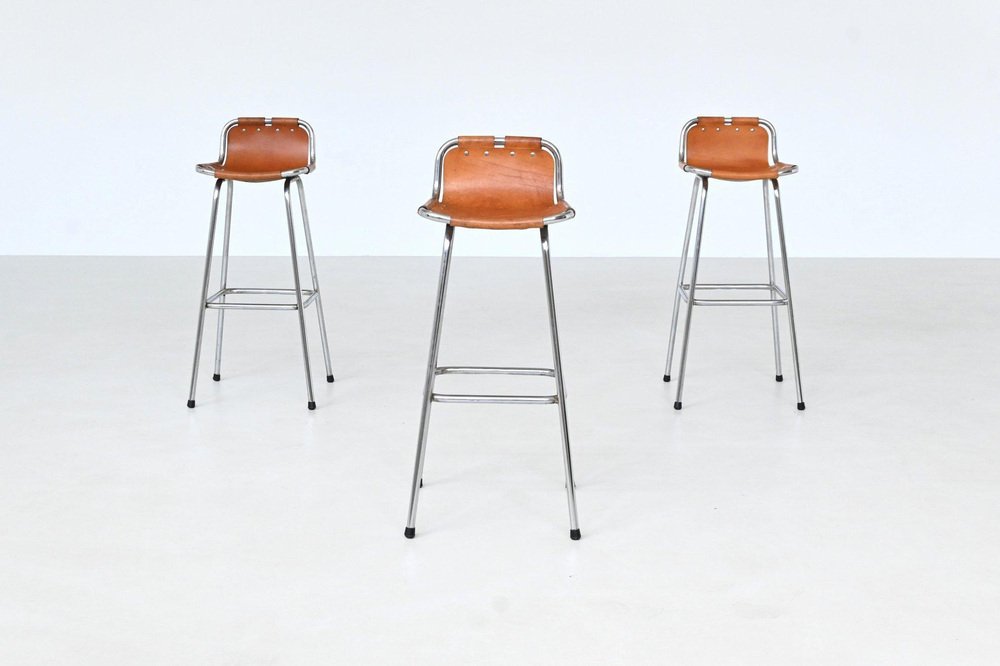 Formschönes Set aus drei Barhockern, das Charlotte Perriand 1960 für das Skigebiet Les Arcs in Frankreich entworfen hat. Diese ikonischen Hocker verkörpern ein raffiniertes Gleichgewicht zwischen rustikalem Charme und industrieller Eleganz und gehören zu den begehrtesten Barhockern der Designgeschichte.