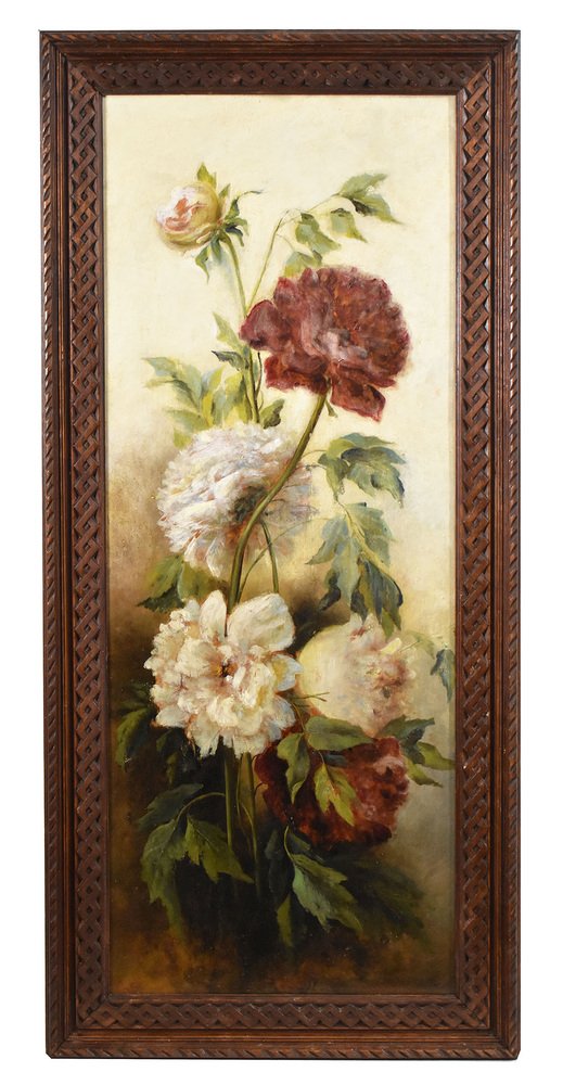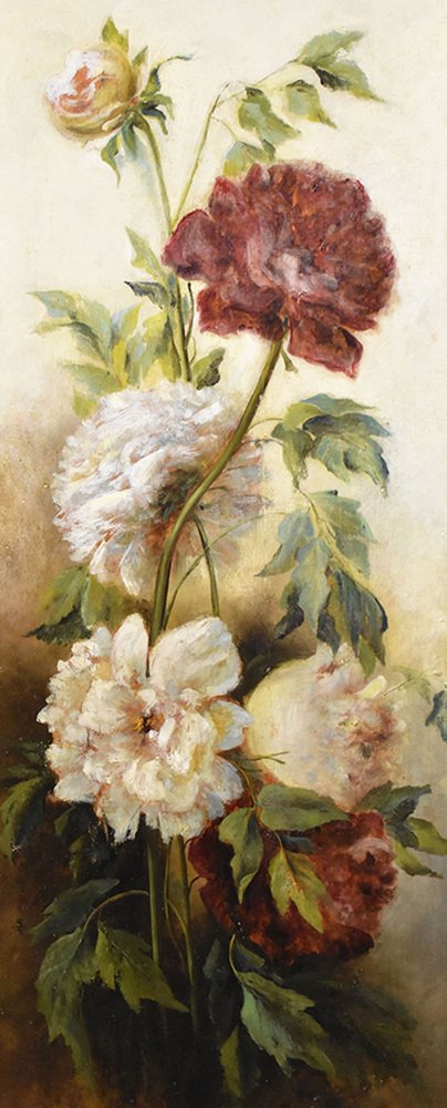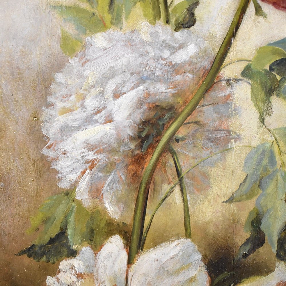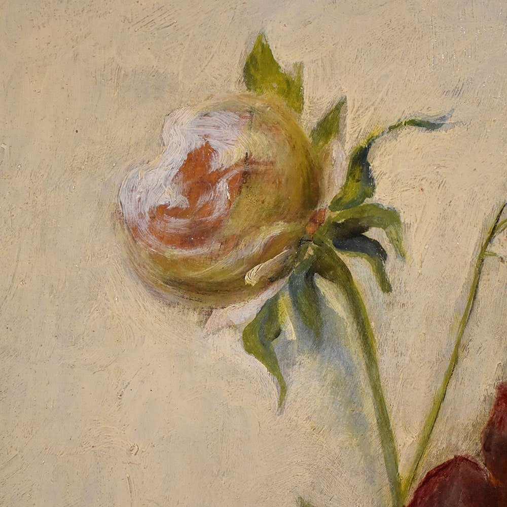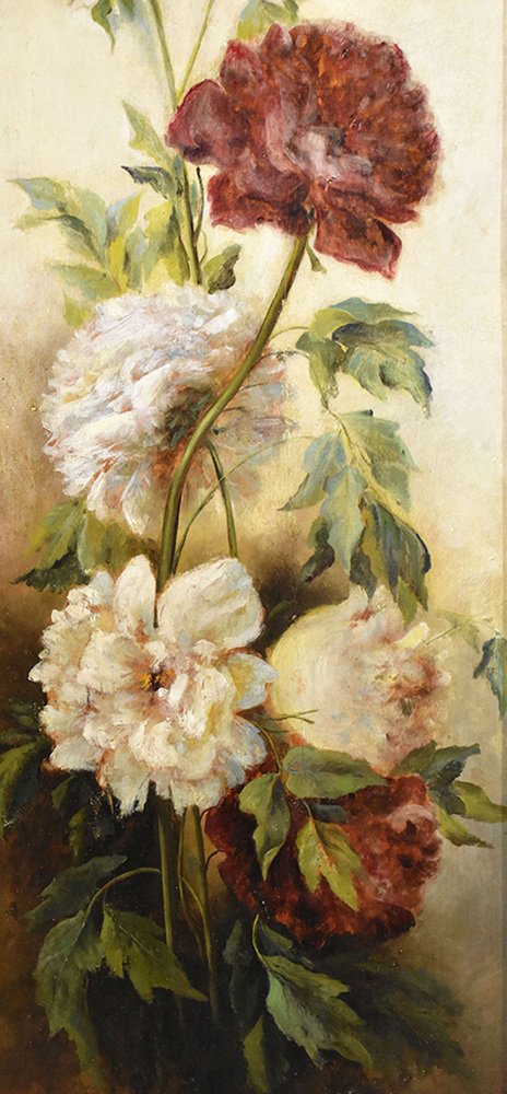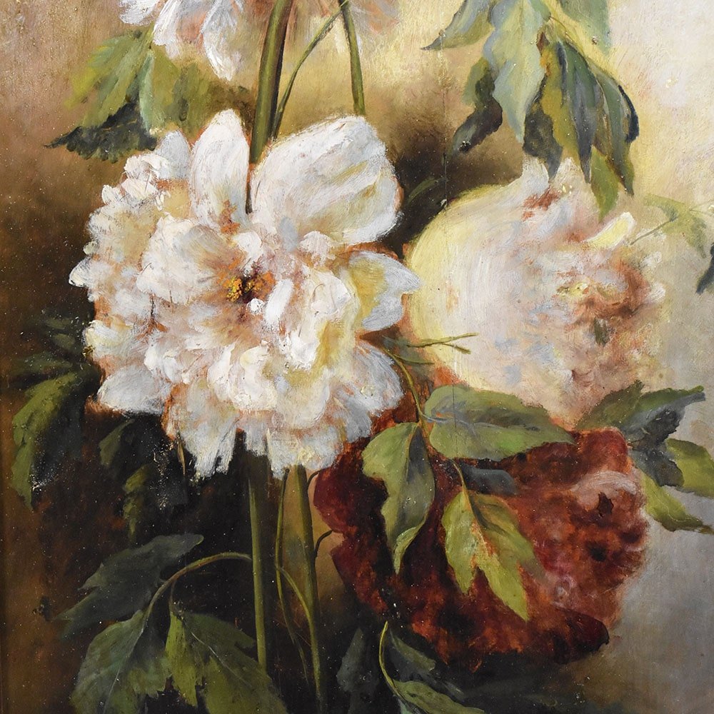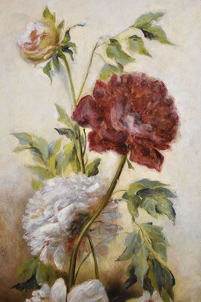 Flowers artwork, antique oil painting, Still Life with Bouquet of Pink Peonies flowers proposed here is an oil painting on wood of the Nineteenth Century. It also has a wood frame.