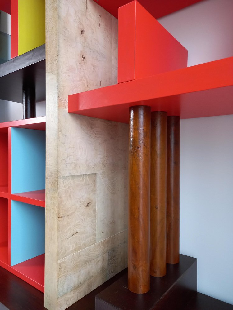 Wenge base, vertical central element in burl wood, square cabinet and volumes painted in red, light blue, yellow, black, and pink; columns stained wenge and cherry; blue glass.