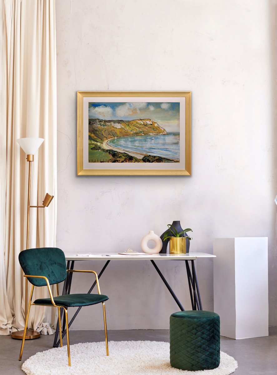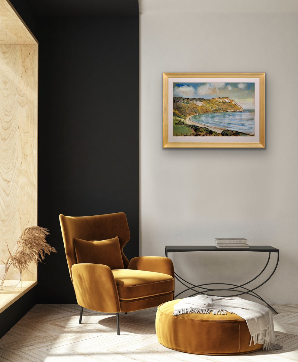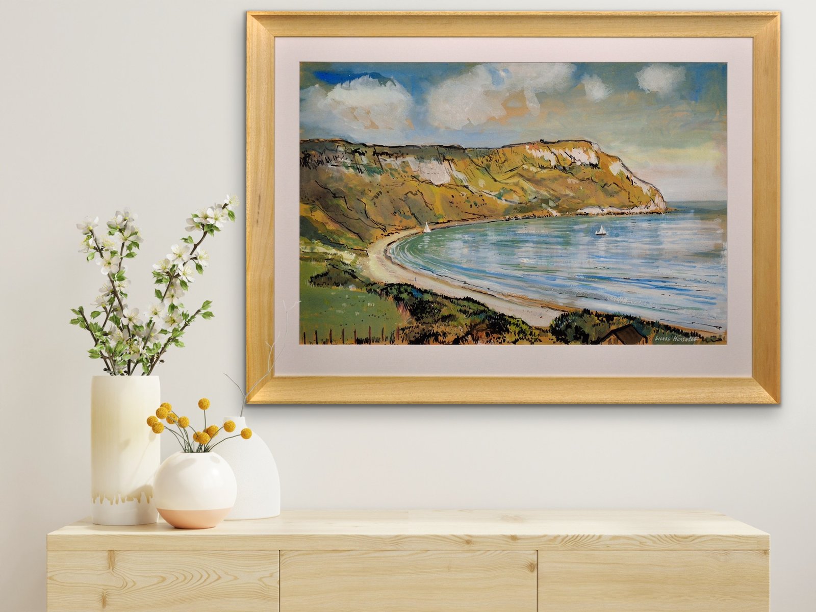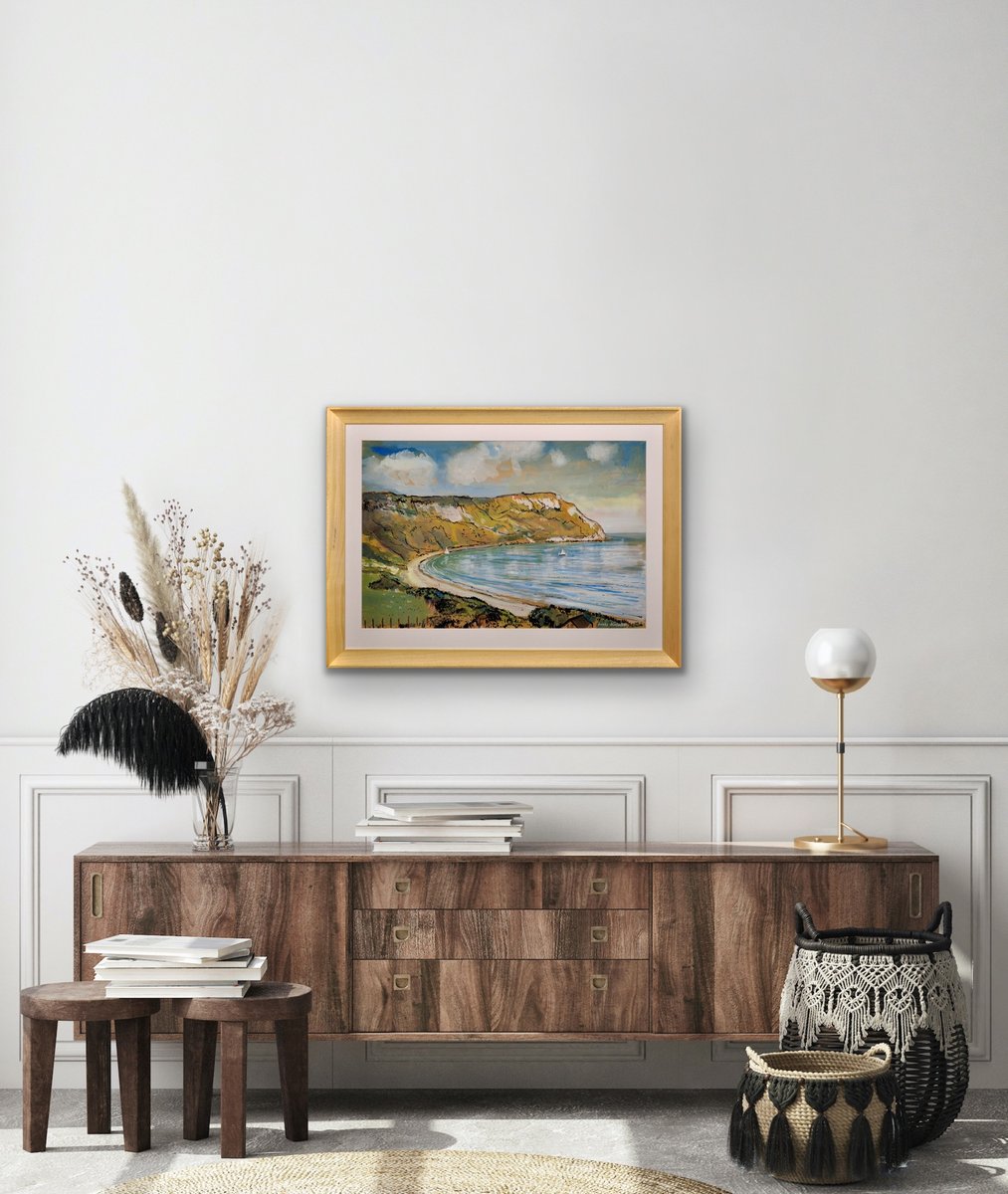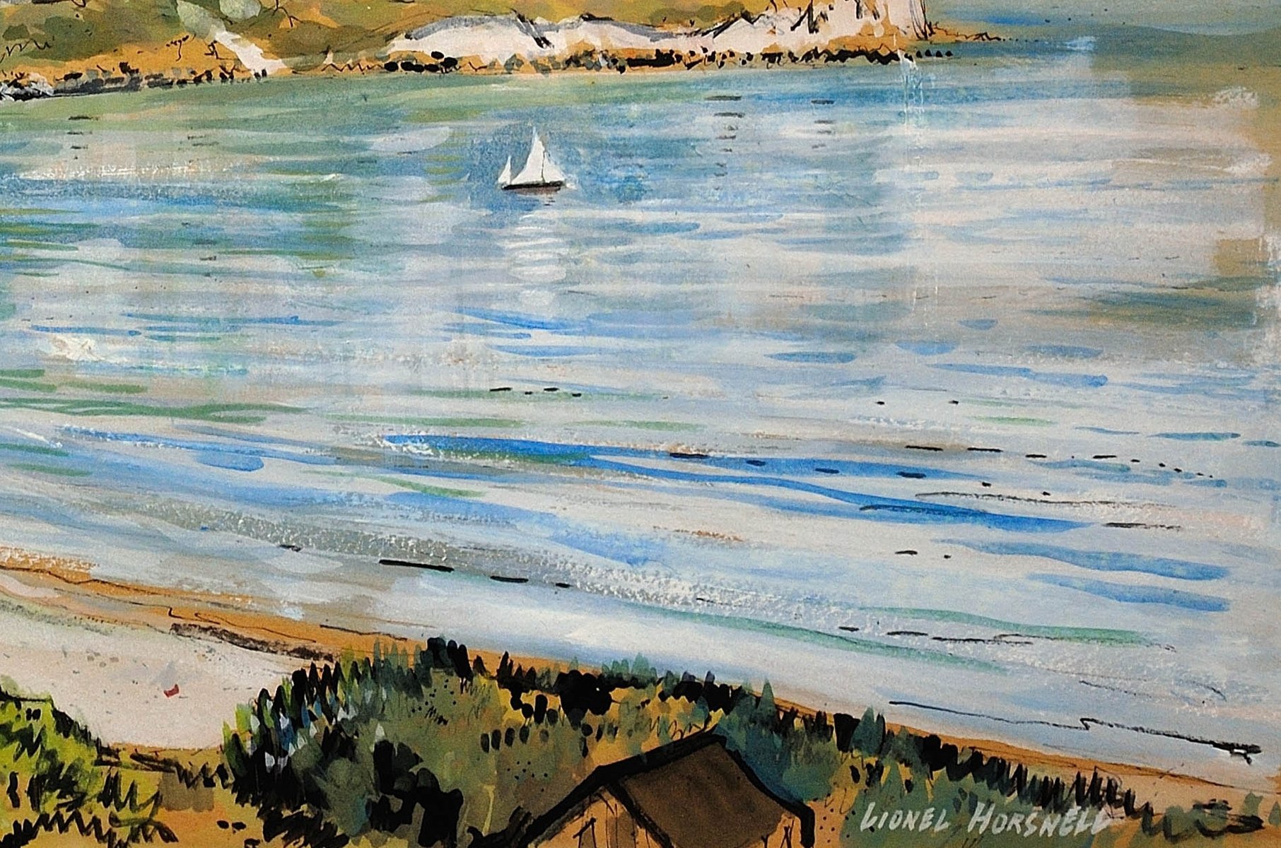 This original painting by Lionel Horsnell is watercolour on buff paper and heightened in white. It is signed in the lower right section and depicts Ringstead Bay on the famous Jurassic Coast of Dorset, near Weymouth, towards the Purbecks. The chalk cliffs of White Nothe roll down to the edge of the sea. There is a glimpse of a fence and the top of a cottage in the foreground, and a pair of small yachts in the bay, with white sails. The beach is practically deserted. The palette is warm and muted and overall this is a delightful image of a summer’s day in a place of peace and beauty.