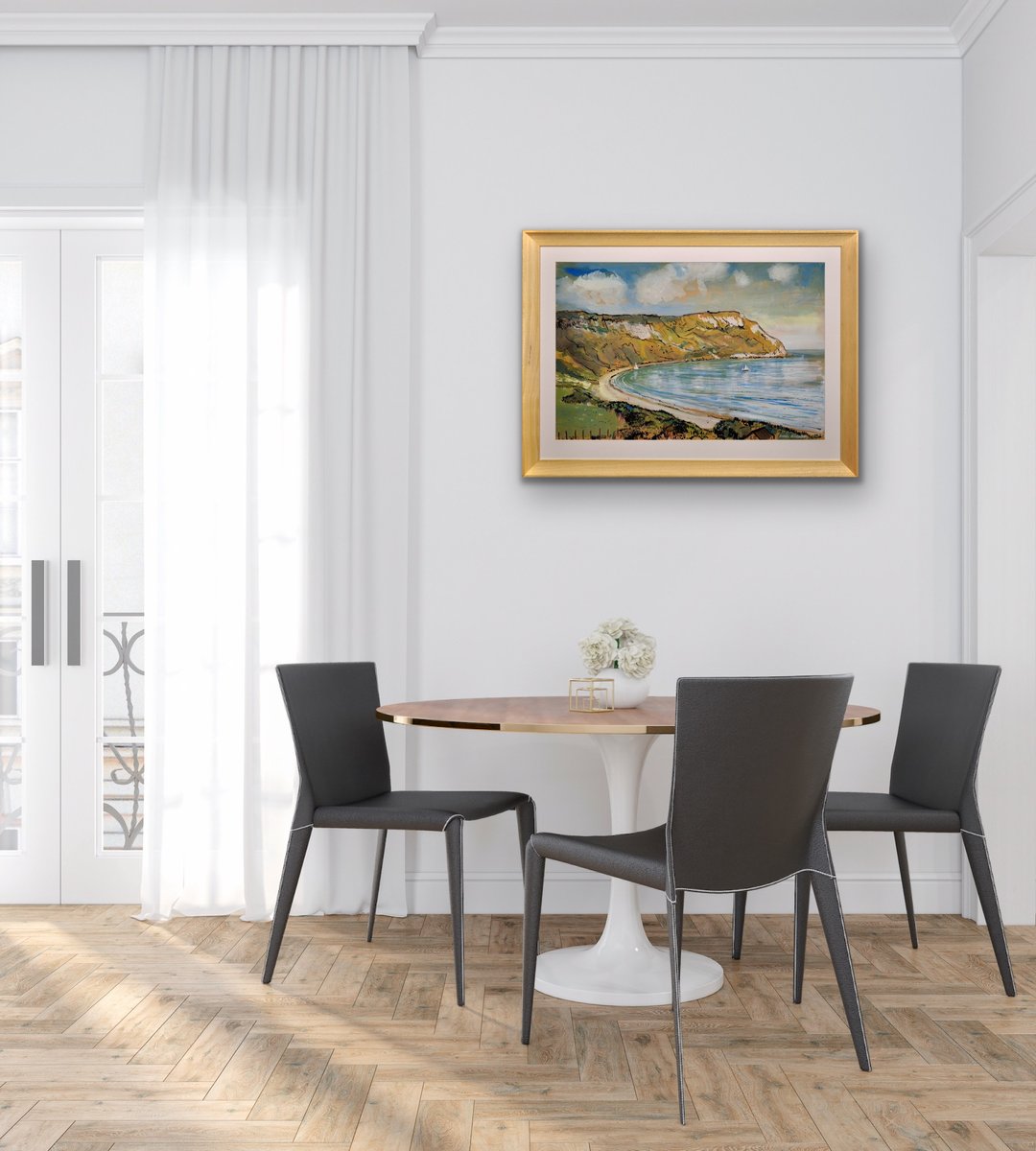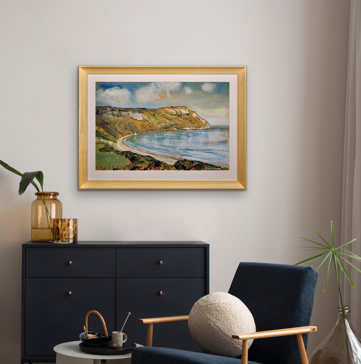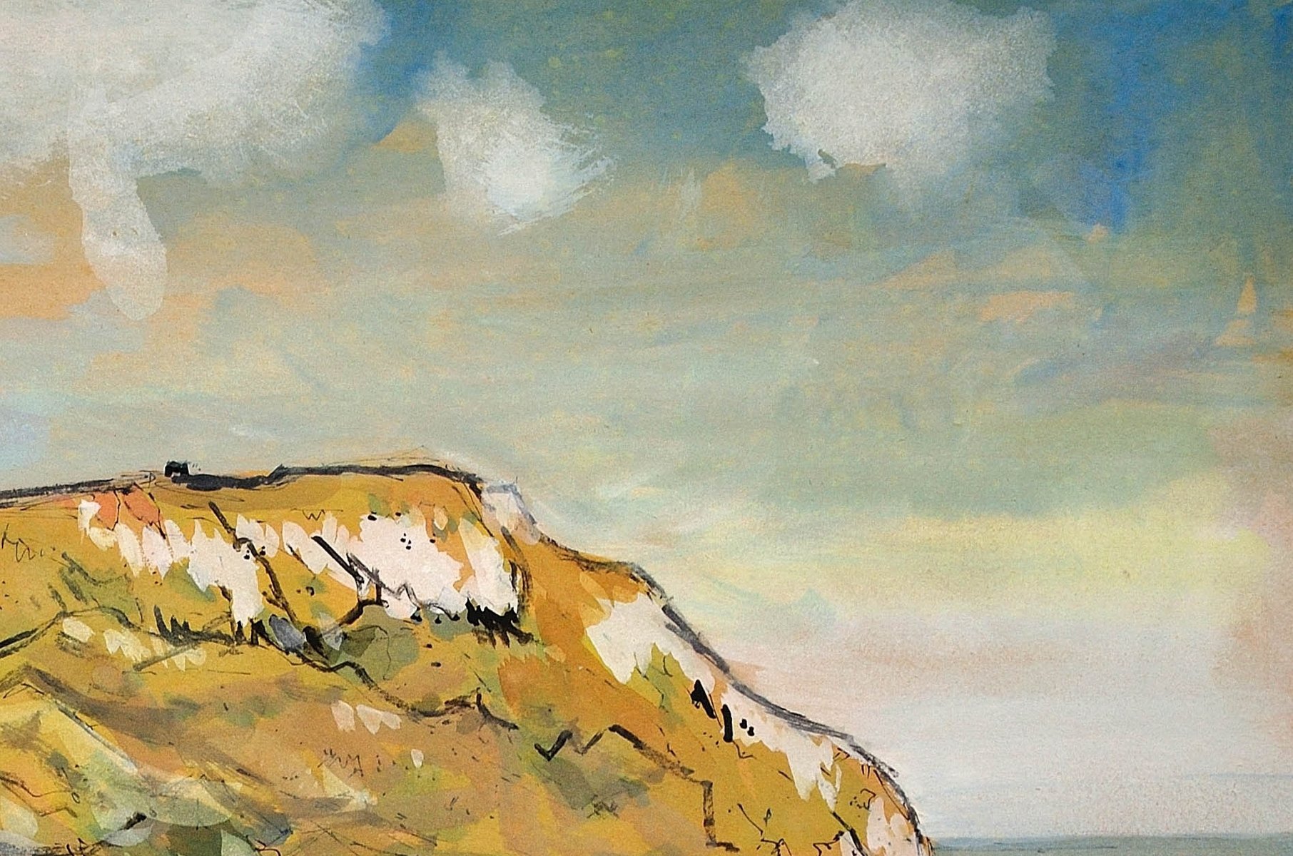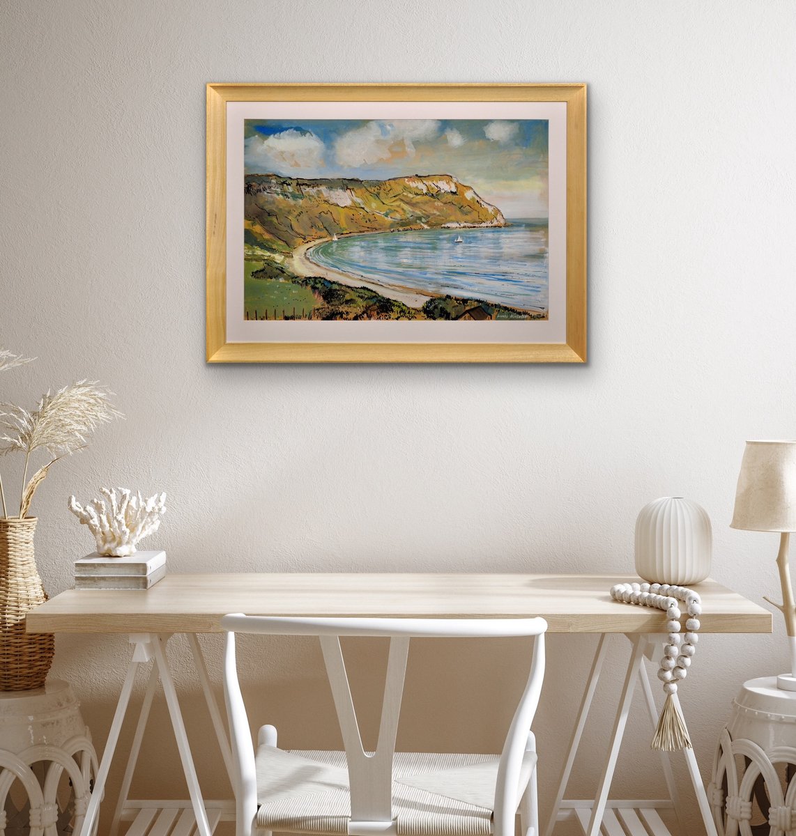 This original painting by Lionel Horsnell is watercolour on buff paper and heightened in white. It is signed in the lower right section and depicts Ringstead Bay on the famous Jurassic Coast of Dorset, near Weymouth, towards the Purbecks. The chalk cliffs of White Nothe roll down to the edge of the sea. There is a glimpse of a fence and the top of a cottage in the foreground, and a pair of small yachts in the bay, with white sails. The beach is practically deserted. The palette is warm and muted and overall this is a delightful image of a summer’s day in a place of peace and beauty.