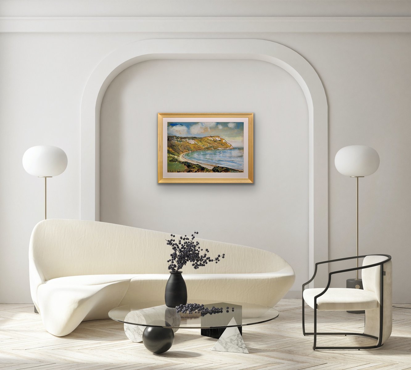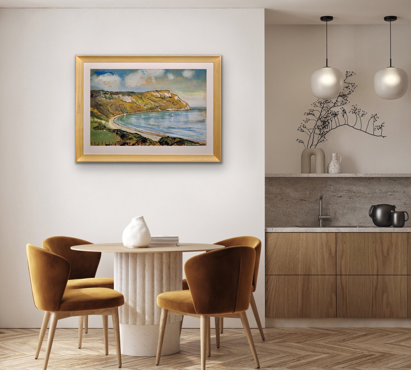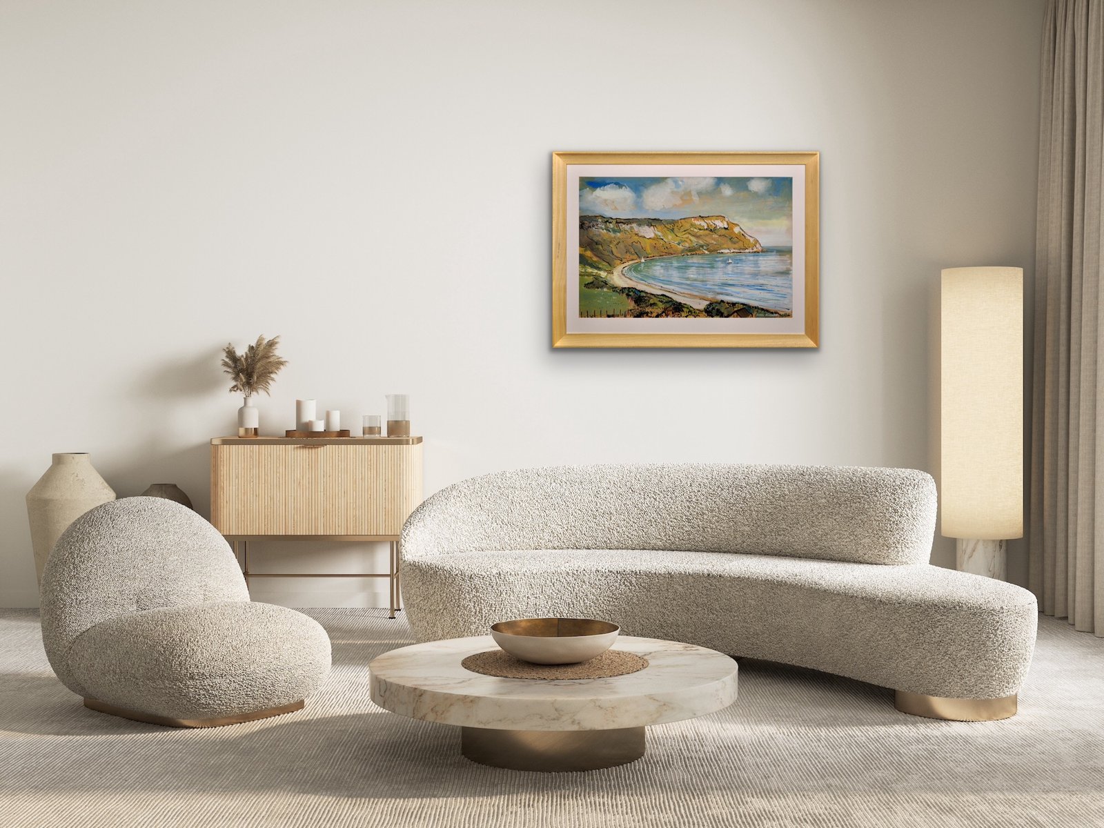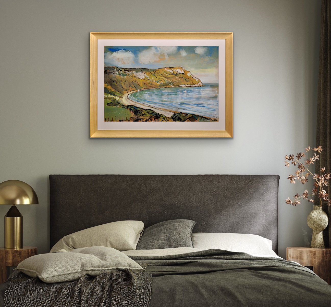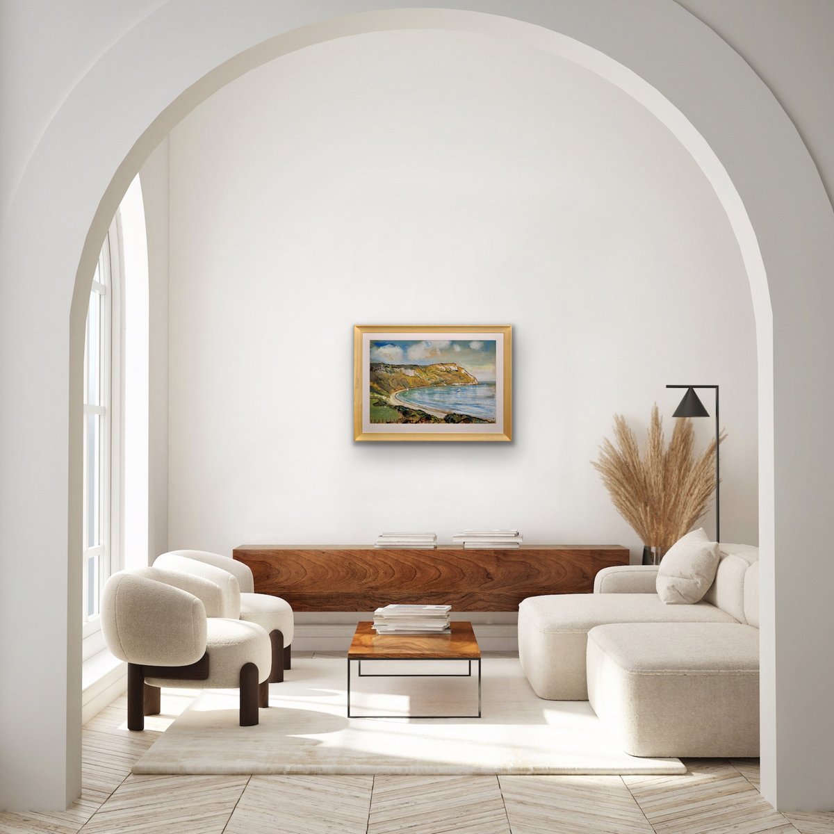 This original painting by Lionel Horsnell is watercolour on buff paper and heightened in white. It is signed in the lower right section and depicts Ringstead Bay on the famous Jurassic Coast of Dorset, near Weymouth, towards the Purbecks. The chalk cliffs of White Nothe roll down to the edge of the sea. There is a glimpse of a fence and the top of a cottage in the foreground, and a pair of small yachts in the bay, with white sails. The beach is practically deserted. The palette is warm and muted and overall this is a delightful image of a summer’s day in a place of peace and beauty.