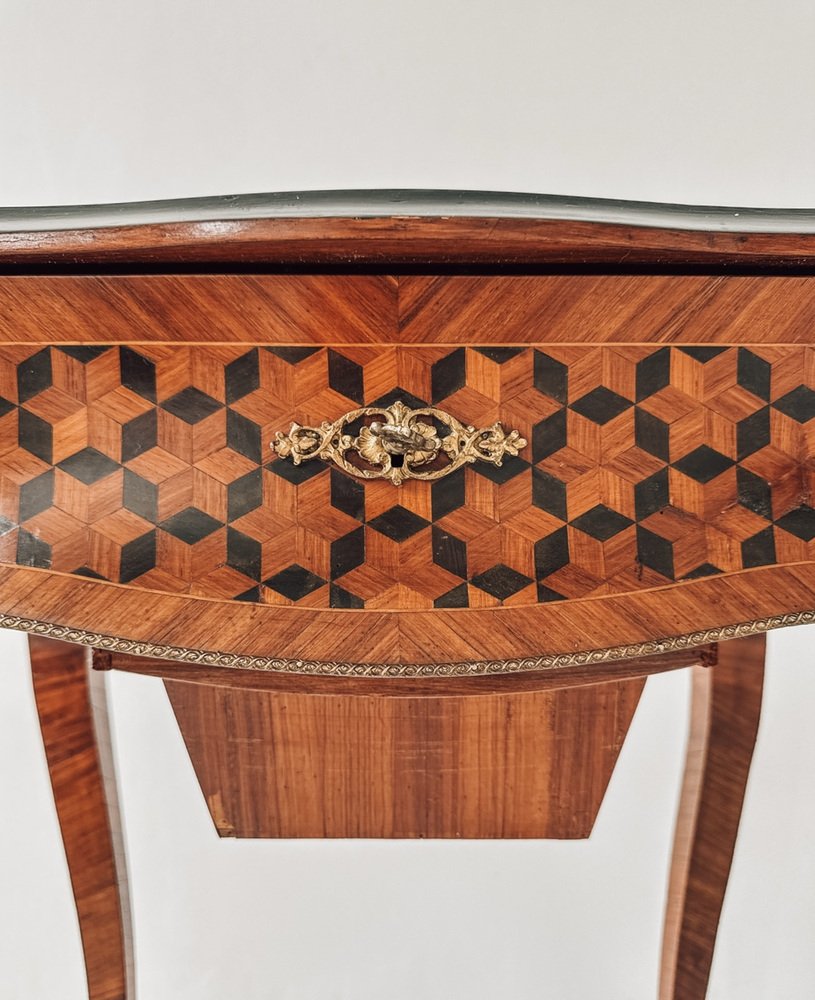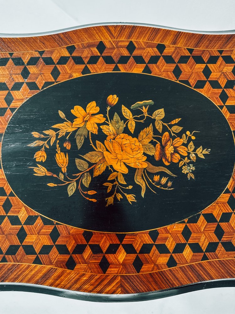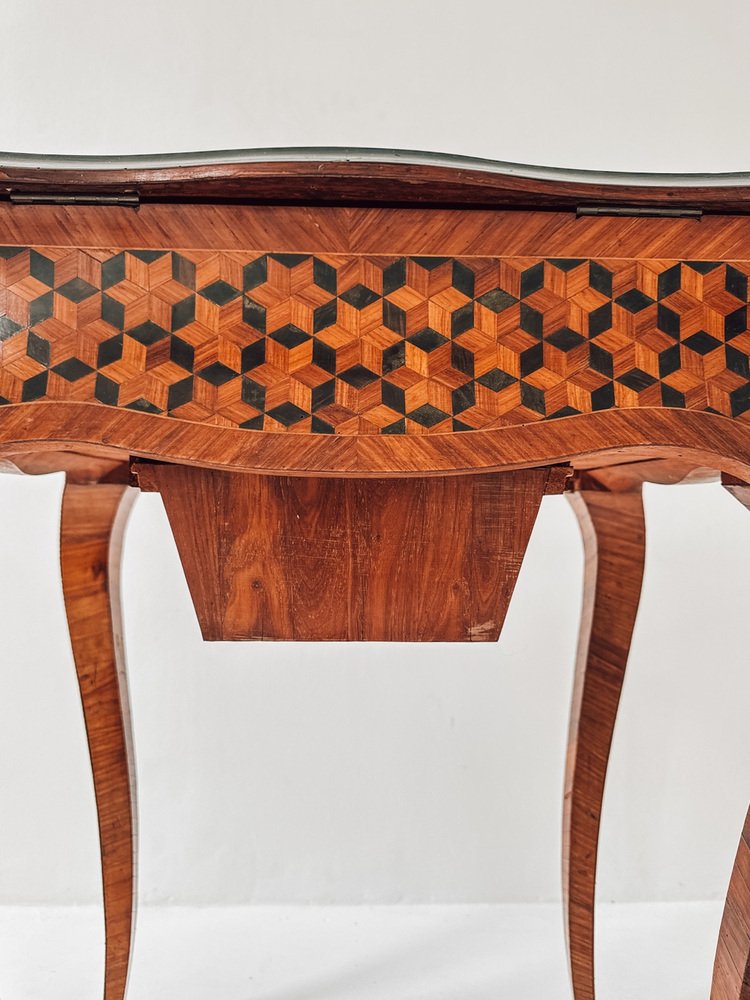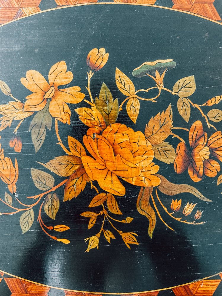 Die Platte weist eine bemerkenswerte geometrische Intarsie auf, die ein florales Intarsienmedaillon einrahmt - eine perfekte Mischung aus romantischem Detail und optischer Tiefe. Im Inneren befinden sich ein wunderschön erhaltener Spiegel und ein Stauraum mit Fächern, ideal für Schmuck, Parfüm oder kleine Andenken.
