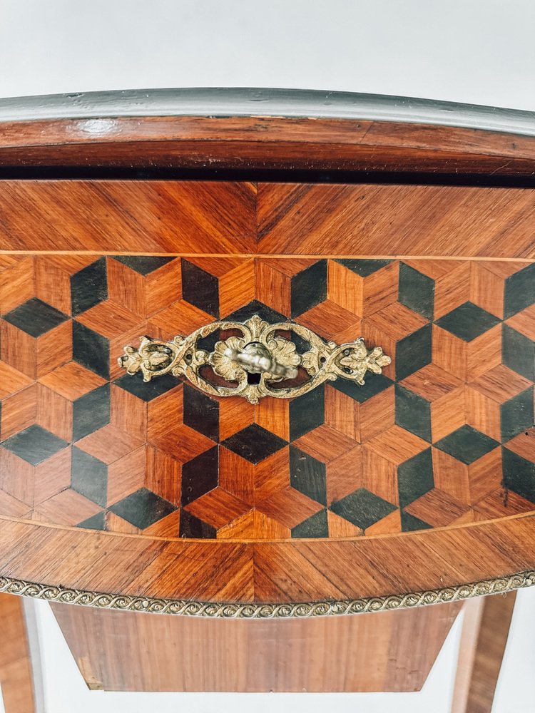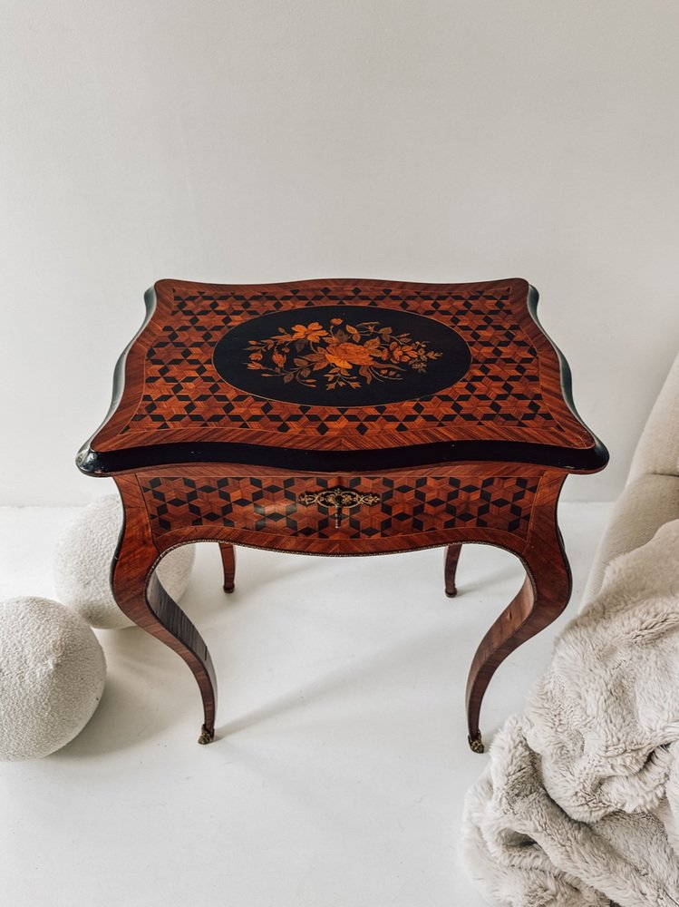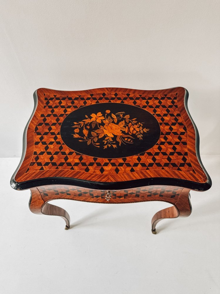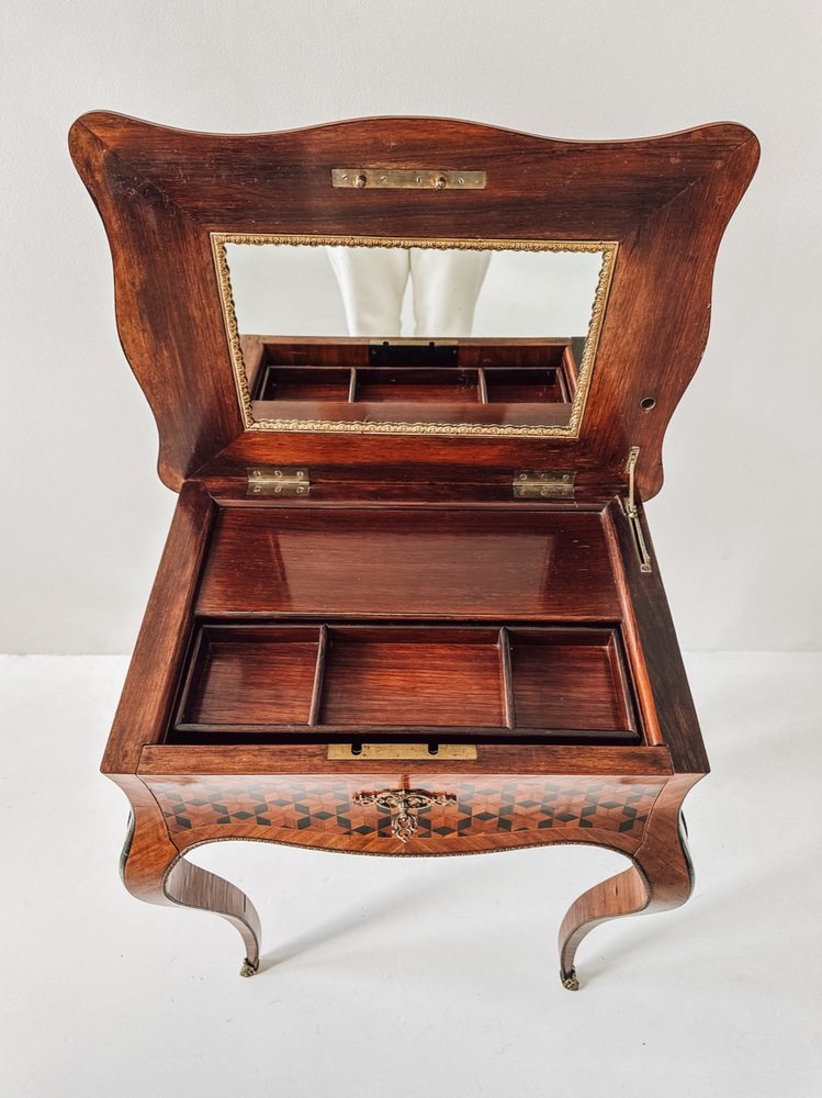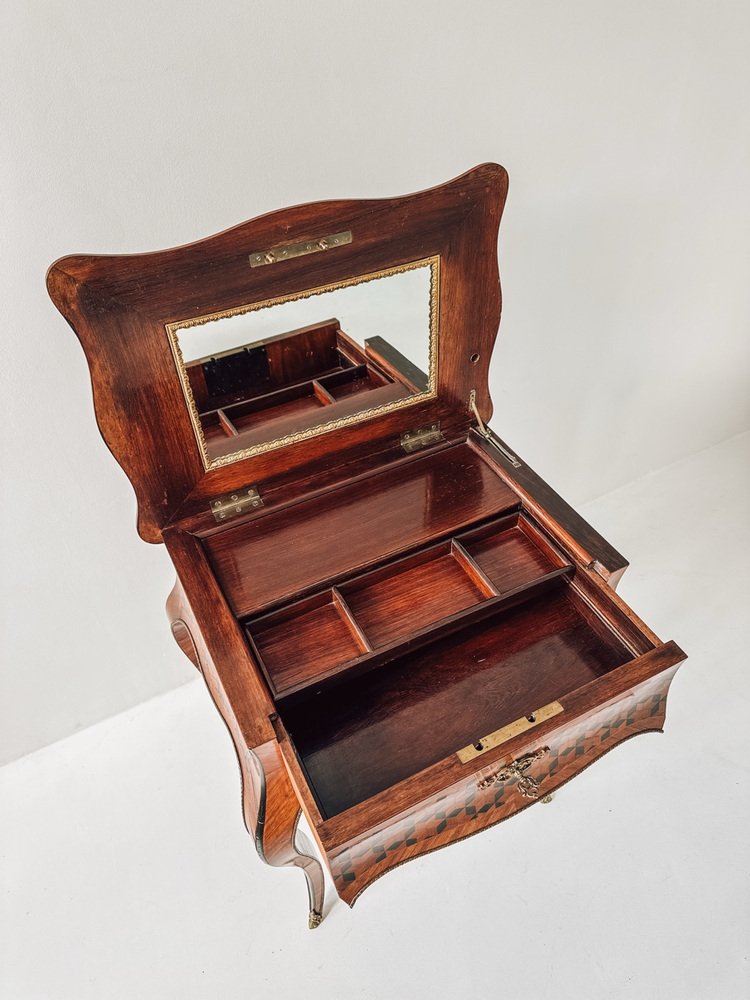 The top features a remarkable geometric inlay, framing a floral marquetry medallion — a perfect blend of romantic detail and optical depth. Inside, you’ll find a beautifully preserved mirror and a compartmentalized storage area, ideal for jewelry, perfumes, or small keepsakes.