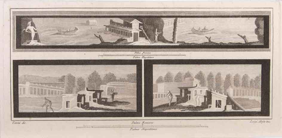 Landscape with Monuments and Figures is an Etching realized by Luigi Aloja (1783-1837). The etching belongs to the print suite “Antiquities of Herculaneum Exposed” (original title: “Le Antichità di Ercolano Esposte”), an eight-volume volume of engravings of the finds from the excavation of the ruins of Herculaneum in the Kingdom of Naples (now Campania, Italy). It was published between 1757 and 1792 by the Regia Stamperia, and copies were delivered to selected recipients across Europe. Despite the title, the Antiquity of Herculaneum shows objects from all the excavations undertaken by the Bourbons in the Gulf of Naples. These include Pompeii, Stabia and two sites of Herculaneum: Resina and Portici. The Bourbon King Carlo appointed fifteen scholars creating a new “Herculaneum Academy” to study the artifacts and publish the results of the archaeological excavations of the sites. The engravings are of high quality and the accompanying text shows a large scholarship. They were realized by 25 prominent artists involved by the King to prepare drawings and engravings on the finds, among which we can find Giovanni Elia Morghen, Carlo Nolli, Luigi Vanvitelli and Giovanni Battista Casanova. The “Antiquities” was designed more to amaze readers with the quality of the objects in the collection of the King of Naples than to be used in research., following and increasing the interest of 18th century society for the classical culture and Art in particular. Through the exaltation of the classical concept of proportions and harmony, the book was of inspiration to the neoclassical movement in Europe, giving artists and decorators access to a huge shop of Hellenistic motifs. Ref.: National Gallery (Washington), Mark J. Millard Architectural, IV (2000), no. 1; L. Garcia y Garcia, Nova bibliotheca pompeiana (2 v., 1998); Royal Institute of British Architects, British Architectural Library ... Early printed books, 1 (1994), no. 112. U. Pannuti, 'Incisori e disegnatori della Stamperia Reale di Napoli nel secolo XVIII: la pubblicazione delle Antichità di Ercolano', in Xenia antiqua, 9 (2000), p. 151-178; V. Trombetta, 'L'edizione de Le Antichità di Ercolano esposte' in Rendiconti dell'Accademia di Archeologia, lettere e belle arti di Napoli , 59 (1984), p.151-172.