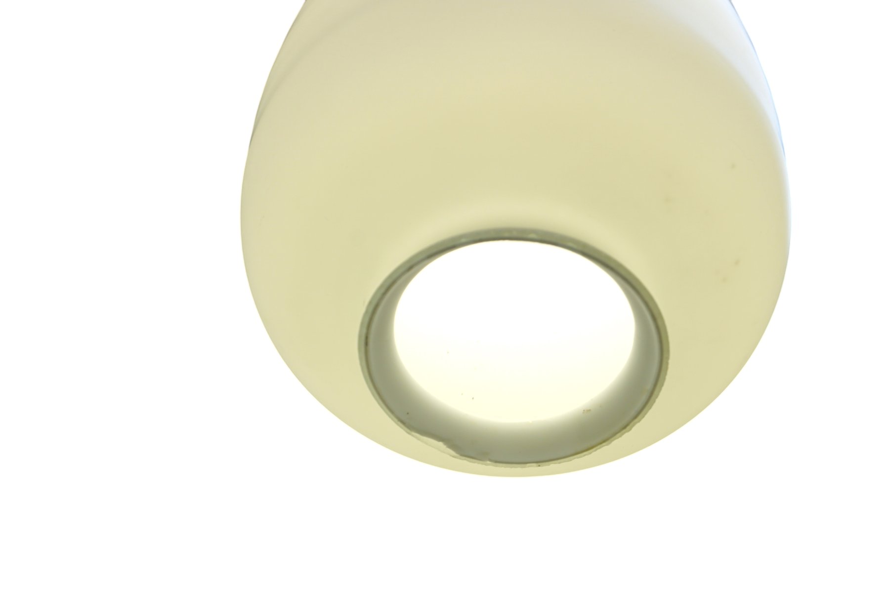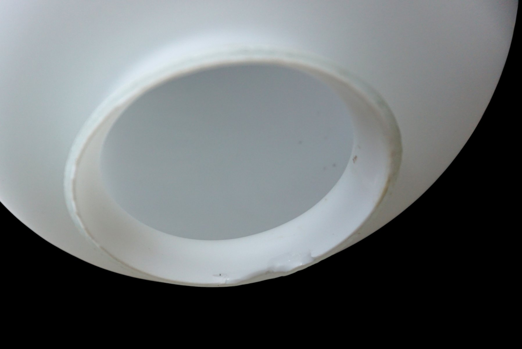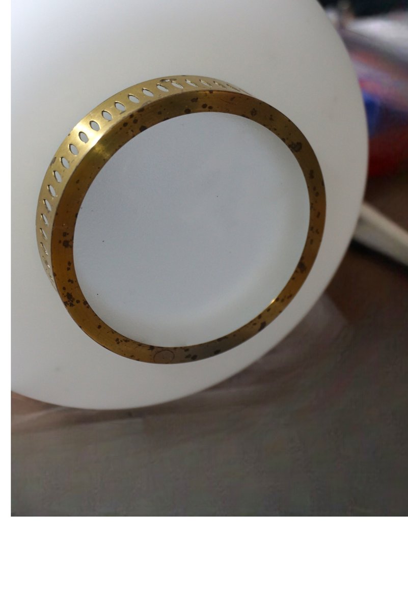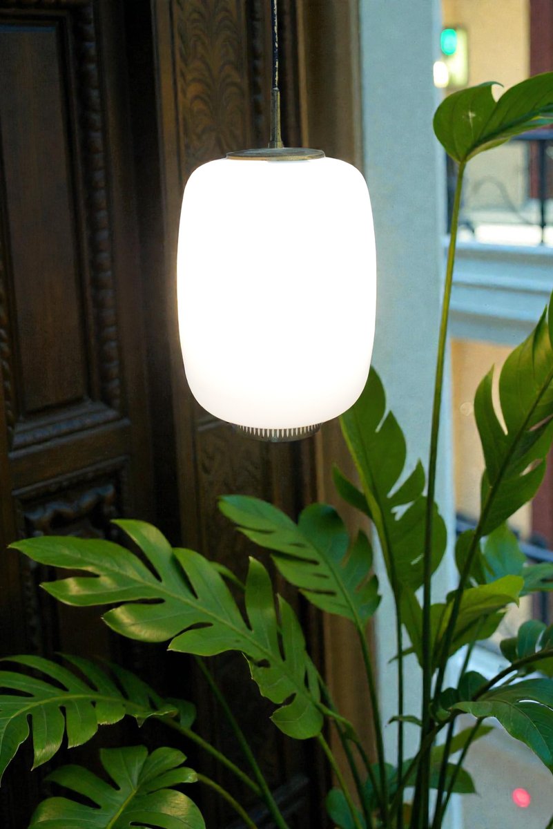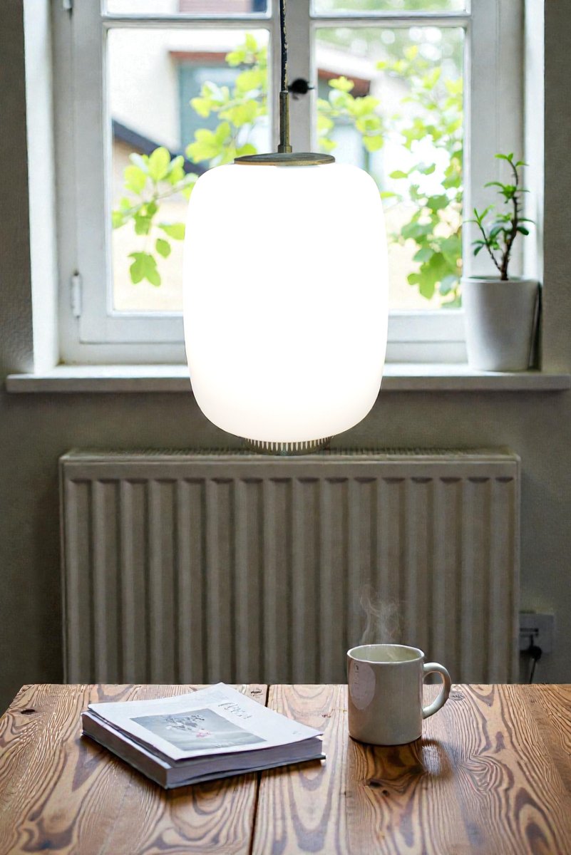 Skandinavische Mid-Century-Pendelleuchte „Mandalay“ von Sigvard Bernadotte für Nordisk Solar, Dänemark, Entwurf 1953: Seltene dänische Vintage-Hängelampe aus den 1950er Jahren mit elegant tropfenförmigem Schirm aus satiniertem Opalglas und warm patiniertem Messing, perfekt als stilvoller Blickfang über Esstisch, Kücheninsel oder im Wohnbereich. Das sanft diffuse Licht des Opalglases sorgt für eine gleichmäßige, blendfreie Ausleuchtung und unterstreicht die organische Silhouette, die typisch für die skandinavische Nachkriegsmoderne ist und sich mühelos in Mid-Century-, Scandinavian-Modern- und Contemporary-Interiors integrieren lässt. Die Lampe wurde in Dänemark von Nordisk Solar produziert und verbindet hochwertige Materialien mit der klaren, funktionalen Formensprache des nordischen Designs – ideal für Designliebhaber, Sammler und Interior Profis, die ein authentisches Original mit Geschichte suchen. Hinweis: Altersgemäße Patina auf dem Metall unterstreicht den Vintage-Charakter.