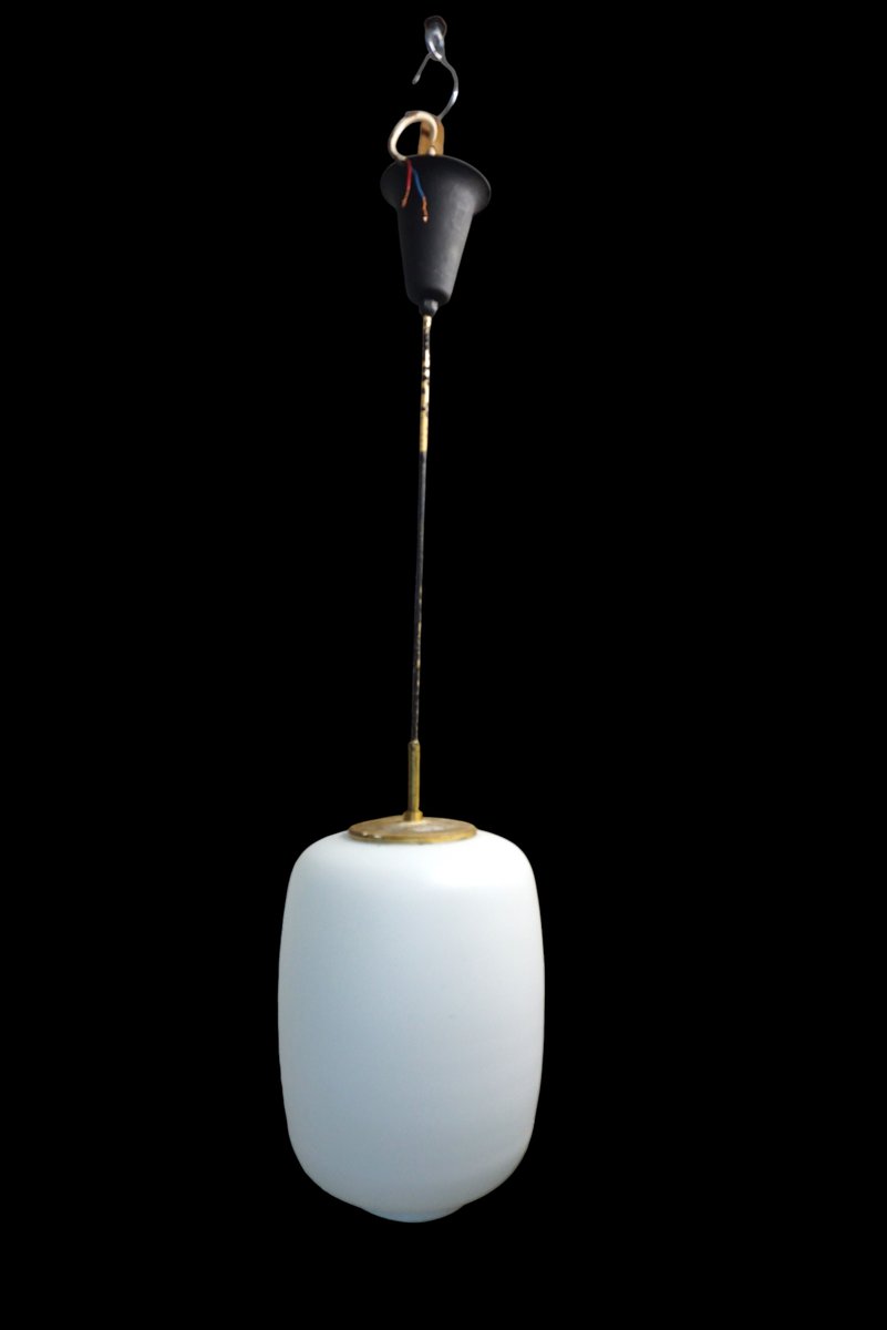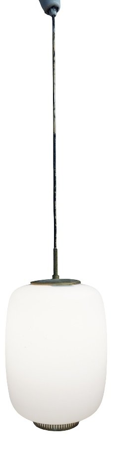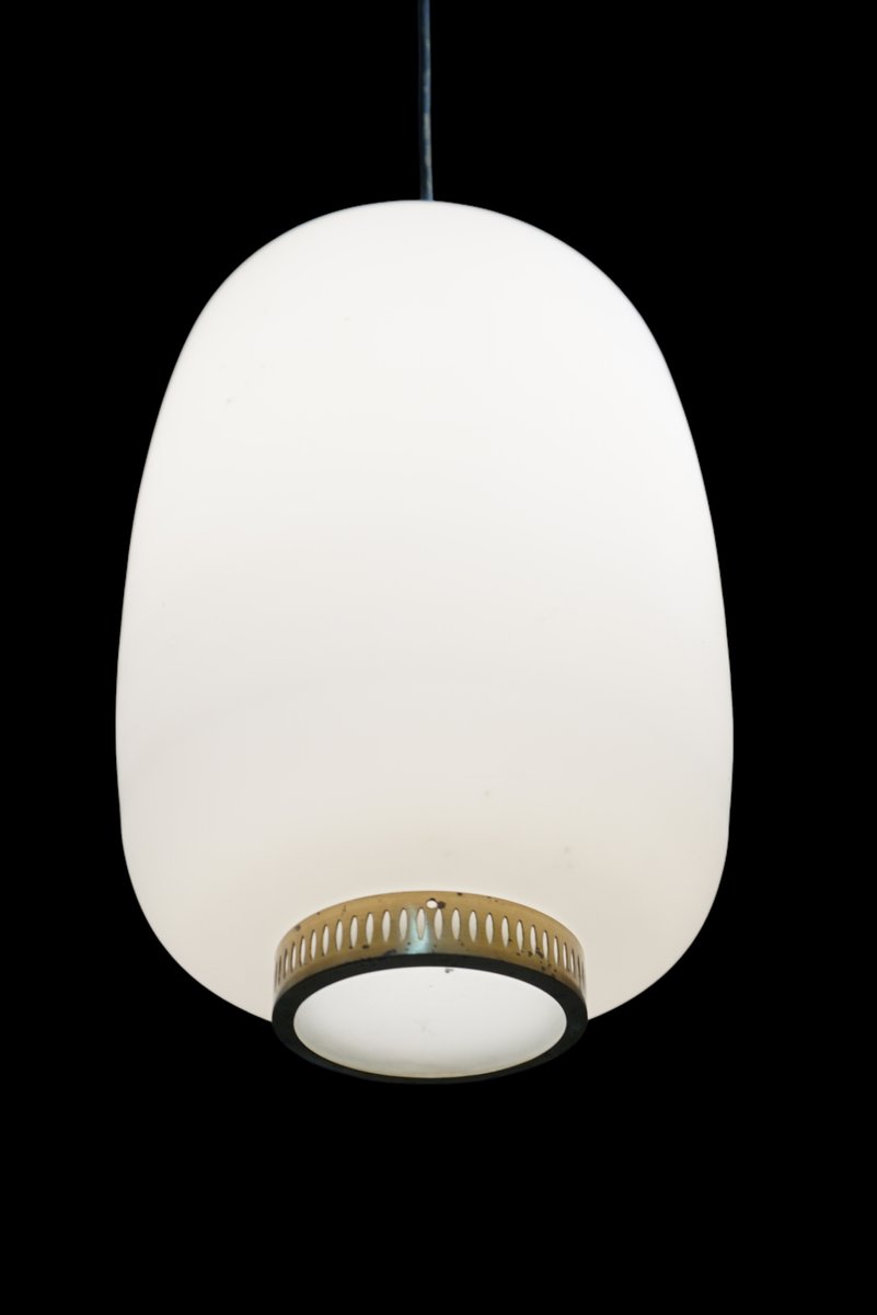 Scandinavian Mid-Century pendant lamp "Mandalay" by Sigvard Bernadotte for Nordisk Solar, Denmark, designed in 1953: A rare vintage Danish pendant lamp from the 1950s with an elegant teardrop-shaped shade made of frosted opal glass and warmly patinated brass, perfect as a stylish focal point above a dining table, kitchen island, or in a living area. The softly diffused light from the opal glass provides even, glare-free illumination and accentuates the organic silhouette, typical of post-war Scandinavian modernism, which integrates effortlessly into mid-century, Scandinavian modern, and contemporary interiors. Produced in Denmark by Nordisk Solar, the lamp combines high-quality materials with the clean, functional design language of Nordic design – ideal for design enthusiasts, collectors, and interior professionals seeking an authentic original with a story to tell. Note: Age-related patina on the metal emphasizes its vintage character. The electrical wiring is only two-wire, which is typical for a production date of the 1950s.