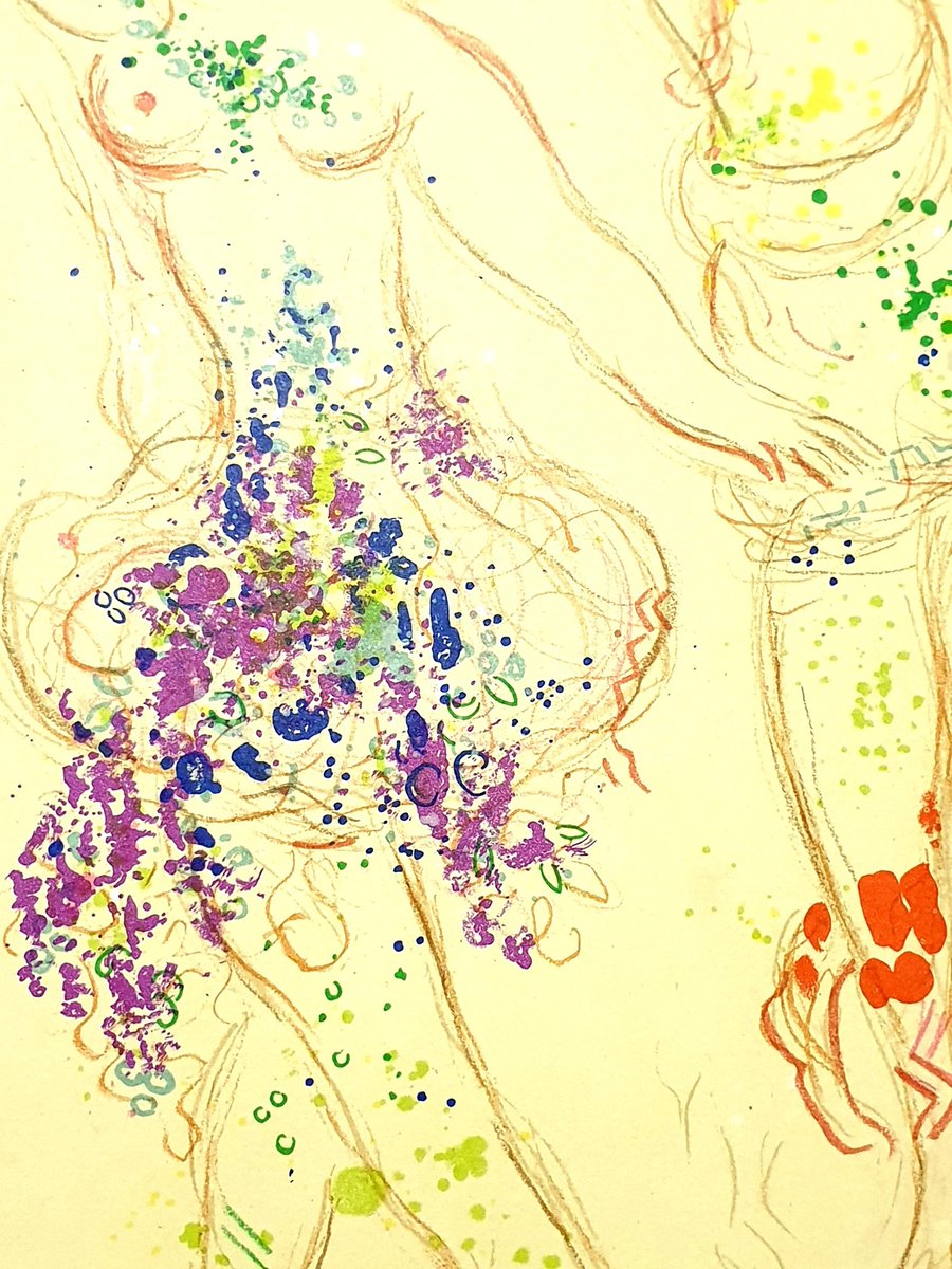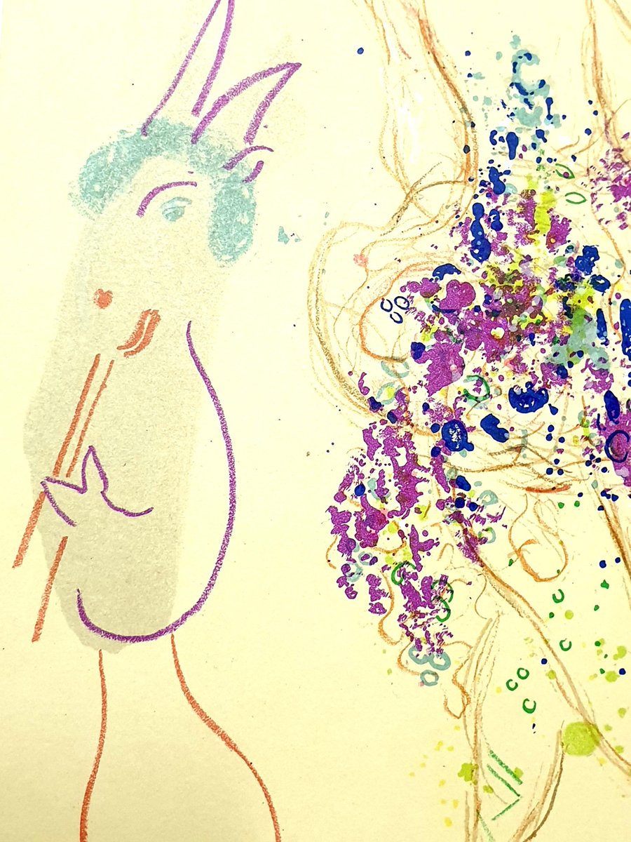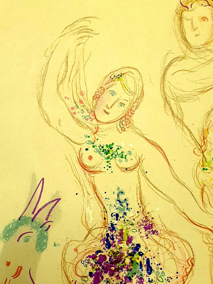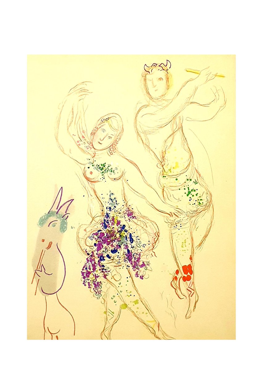 Marc Chagall - Dahnis and Chloé - Original Lithograph 1969 Printed by Mourlot Dimensions: 35 x 25 cm Publisher: Société Internationale d'Art. XXe siècle, Paris Reference: Mourlot n° 581 Marc Chagall (born in 1887) Marc Chagall was born in Belarus in 1887 and developed an early interest in art. After studying painting, in 1907 he left Russia for Paris, where he lived in an artist colony on the city’s outskirts. Fusing his own personal, dreamlike imagery with hints of the fauvism and cubism popular in France at the time, Chagall created his most lasting work—including I and the Village (1911)—some of which would be featured in the Salon des Indépendants exhibitions. After returning to Vitebsk for a visit in 1914, the outbreak of WWI trapped Chagall in Russia. He returned to France in 1923 but was forced to flee the country and Nazi persecution during WWII. Finding asylum in the U.S., Chagall became involved in set and costume design before returning to France in 1948. In his later years, he experimented with new art forms and was commissioned to produce numerous large-scale works. Chagall died in St.-Paul-de-Vence in 1985. The Village Marc Chagall was born in a small Hassidic community on the outskirts of Vitebsk, Belarus, on July 7, 1887. His father was a fishmonger, and his mother ran a small sundries shop in the village. As a child, Chagall attended the Jewish elementary school, where he studied Hebrew and the Bible, before later attending the Russian public school. He began to learn the fundamentals of drawing during this time, but perhaps more importantly, he absorbed the world around him, storing away the imagery and themes that would feature largely in most of his later work. At age 19 Chagall enrolled at a private, all-Jewish art school and began his formal education in painting, studying briefly with portrait artist Yehuda Pen. However, he left the school after several months, moving to St. Petersburg in 1907 to study at the Imperial Society for the Protection of Fine Arts. The following year, he enrolled at the Svanseva School, studying with set designer Léon Bakst, whose work had been featured in Sergei Diaghilev's Ballets Russes. This early experience would prove important to Chagall’s later career as well. Despite this formal instruction, and the widespread popularity of realism in Russia at the time, Chagall was already establishing his own personal style, which featured a more dreamlike unreality and the people, places and imagery that were close to his heart. Some examples from this period are his Window Vitebsk (1908) and My Fianceé with Black Gloves (1909), which pictured Bella Rosenfeld, to whom he had recently become engaged. The Beehive Despite his romance with Bella, in 1911 an allowance from Russian parliament member and art patron Maxim Binaver enabled Chagall to move to Paris, France. After settling briefly in the Montparnasse neighborhood, Chagall moved further afield to an artist colony known as La Ruche (“The Beehive”), where he began to work side by side with abstract painters such as Amedeo Modigliani and Fernand Léger as well as the avant-garde poet Guillaume Apollinaire. At their urging, and under the influence of the wildly popular fauvism and cubism, Chagall lightened his palette and pushed his style ever further from reality. I and the Village (1911) and Homage to Apollinaire (1912) are among his early Parisian works, widely considered to be his most successful and representative period. Though his work stood stylistically apart from his cubist contemporaries, from 1912 to 1914 Chagall exhibited several paintings at the annual Salon des Indépendants exhibition, where works by the likes of Juan Gris, Marcel Duchamp and Robert Delaunay were causing a stir in the Paris art world. Chagall’s popularity began to spread beyond La Ruche, and in May 1914 he traveled to Berlin to help organize his first solo exhibition, at Der Sturm Gallery. Chagall remained in the city until the highly acclaimed show opened that June. He then returned to Vitebsk, unaware of the fateful events to come. War, Peace and Revolution In August 1914 the outbreak of World War I precluded Chagall’s plans to return to Paris. The conflict did little to stem the flow of his creative output, however, instead merely giving him direct access to the childhood scenes so essential to his work, as seen in paintings such as Jew in Green (1914) and Over Vitebsk (1914). His paintings from this period also occasionally featured images of the war’s impact on the region, as with Wounded Soldier (1914) and Marching (1915). But despite the hardships of life during wartime, this would also prove to be a joyful period for Chagall. In July 1915 he married Bella, and she gave birth to a daughter, Ida, the following year. Their appearance in works such as Birthday (1915), Bella and Ida by the Window (1917) and several of his “Lovers” paintings give a glimpse of the island of domestic bliss that was Chagall’s amidst the chaos. To avoid military service and stay with his new family, Chagall took a position as a clerk in the Ministry of War Economy in St. Petersburg. While there he began work on his autobiography and also immersed himself in the local art scene, befriending novelist Boris Pasternak, among others. He also exhibited his work in the city and soon gained considerable recognition. That notoriety would prove important in the aftermath of the 1917 Russian Revolution when he was appointed as the Commissar of Fine Arts in Vitebsk. In his new post, Chagall undertook various projects in the region, including the 1919 founding of the Academy of the Arts. Despite these endeavors, differences among his colleagues eventually disillusioned Chagall. In 1920 he relinquished his position and moved his family to Moscow, the post-revolution capital of Russia. In Moscow, Chagall was soon commissioned to create sets and costumes for various productions at the Moscow State Yiddish Theater,