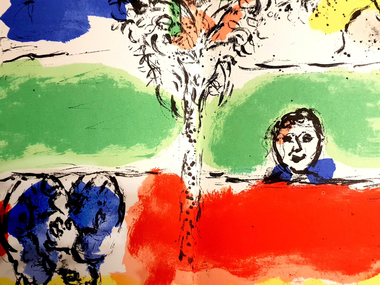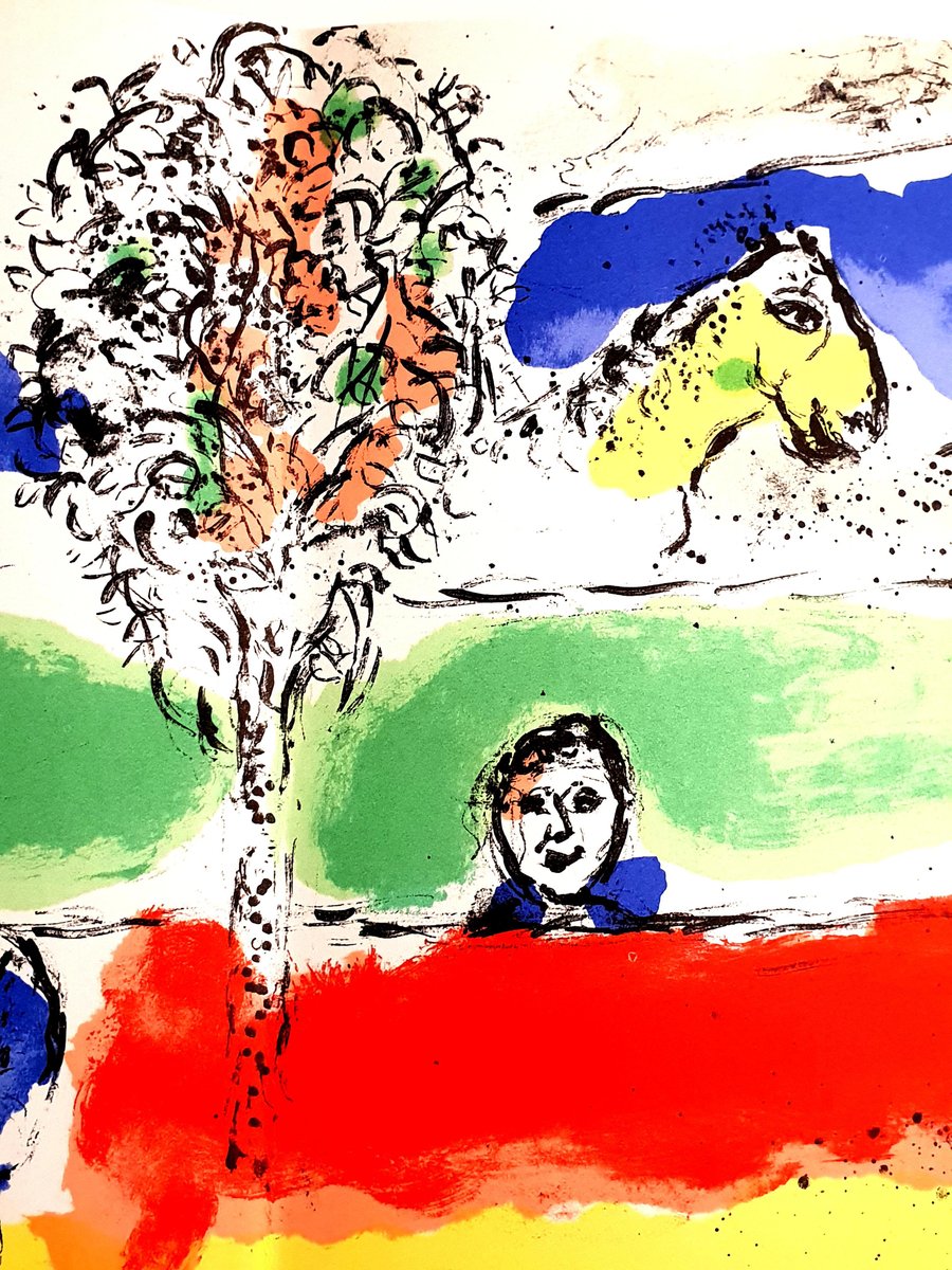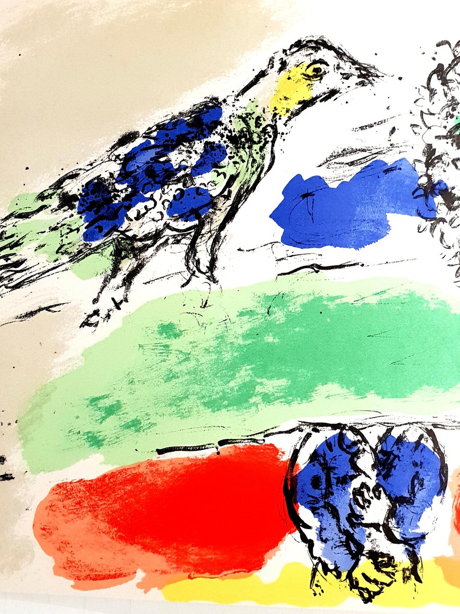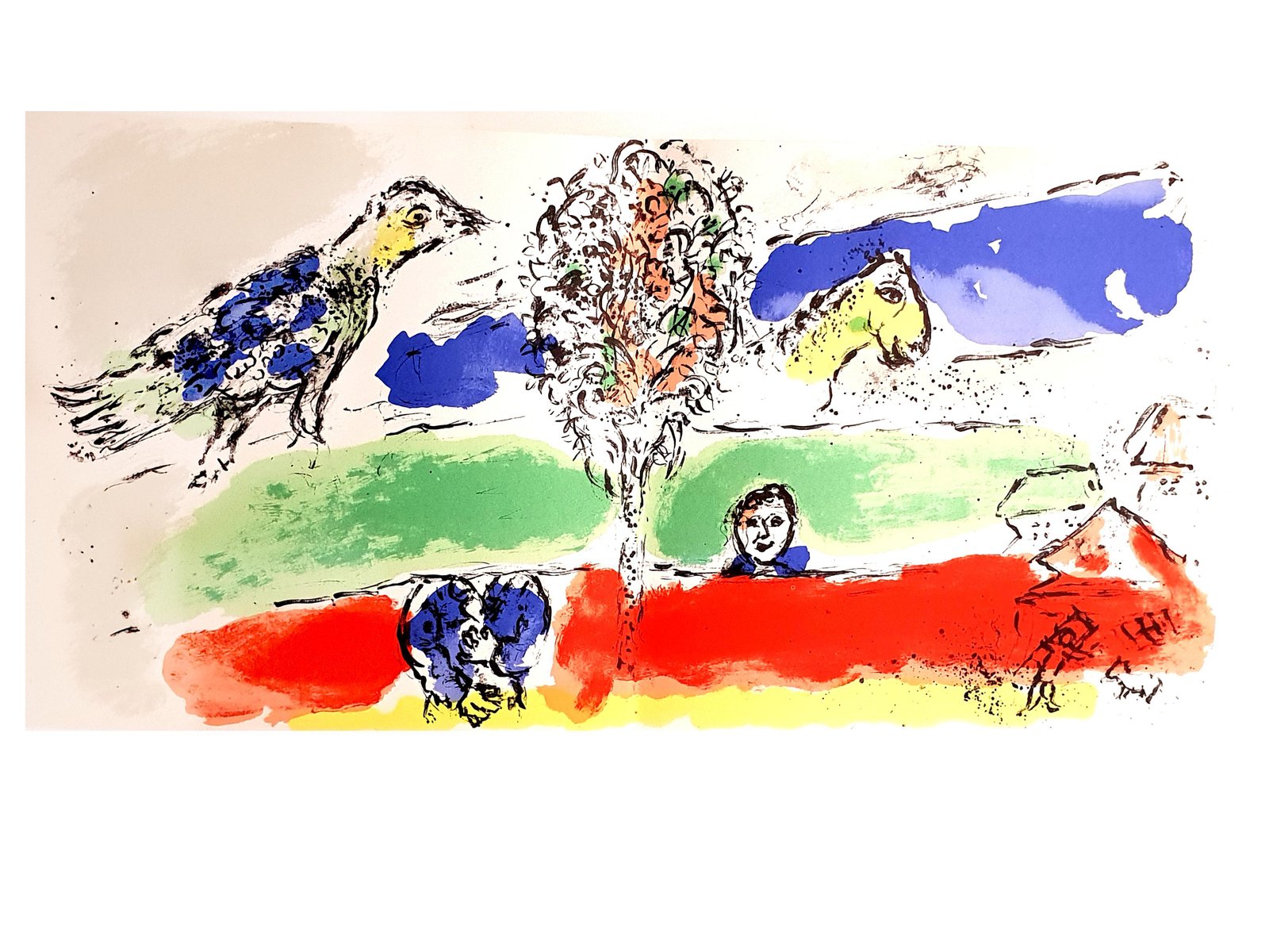 Marc Chagall Original Lithograph Double-page spread from the 1974 book ''Chagall'' by André Pieyre de Mandiargues. Unsigned, edition of approximately 10,000 Published by Maeght 1974 Dimensions: 55,3 x 27,7 cm Condition : Excellent Reference: Mourlot n° 728, Cramer n° 95 Marc Chagall (born in 1887) Marc Chagall was born in Belarus in 1887 and developed an early interest in art. After studying painting, in 1907 he left Russia for Paris, where he lived in an artist colony on the city’s outskirts. Fusing his own personal, dreamlike imagery with hints of the fauvism and cubism popular in France at the time, Chagall created his most lasting work—including I and the Village (1911)—some of which would be featured in the Salon des Indépendants exhibitions. After returning to Vitebsk for a visit in 1914, the outbreak of WWI trapped Chagall in Russia. He returned to France in 1923 but was forced to flee the country and Nazi persecution during WWII. Finding asylum in the U.S., Chagall became involved in set and costume design before returning to France in 1948. In his later years, he experimented with new art forms and was commissioned to produce numerous large-scale works. Chagall died in St.-Paul-de-Vence in 1985. The Village Marc Chagall was born in a small Hassidic community on the outskirts of Vitebsk, Belarus, on July 7, 1887. His father was a fishmonger, and his mother ran a small sundries shop in the village. As a child, Chagall attended the Jewish elementary school, where he studied Hebrew and the Bible, before later attending the Russian public school. He began to learn the fundamentals of drawing during this time, but perhaps more importantly, he absorbed the world around him, storing away the imagery and themes that would feature largely in most of his later work. At age 19 Chagall enrolled at a private, all-Jewish art school and began his formal education in painting, studying briefly with portrait artist Yehuda Pen. However, he left the school after several months, moving to St. Petersburg in 1907 to study at the Imperial Society for the Protection of Fine Arts. The following year, he enrolled at the Svanseva School, studying with set designer Léon Bakst, whose work had been featured in Sergei Diaghilev's Ballets Russes. This early experience would prove important to Chagall’s later career as well. Despite this formal instruction, and the widespread popularity of realism in Russia at the time, Chagall was already establishing his own personal style, which featured a more dreamlike unreality and the people, places and imagery that were close to his heart. Some examples from this period are his Window Vitebsk (1908) and My Fianceé with Black Gloves (1909), which pictured Bella Rosenfeld, to whom he had recently become engaged. The Beehive Despite his romance with Bella, in 1911 an allowance from Russian parliament member and art patron Maxim Binaver enabled Chagall to move to Paris, France. After settling briefly in the Montparnasse neighborhood, Chagall moved further afield to an artist colony known as La Ruche (“The Beehive”), where he began to work side by side with abstract painters such as Amedeo Modigliani and Fernand Léger as well as the avant-garde poet Guillaume Apollinaire. At their urging, and under the influence of the wildly popular fauvism and cubism, Chagall lightened his palette and pushed his style ever further from reality. I and the Village (1911) and Homage to Apollinaire (1912) are among his early Parisian works, widely considered to be his most successful and representative period. Though his work stood stylistically apart from his cubist contemporaries, from 1912 to 1914 Chagall exhibited several paintings at the annual Salon des Indépendants exhibition, where works by the likes of Juan Gris, Marcel Duchamp and Robert Delaunay were causing a stir in the Paris art world. Chagall’s popularity began to spread beyond La Ruche, and in May 1914 he traveled to Berlin to help organize his first solo exhibition, at Der Sturm Gallery. Chagall remained in the city until the highly acclaimed show opened that June. He then returned to Vitebsk, unaware of the fateful events to come. War, Peace and Revolution In August 1914 the outbreak of World War I precluded Chagall’s plans to return to Paris. The conflict did little to stem the flow of his creative output, however, instead merely giving him direct access to the childhood scenes so essential to his work, as seen in paintings such as Jew in Green (1914) and Over Vitebsk (1914). His paintings from this period also occasionally featured images of the war’s impact on the region, as with Wounded Soldier (1914) and Marching (1915). But despite the hardships of life during wartime, this would also prove to be a joyful period for Chagall. In July 1915 he married Bella, and she gave birth to a daughter, Ida, the following year. Their appearance in works such as Birthday (1915), Bella and Ida by the Window (1917) and several of his “Lovers” paintings give a glimpse of the island of domestic bliss that was Chagall’s amidst the chaos. To avoid military service and stay with his new family, Chagall took a position as a clerk in the Ministry of War Economy in St. Petersburg. While there he began work on his autobiography and also immersed himself in the local art scene, befriending novelist Boris Pasternak, among others. He also exhibited his work in the city and soon gained considerable recognition. That notoriety would prove important in the aftermath of the 1917 Russian Revolution when he was appointed as the Commissar of Fine Arts in Vitebsk. In his new post, Chagall undertook various projects in the region, including the 1919 founding of the Academy of the Arts. Despite these endeavors, differences among his colleagues eventually disillusioned Chagall. In 1920 he relinquished his position and moved his family to Moscow, the post-revolution capital of Russia. In Moscow, Chagall was soon commissioned to cr