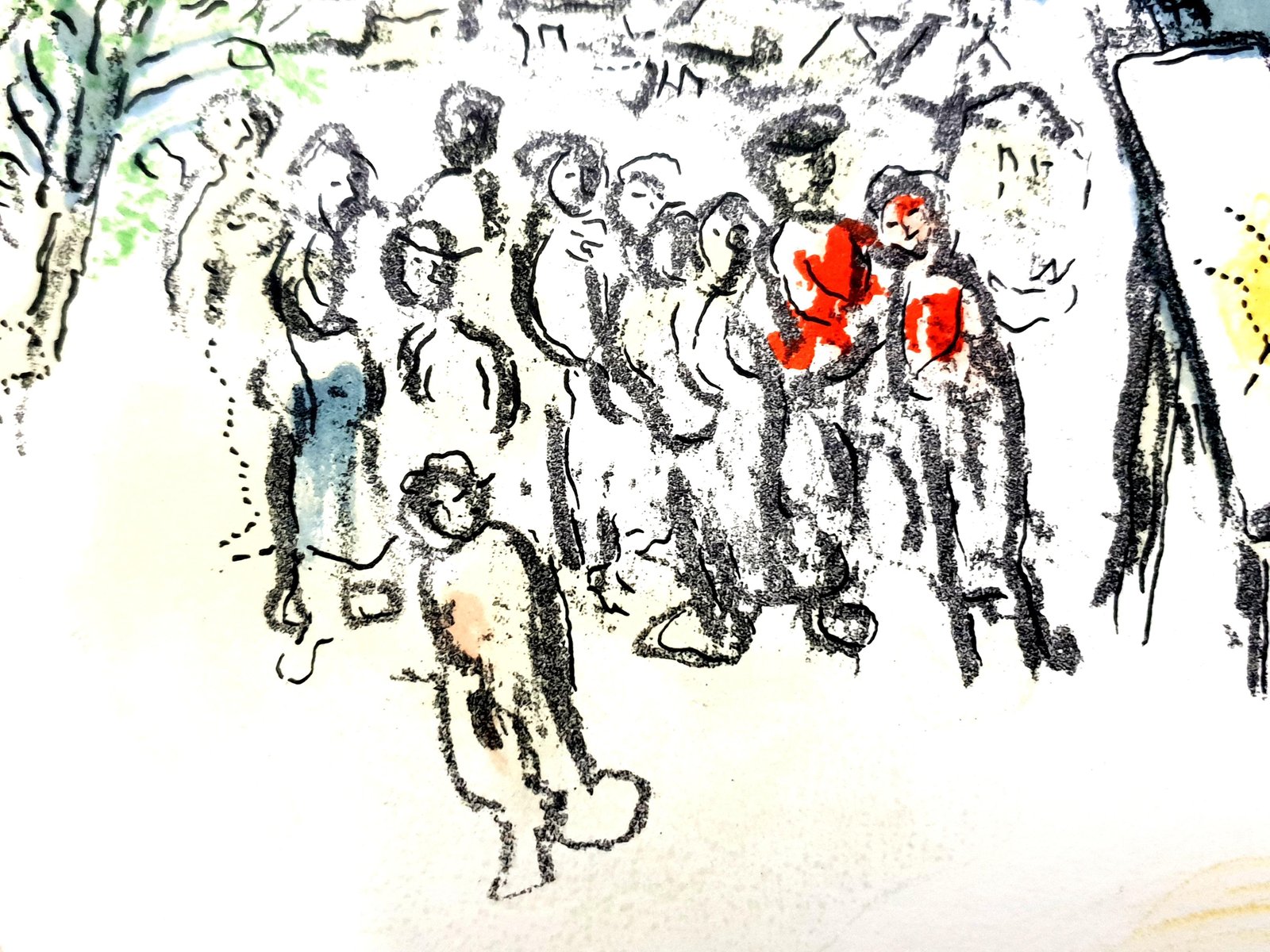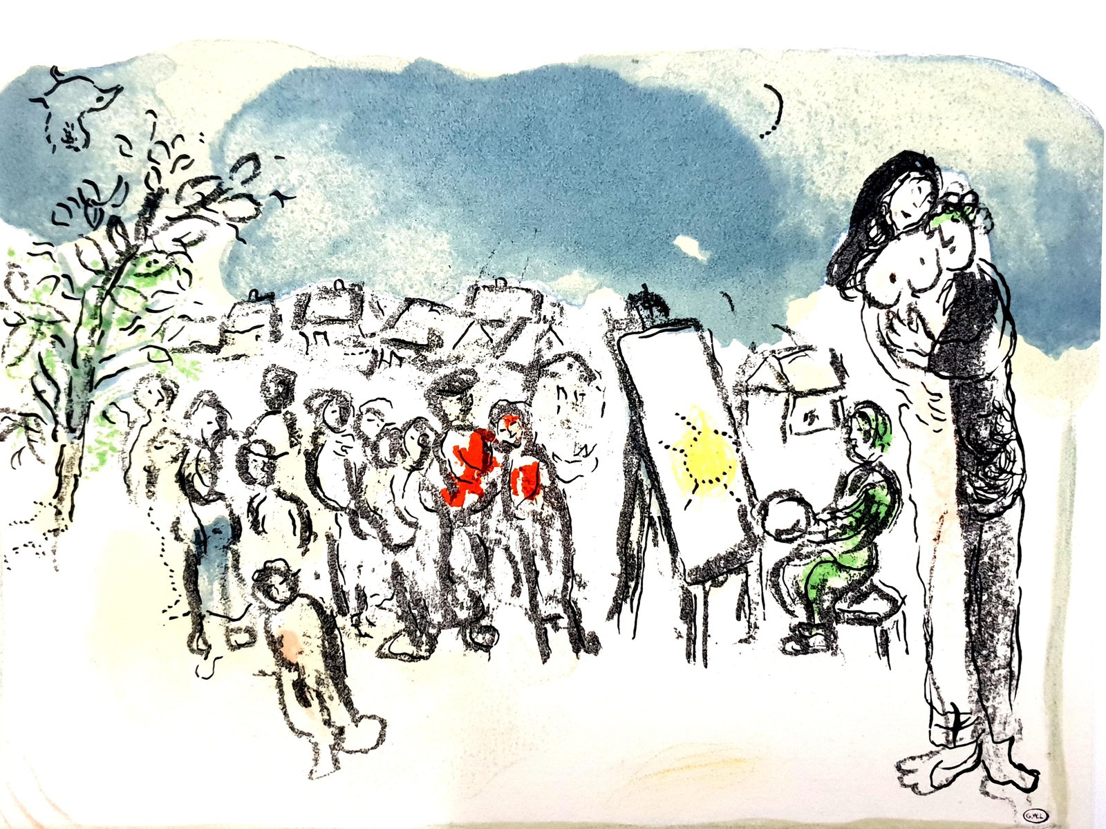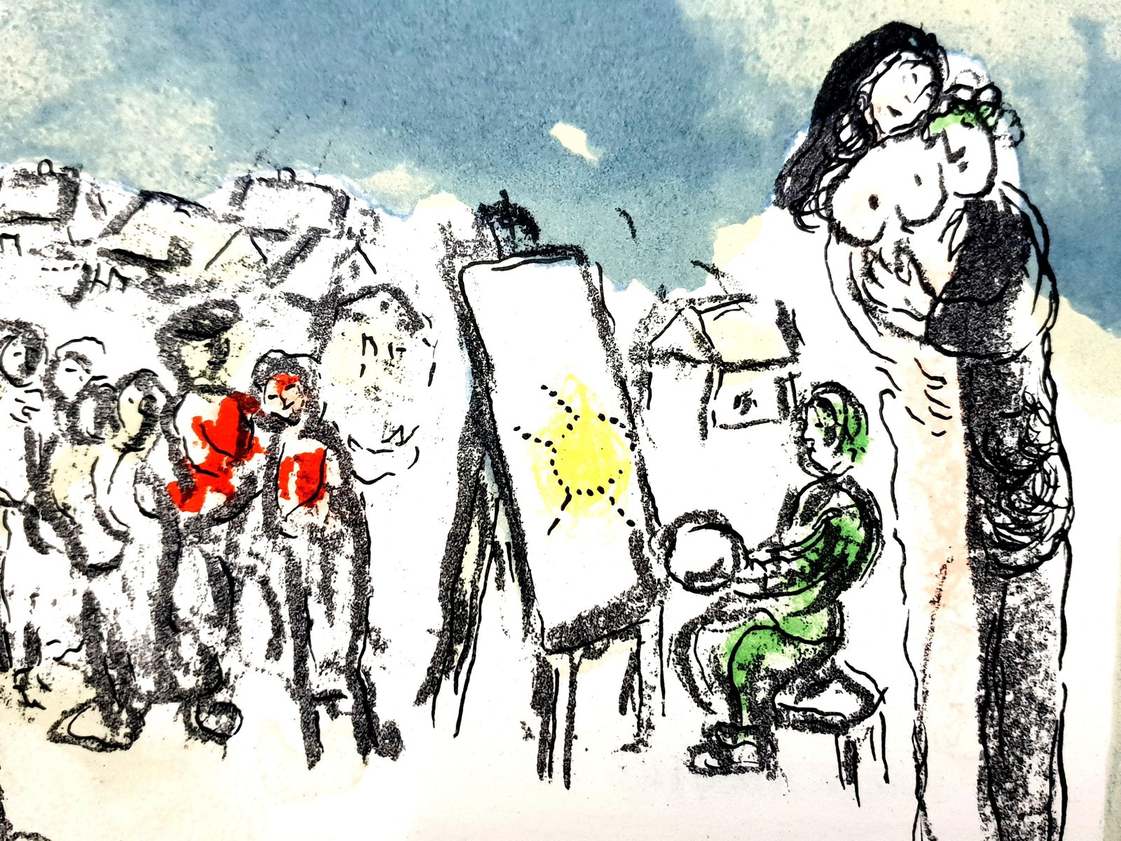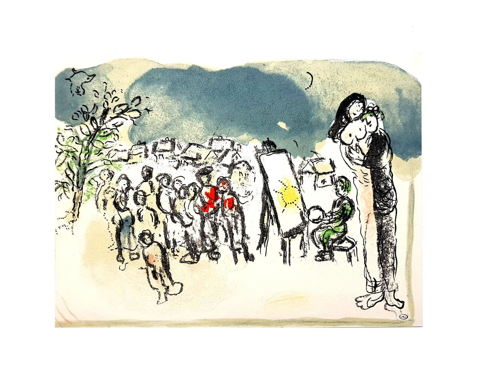 Marc Chagall - Original Lithograph Frontispiece for André Dunoyer de Segonzac, and Julien Cain. ''Humanisme Actif: Mélanges d'Art et de Littérature Offerts à Julien Cain.'' Paris: Hermann, 1968. 1968 Dimensions: 18 x 23.5 cm Reference: Mourlot 487; Cramer n°73; Monod n°6192 Provenance: Gunnar W. Lundberg, founder of L’Institut Tessin in Paris, with his stamp lower right (Lugt 4679) Condition : Excellent Marc Chagall (born in 1887) Marc Chagall was born in Belarus in 1887 and developed an early interest in art. After studying painting, in 1907 he left Russia for Paris, where he lived in an artist colony on the city’s outskirts. Fusing his own personal, dreamlike imagery with hints of the fauvism and cubism popular in France at the time, Chagall created his most lasting work—including I and the Village (1911)—some of which would be featured in the Salon des Indépendants exhibitions. After returning to Vitebsk for a visit in 1914, the outbreak of WWI trapped Chagall in Russia. He returned to France in 1923 but was forced to flee the country and Nazi persecution during WWII. Finding asylum in the U.S., Chagall became involved in set and costume design before returning to France in 1948. In his later years, he experimented with new art forms and was commissioned to produce numerous large-scale works. Chagall died in St.-Paul-de-Vence in 1985. The Village Marc Chagall was born in a small Hassidic community on the outskirts of Vitebsk, Belarus, on July 7, 1887. His father was a fishmonger, and his mother ran a small sundries shop in the village. As a child, Chagall attended the Jewish elementary school, where he studied Hebrew and the Bible, before later attending the Russian public school. He began to learn the fundamentals of drawing during this time, but perhaps more importantly, he absorbed the world around him, storing away the imagery and themes that would feature largely in most of his later work. At age 19 Chagall enrolled at a private, all-Jewish art school and began his formal education in painting, studying briefly with portrait artist Yehuda Pen. However, he left the school after several months, moving to St. Petersburg in 1907 to study at the Imperial Society for the Protection of Fine Arts. The following year, he enrolled at the Svanseva School, studying with set designer Léon Bakst, whose work had been featured in Sergei Diaghilev's Ballets Russes. This early experience would prove important to Chagall’s later career as well. Despite this formal instruction, and the widespread popularity of realism in Russia at the time, Chagall was already establishing his own personal style, which featured a more dreamlike unreality and the people, places and imagery that were close to his heart. Some examples from this period are his Window Vitebsk (1908) and My Fianceé with Black Gloves (1909), which pictured Bella Rosenfeld, to whom he had recently become engaged. The Beehive Despite his romance with Bella, in 1911 an allowance from Russian parliament member and art patron Maxim Binaver enabled Chagall to move to Paris, France. After settling briefly in the Montparnasse neighborhood, Chagall moved further afield to an artist colony known as La Ruche (“The Beehive”), where he began to work side by side with abstract painters such as Amedeo Modigliani and Fernand Léger as well as the avant-garde poet Guillaume Apollinaire. At their urging, and under the influence of the wildly popular fauvism and cubism, Chagall lightened his palette and pushed his style ever further from reality. I and the Village (1911) and Homage to Apollinaire (1912) are among his early Parisian works, widely considered to be his most successful and representative period. Though his work stood stylistically apart from his cubist contemporaries, from 1912 to 1914 Chagall exhibited several paintings at the annual Salon des Indépendants exhibition, where works by the likes of Juan Gris, Marcel Duchamp and Robert Delaunay were causing a stir in the Paris art world. Chagall’s popularity began to spread beyond La Ruche, and in May 1914 he traveled to Berlin to help organize his first solo exhibition, at Der Sturm Gallery. Chagall remained in the city until the highly acclaimed show opened that June. He then returned to Vitebsk, unaware of the fateful events to come. War, Peace and Revolution In August 1914 the outbreak of World War I precluded Chagall’s plans to return to Paris. The conflict did little to stem the flow of his creative output, however, instead merely giving him direct access to the childhood scenes so essential to his work, as seen in paintings such as Jew in Green (1914) and Over Vitebsk (1914). His paintings from this period also occasionally featured images of the war’s impact on the region, as with Wounded Soldier (1914) and Marching (1915). But despite the hardships of life during wartime, this would also prove to be a joyful period for Chagall. In July 1915 he married Bella, and she gave birth to a daughter, Ida, the following year. Their appearance in works such as Birthday (1915), Bella and Ida by the Window (1917) and several of his “Lovers” paintings give a glimpse of the island of domestic bliss that was Chagall’s amidst the chaos. To avoid military service and stay with his new family, Chagall took a position as a clerk in the Ministry of War Economy in St. Petersburg. While there he began work on his autobiography and also immersed himself in the local art scene, befriending novelist Boris Pasternak, among others. He also exhibited his work in the city and soon gained considerable recognition. That notoriety would prove important in the aftermath of the 1917 Russian Revolution when he was appointed as the Commissar of Fine Arts in Vitebsk. In his new post, Chagall undertook various projects in the region, including the 1919 founding of the Academy of the Arts. Despite these endeavors, differences among his colleagues eventually disillusioned Chagall. In 1920 he re