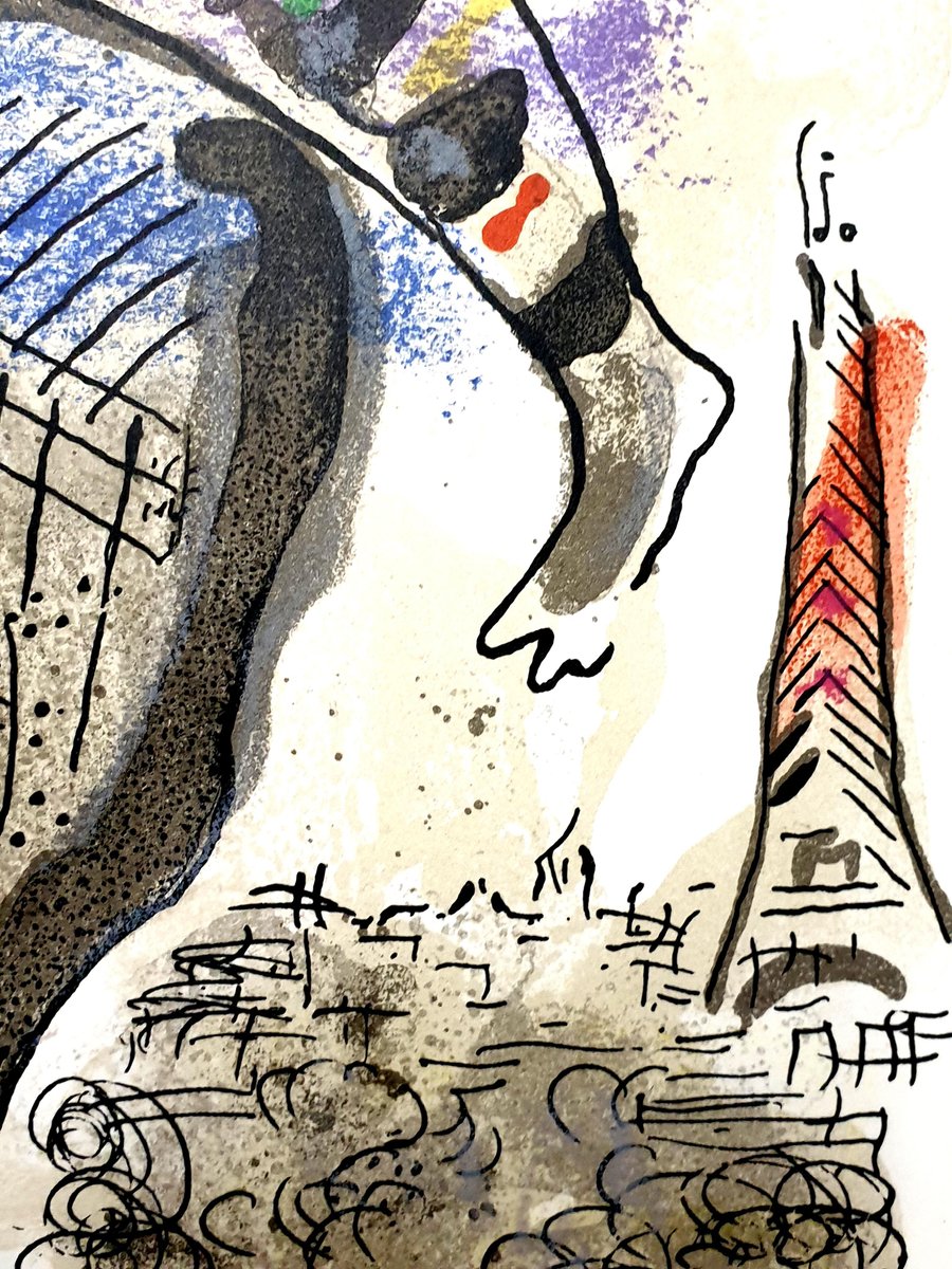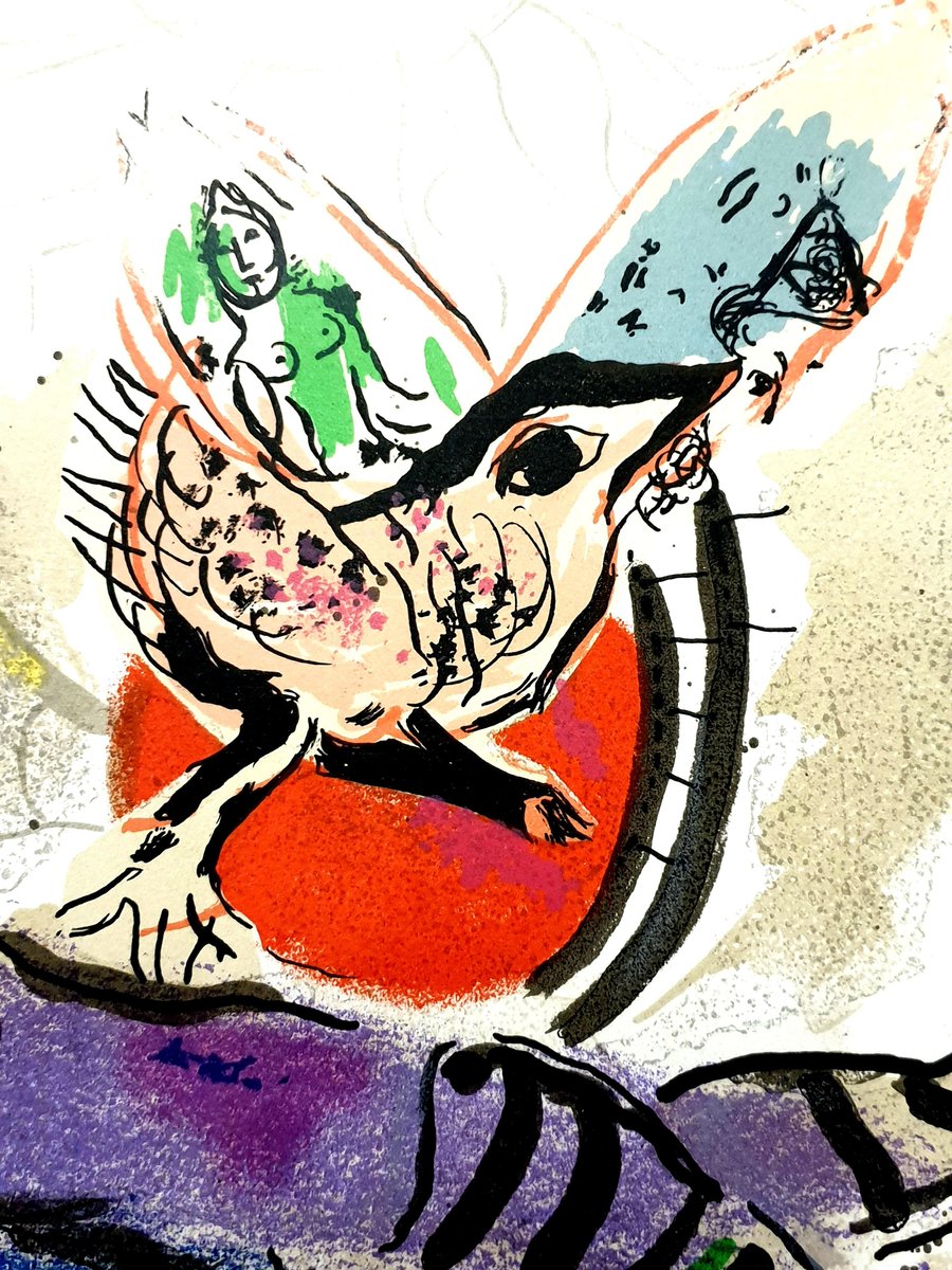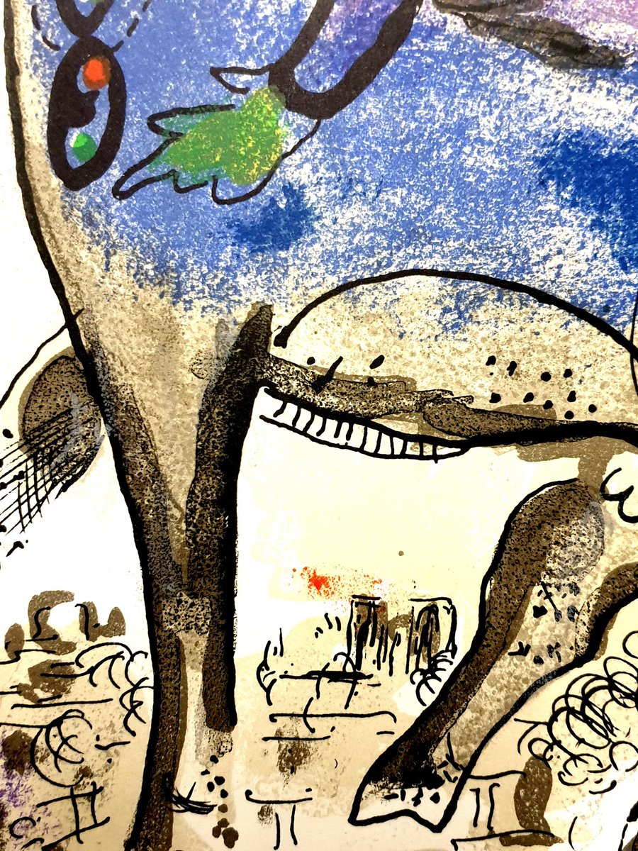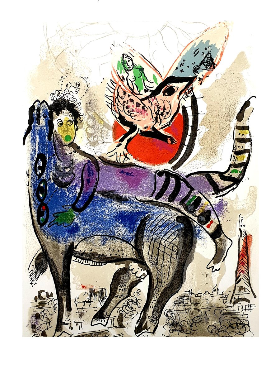Marc Chagall - Original Lithograph La Vache Bleue (The Blue Cow) From the unsigned, unnumbered lithograph printed in the literary review XXe Siecle 1967 See Mourlot 488 Dimensions: 32 x 24 cm Publisher: G. di San Lazzaro. Marc Chagall (born in 1887) Marc Chagall was born in Belarus in 1887 and developed an early interest in art. After studying painting, in 1907 he left Russia for Paris, where he lived in an artist colony on the city’s outskirts. Fusing his own personal, dreamlike imagery with hints of the fauvism and cubism popular in France at the time, Chagall created his most lasting work—including I and the Village (1911)—some of which would be featured in the Salon des Indépendants exhibitions. After returning to Vitebsk for a visit in 1914, the outbreak of WWI trapped Chagall in Russia. He returned to France in 1923 but was forced to flee the country and Nazi persecution during WWII. Finding asylum in the U.S., Chagall became involved in set and costume design before returning to France in 1948. In his later years, he experimented with new art forms and was commissioned to produce numerous large-scale works. Chagall died in St.-Paul-de-Vence in 1985. The Village Marc Chagall was born in a small Hassidic community on the outskirts of Vitebsk, Belarus, on July 7, 1887. His father was a fishmonger, and his mother ran a small sundries shop in the village. As a child, Chagall attended the Jewish elementary school, where he studied Hebrew and the Bible, before later attending the Russian public school. He began to learn the fundamentals of drawing during this time, but perhaps more importantly, he absorbed the world around him, storing away the imagery and themes that would feature largely in most of his later work. At age 19 Chagall enrolled at a private, all-Jewish art school and began his formal education in painting, studying briefly with portrait artist Yehuda Pen. However, he left the school after several months, moving to St. Petersburg in 1907 to study at the Imperial Society for the Protection of Fine Arts. The following year, he enrolled at the Svanseva School, studying with set designer Léon Bakst, whose work had been featured in Sergei Diaghilev's Ballets Russes. This early experience would prove important to Chagall’s later career as well. Despite this formal instruction, and the widespread popularity of realism in Russia at the time, Chagall was already establishing his own personal style, which featured a more dreamlike unreality and the people, places and imagery that were close to his heart. Some examples from this period are his Window Vitebsk (1908) and My Fianceé with Black Gloves (1909), which pictured Bella Rosenfeld, to whom he had recently become engaged. The Beehive Despite his romance with Bella, in 1911 an allowance from Russian parliament member and art patron Maxim Binaver enabled Chagall to move to Paris, France. After settling briefly in the Montparnasse neighborhood, Chagall moved further afield to an artist colony known as La Ruche (“The Beehive”), where he began to work side by side with abstract painters such as Amedeo Modigliani and Fernand Léger as well as the avant-garde poet Guillaume Apollinaire. At their urging, and under the influence of the wildly popular fauvism and cubism, Chagall lightened his palette and pushed his style ever further from reality. I and the Village (1911) and Homage to Apollinaire (1912) are among his early Parisian works, widely considered to be his most successful and representative period. Though his work stood stylistically apart from his cubist contemporaries, from 1912 to 1914 Chagall exhibited several paintings at the annual Salon des Indépendants exhibition, where works by the likes of Juan Gris, Marcel Duchamp and Robert Delaunay were causing a stir in the Paris art world. Chagall’s popularity began to spread beyond La Ruche, and in May 1914 he traveled to Berlin to help organize his first solo exhibition, at Der Sturm Gallery. Chagall remained in the city until the highly acclaimed show opened that June. He then returned to Vitebsk, unaware of the fateful events to come. War, Peace and Revolution In August 1914 the outbreak of World War I precluded Chagall’s plans to return to Paris. The conflict did little to stem the flow of his creative output, however, instead merely giving him direct access to the childhood scenes so essential to his work, as seen in paintings such as Jew in Green (1914) and Over Vitebsk (1914). His paintings from this period also occasionally featured images of the war’s impact on the region, as with Wounded Soldier (1914) and Marching (1915). But despite the hardships of life during wartime, this would also prove to be a joyful period for Chagall. In July 1915 he married Bella, and she gave birth to a daughter, Ida, the following year. Their appearance in works such as Birthday (1915), Bella and Ida by the Window (1917) and several of his “Lovers” paintings give a glimpse of the island of domestic bliss that was Chagall’s amidst the chaos. To avoid military service and stay with his new family, Chagall took a position as a clerk in the Ministry of War Economy in St. Petersburg. While there he began work on his autobiography and also immersed himself in the local art scene, befriending novelist Boris Pasternak, among others. He also exhibited his work in the city and soon gained considerable recognition. That notoriety would prove important in the aftermath of the 1917 Russian Revolution when he was appointed as the Commissar of Fine Arts in Vitebsk. In his new post, Chagall undertook various projects in the region, including the 1919 founding of the Academy of the Arts. Despite these endeavors, differences among his colleagues eventually disillusioned Chagall. In 1920 he relinquished his position and moved his family to Moscow, the post-revolution capital of Russia. In Moscow, Chagall was soon commissioned to create sets and costumes for various productions at th