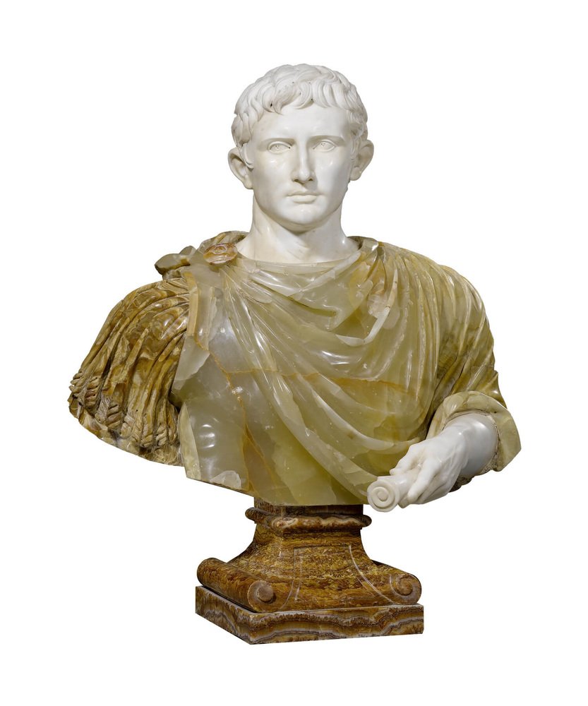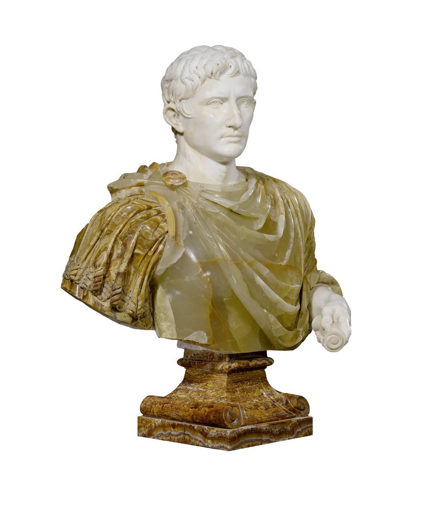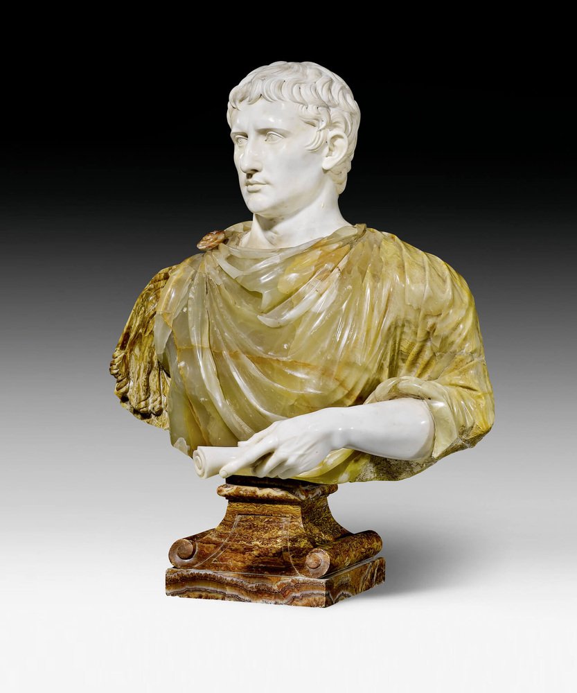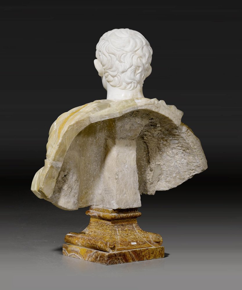 The bust belongs to the tradition of Roman decorative sculpture of the late 16th and 17th centuries, distinguished by the extensive use of polychrome marbles and onyx alabaster for imperial portraits and heroic figures destined for galleries and palaces.