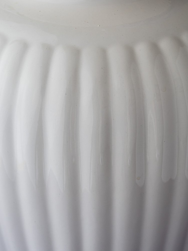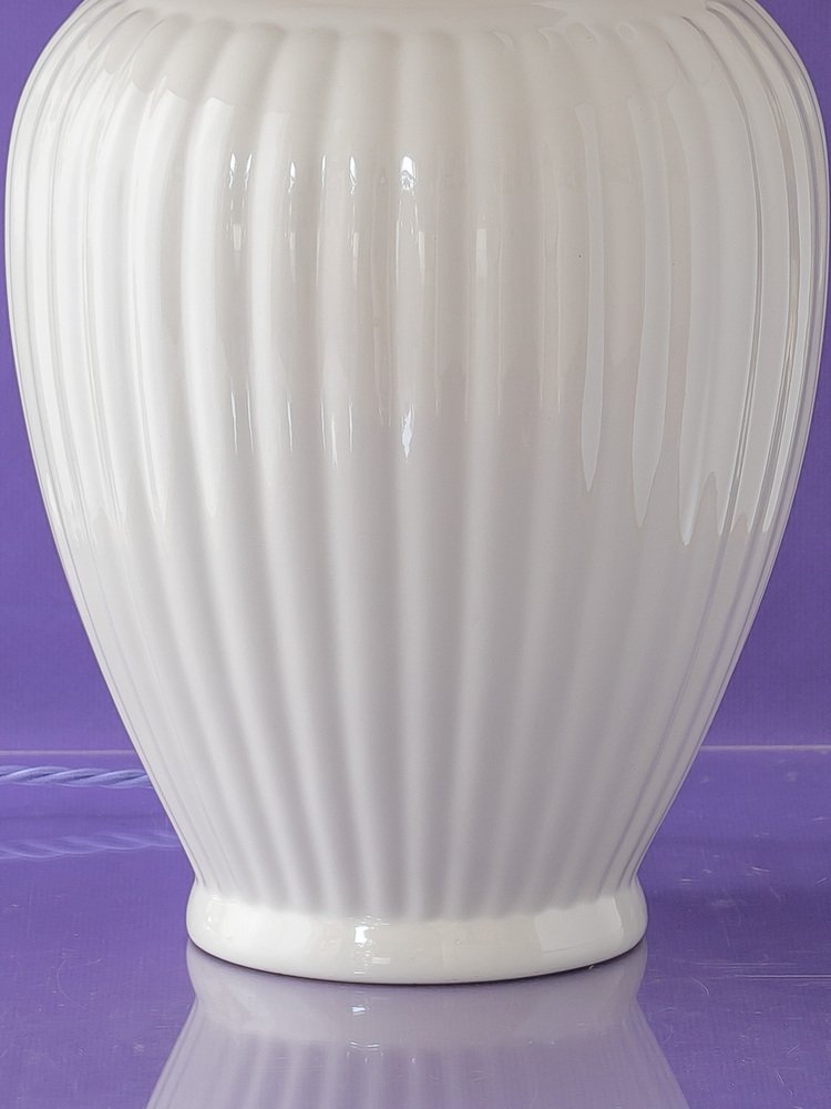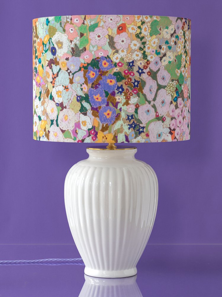 The ribbed white glazed ceramic base comes from Royal Delft’s Delft White line—introduced in the 1930s as a modern, silhouette-forward evolution of Delftware that emphasizes form, glaze, and shadow over painted decoration. It’s topped with a vibrant drum lampshade in House of Hackney’s Hollyhocks—Spring cotton-linen blend: a saturated, joyful floral riot that feels both pastoral and punchy, with an unmistakably maximalist edge.