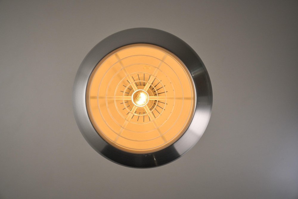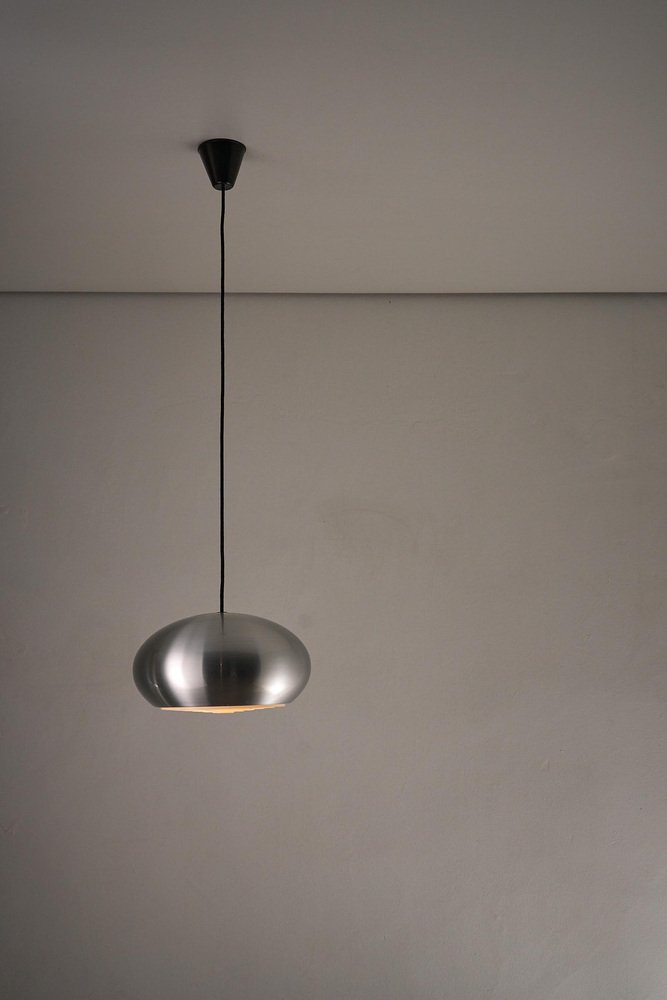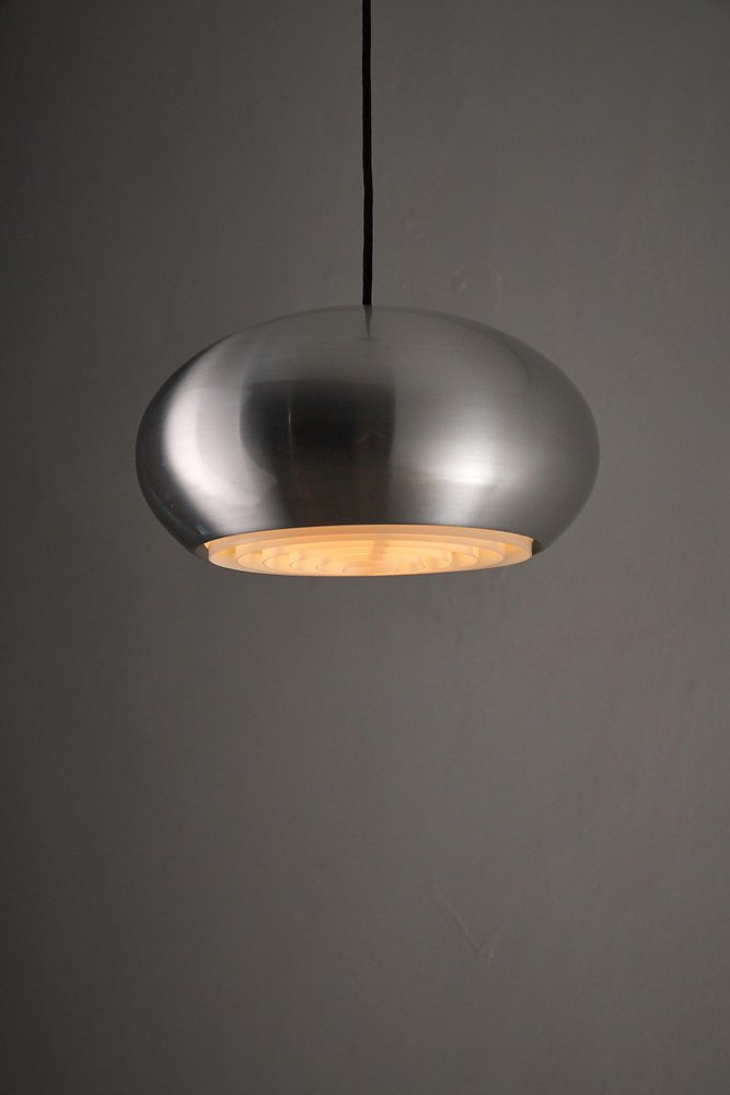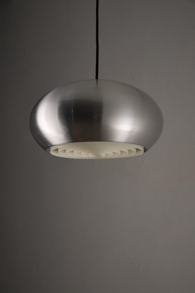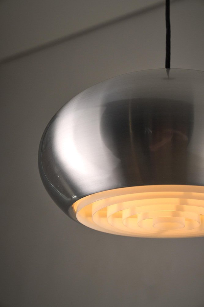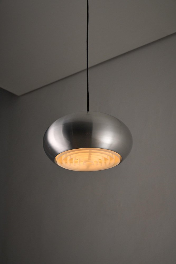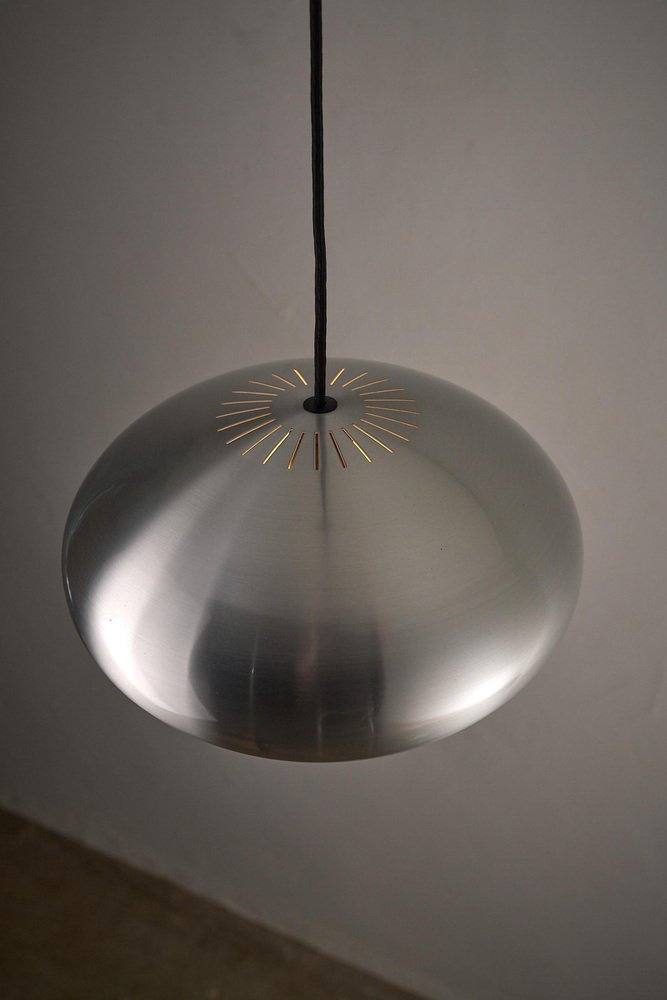 The "Medio" pendant is a classic example of Danish lighting design, created by Jo Hammerborg for Fog & Mørup in 1966. This specific piece is a rare find as it comes with its original manufacturer's box, confirming its authenticity and provenance. The lamp features a sleek, spun aluminum shade with a brushed finish. True to Hammerborg's philosophy of glare-free lighting, the bottom of the lamp is fitted with a concentric plastic louver system (diffuser) that softens the light and hides the bulb from view. Additionally, small slots at the top of the shade allow a subtle amount of light to escape, illuminating the exterior of the metal and creating a decorative "halo" effect. This piece offers direct, warm downlighting perfect for a dining table or kitchen island, while the aluminum finish adds a clean, industrial touch typical of the Space Age era.