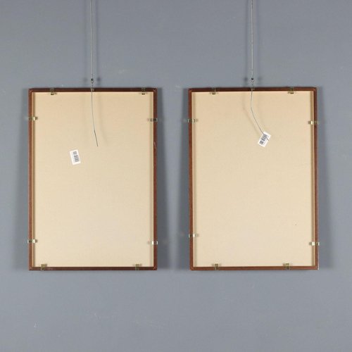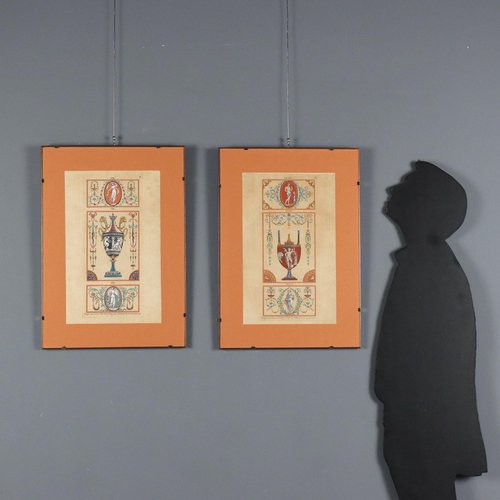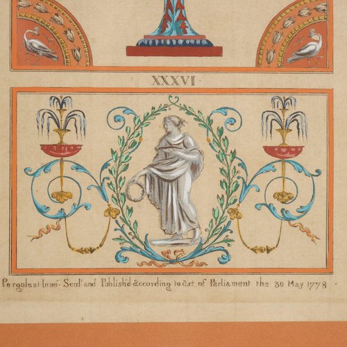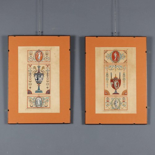 Handkolorierte Radierungen. Von Pergolesi in den Jahren 1777-1778 geschaffen; die kolorierte Dekoration ist ein posthumes Werk und stammt aus dem 19. Jahrhundert. Pergolesi entwarf und konstruierte Möbel, Kamine, Decken, Kronleuchter, Türen und Wandornamente im neoklassizistischen Stil und arbeitete vor allem in England. Die Zeichnungen für diese Radierungen sind nummeriert und gehören wahrscheinlich zu der Serie "Disegni per Vari Ornamenti per 70 Piatti", die zwischen 1777 und 1801 veröffentlicht wurde. Die beiden Radierungen sind in ausgestellten Rahmen präsentiert.
