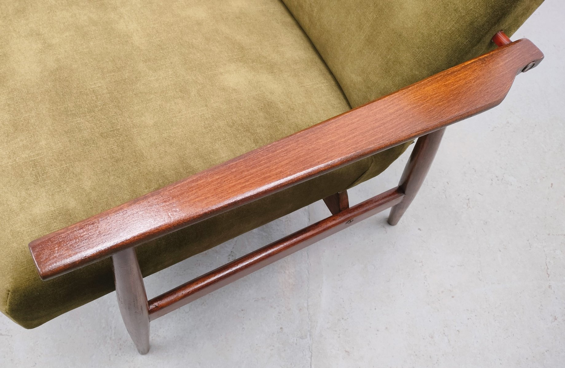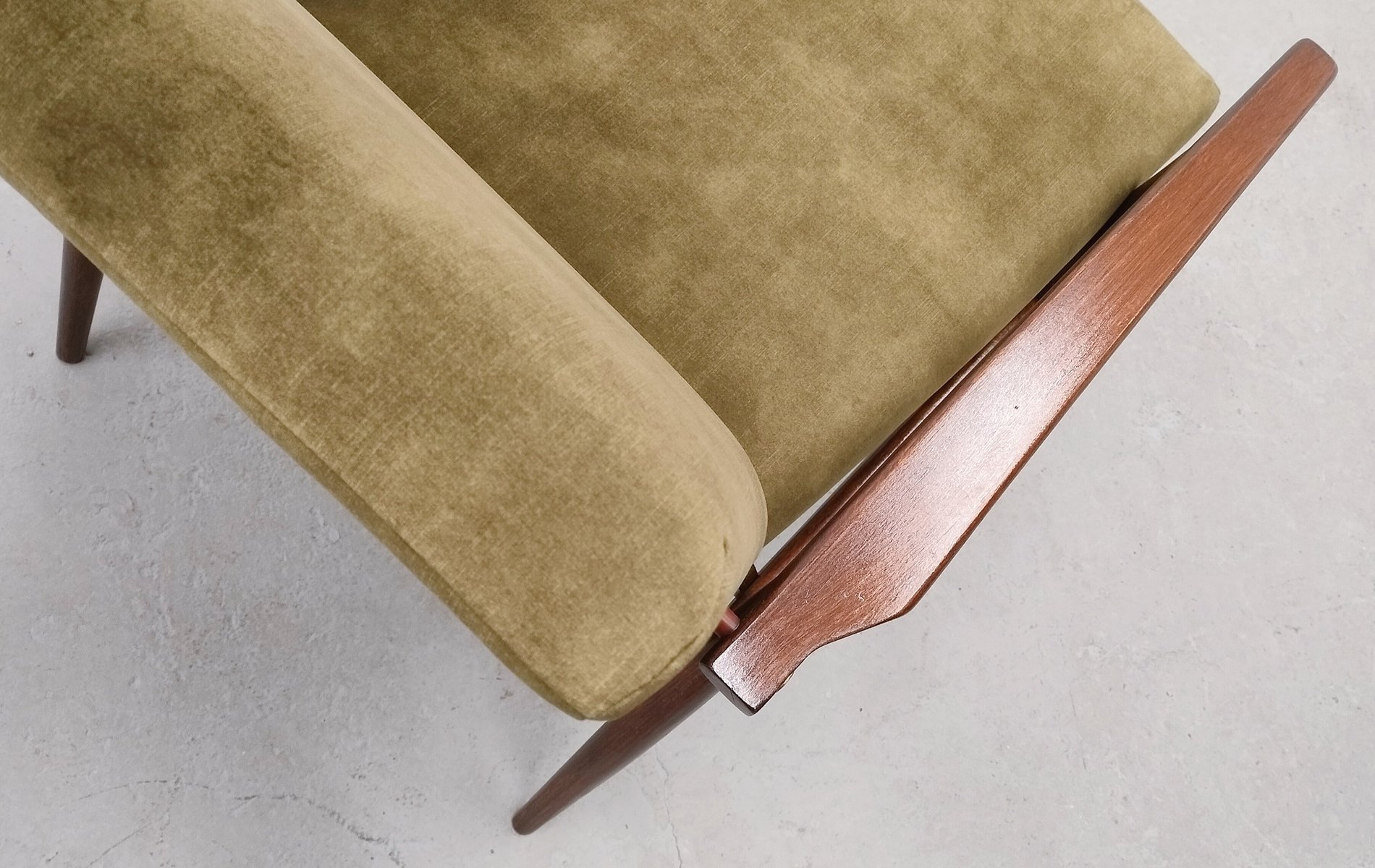 Das Gestell aus massivem Buchenholz wurde vollständig restauriert und neu lackiert, wodurch die warmen Farbtöne und die schöne Maserung besonders zur Geltung kommen. Die Sitzfläche und die Rückenlehne sind neu mit marineblauem Samt gepolstert, was dem Sessel einen modernen Touch verleiht und gleichzeitig dem ursprünglichen Design treu bleibt. Der kantige Rahmen, die sanft geschwungenen Armlehnen und die sich verjüngenden Beine machen ihn sowohl funktional als auch skulptural - perfekt als Loungesessel, Lesesessel oder als Akzentmöbel.