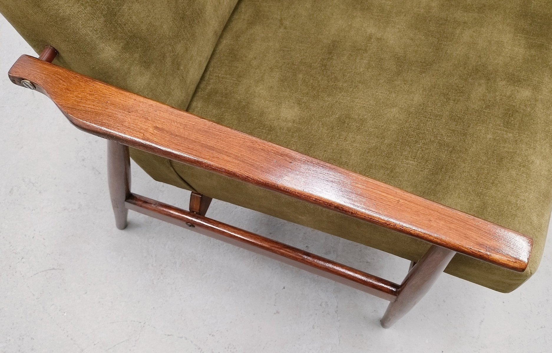 The solid beech wood frame has been fully restored and refinished, highlighting its warm tones and beautiful grain. The seat and backrest are newly upholstered in navy blue velvet, adding a contemporary touch while remaining true to the original design. Its angular frame, gently curved armrests, and tapered legs make it both functional and sculptural – perfect as a statement lounge chair, reading chair, or accent piece.