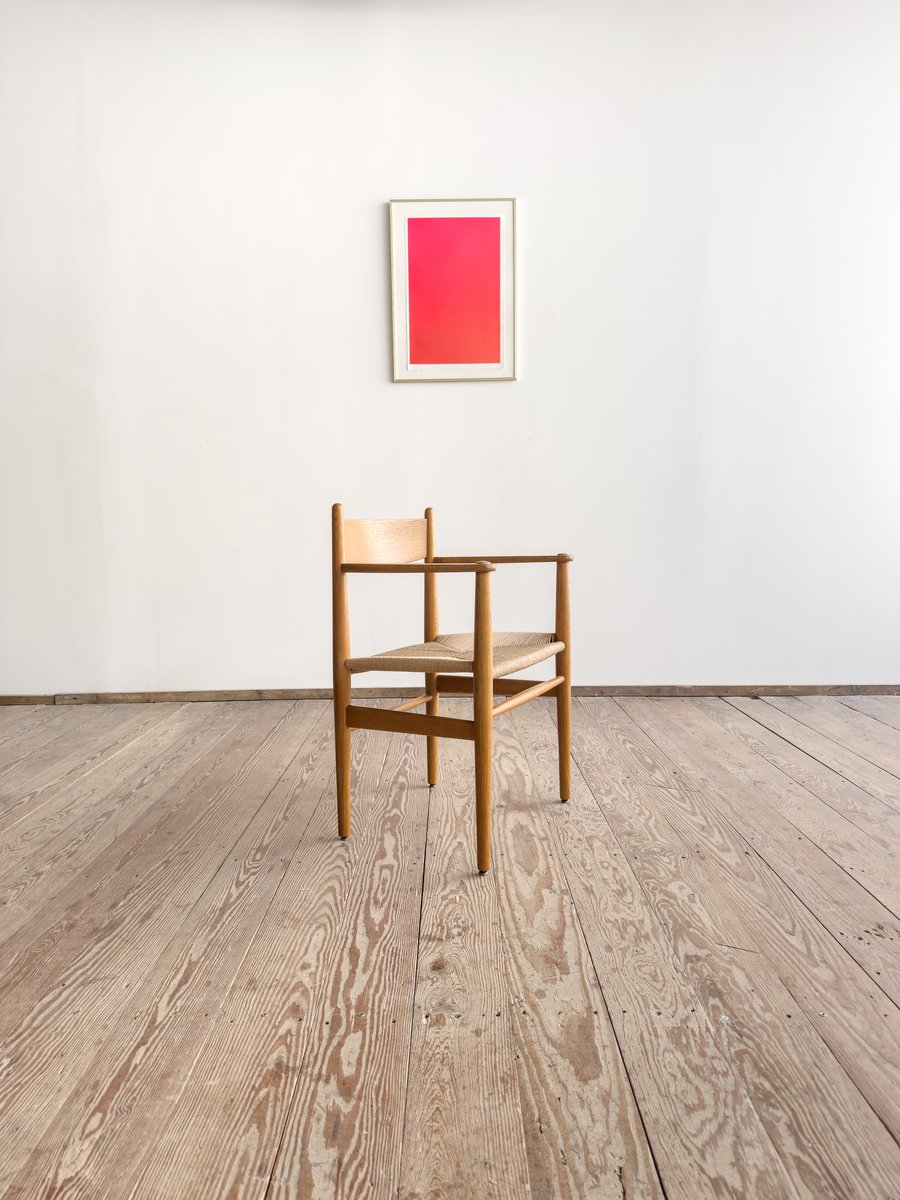 Innerhalb der ersten drei Wochen bei dem Unternehmen entwarf Wegner den CH22 Sessel, den CH23 Esszimmerstuhl, den CH24 Wishbone Stuhl und den CH25 Sessel für Carl Hansen & Søn. Diese erste Kollektion, die 1950 auf den Markt kam, machte sowohl Wegner als auch Carl Hansen & Søn international berühmt. Die mutigen skulpturalen Designs sowohl des Wishbone Stuhles als auch des CH25 Sessels brachen mit der Tradition und waren radikal für die Zeit. Wegners Verwendung von Papierkordel-Gewebe—ein während des Krieges verwendetes Ersatzmaterial— für den Sitz seines CH25 war etwas vollkommen Neues. Holgers Entscheidung, in die Arbeiten eines nahezu unbekannten Designers zu investieren, war ein großes Risiko, jedoch eines, das sich für den Hersteller auszahlen sollte.