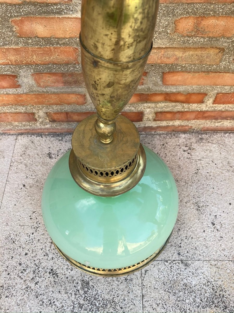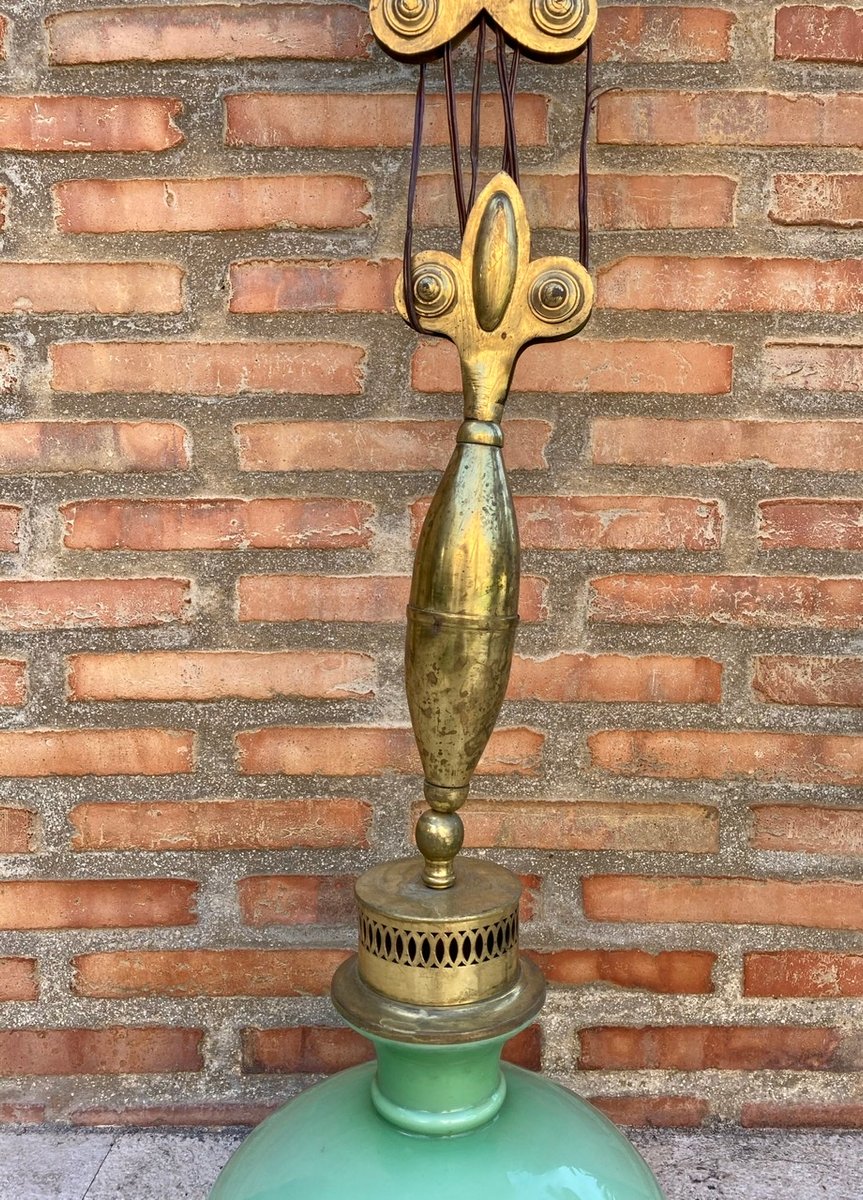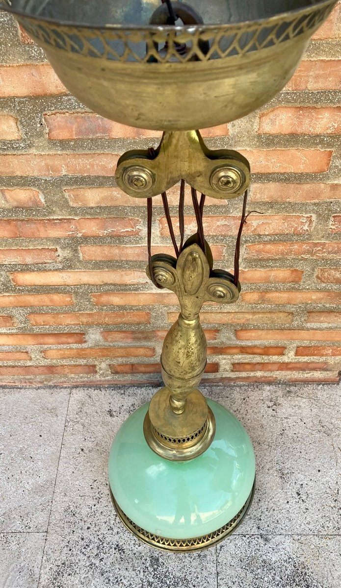 Mid-Century Flaschenzug Hängelampe mit Opalglas Kristall und Messing, 1960er