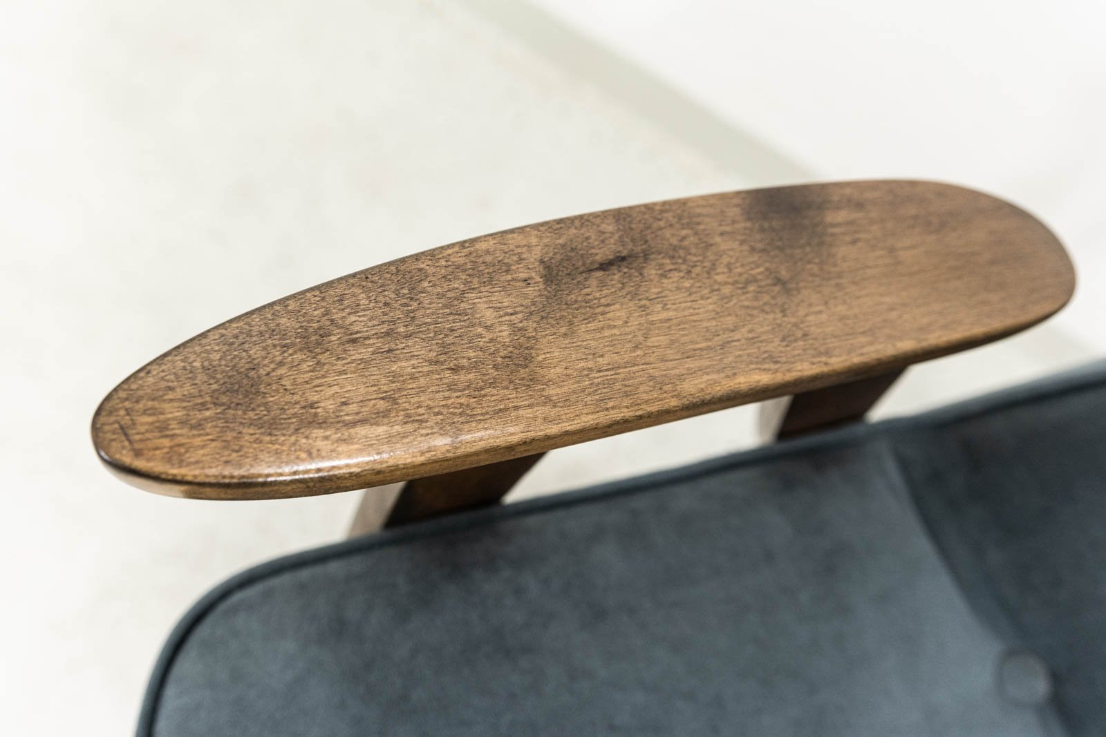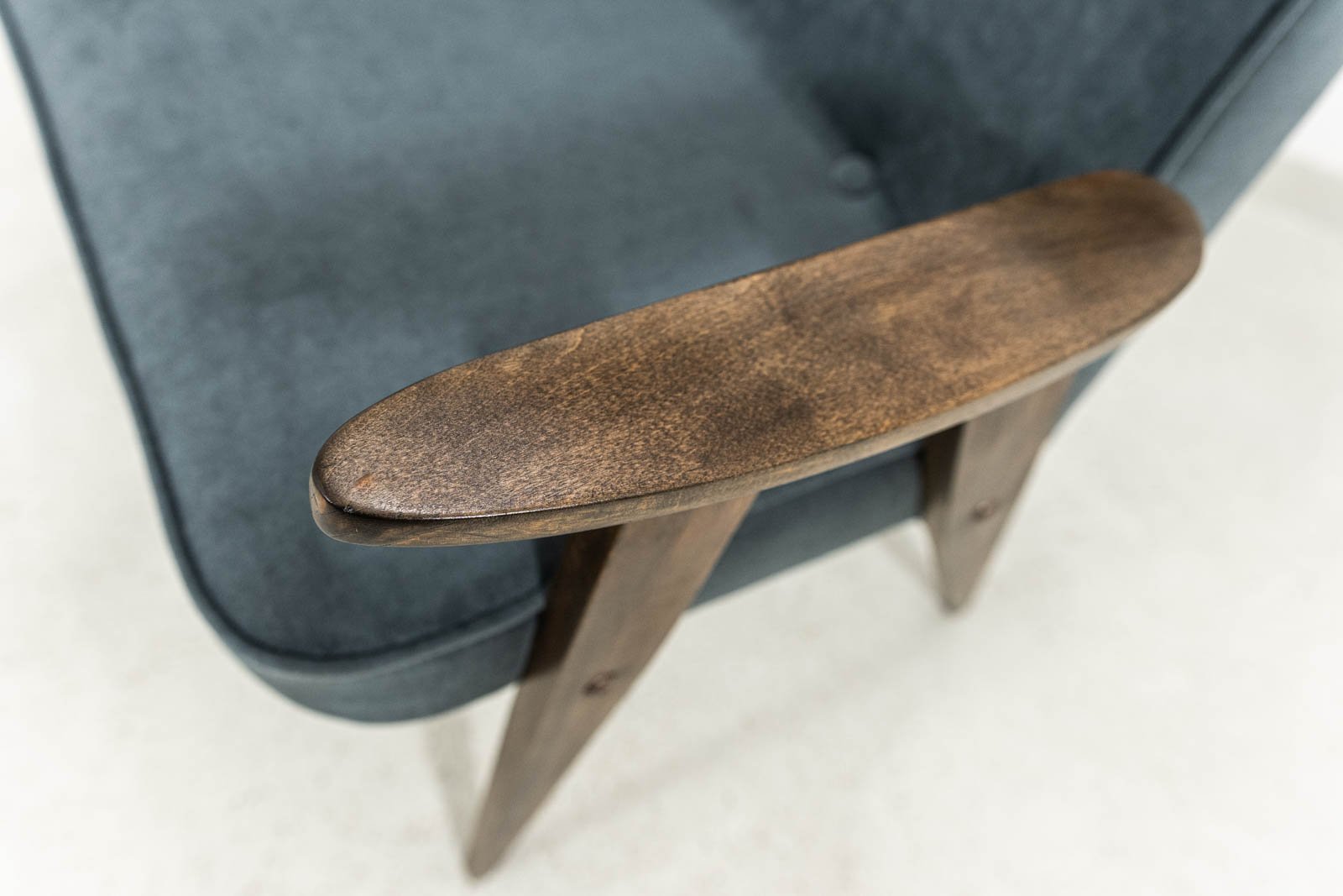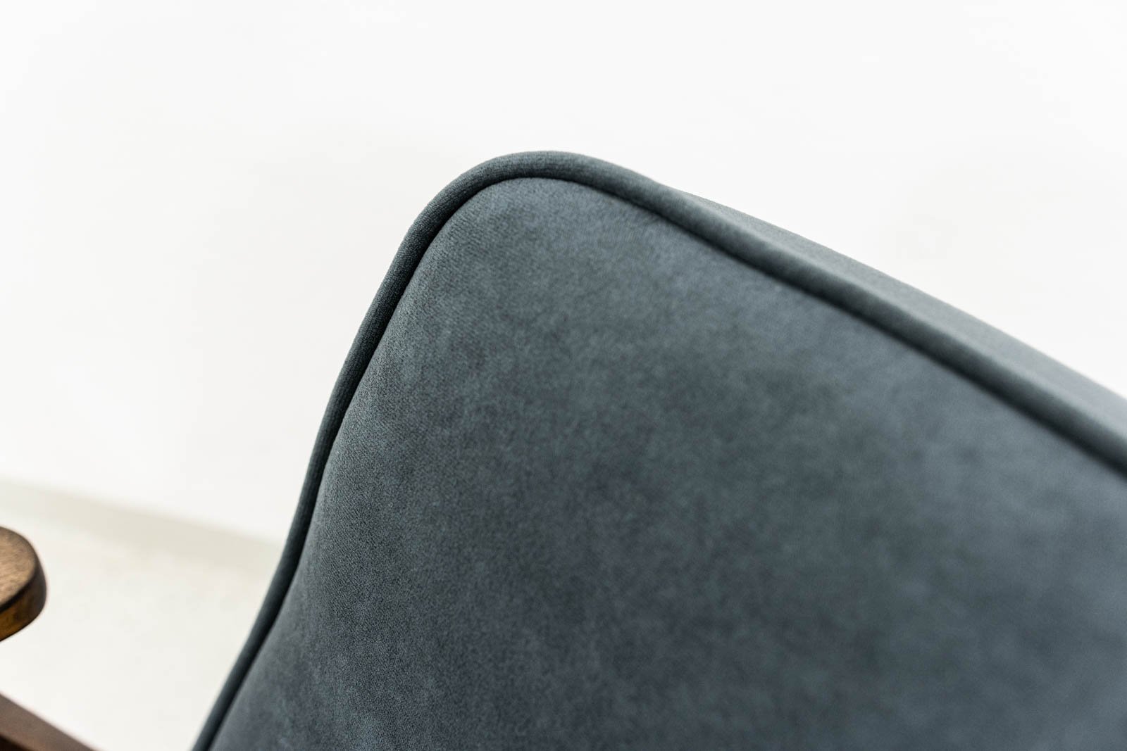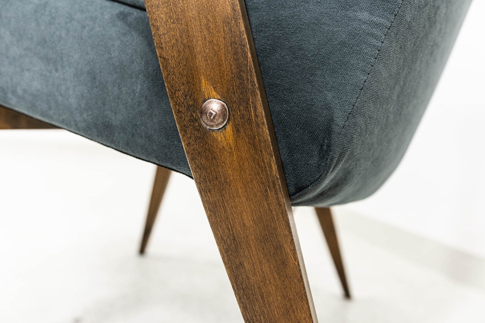 Der Sessel hat ein dunkles, kantiges Holzgestell mit charakteristischen, konisch zulaufenden Beinen. Er wurde neu mit einem dunkelgrauen Samtstoff mit weicher Struktur gepolstert.