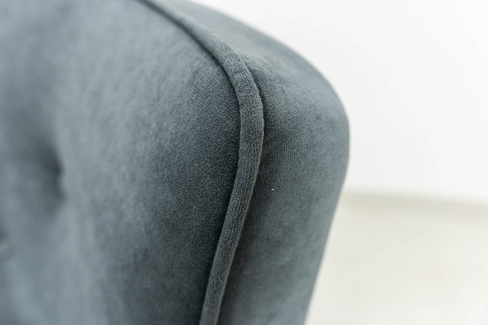 Die Paspelierung verläuft entlang der Kissenränder und unterstreicht die klassische, geometrische Form des Stuhls.