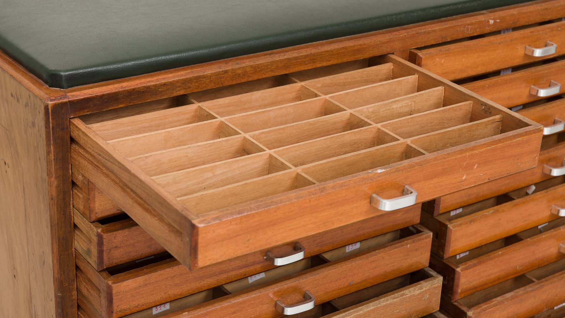 This pair of haberdashery counters was produced in oak during the 1960s. Each piece combines two functions: one side features a glass display case with sliding doors, while the other offers practical storage through multiple drawers. The glass panels are inscribed with “Companhia da Linha Coats & Clark, Lda.”, a reference to the renowned Scottish-American company founded in 1750, which opened its Portuguese factory in Vila Nova de Gaia in 1905.