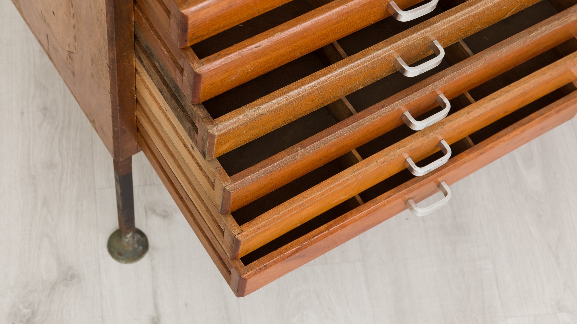 Bei diesen Theken handelt es sich um authentische Beispiele für Industriemöbel aus der Mitte des Jahrhunderts, die für den täglichen Gebrauch konzipiert wurden, aber dennoch einen einzigartigen Charakter besitzen. Der Eisenrahmen und die Beine wurden teilweise restauriert, um die Stabilität zu gewährleisten und die Patina zu erhalten.