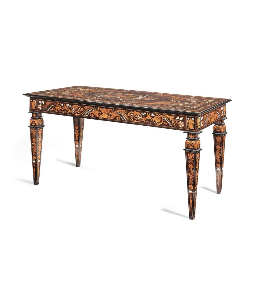 The table is in excellent condition. The rectangular top is richly inlaid with a central oval bouquet composed of roses, lily-of-the-valley, bellflowers and daffodils, issuing from acanthus-leaf cornucopiae and accompanied by further floral compositions. The whole is framed by an elegant border of scrolling acanthus leaves and flowerheads. The table stands on four square tapering legs and retains two original paper labels affixed to the underside.
